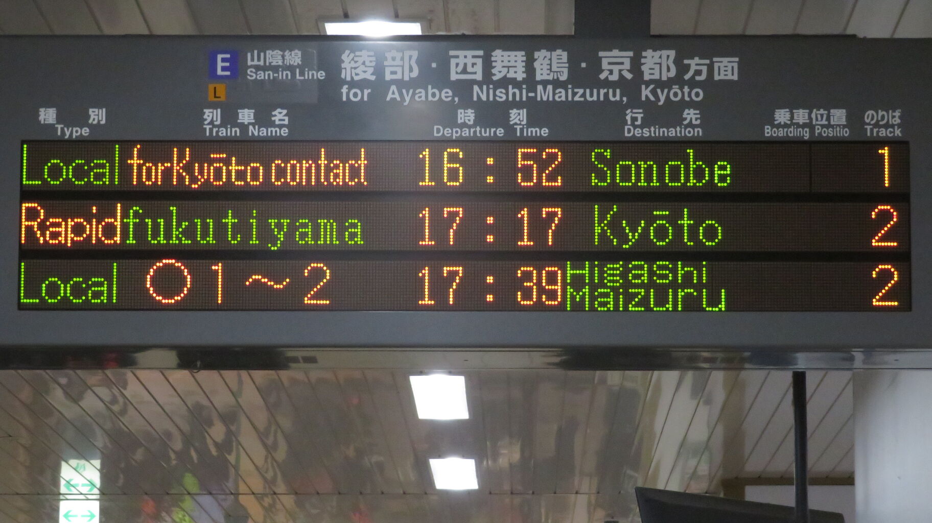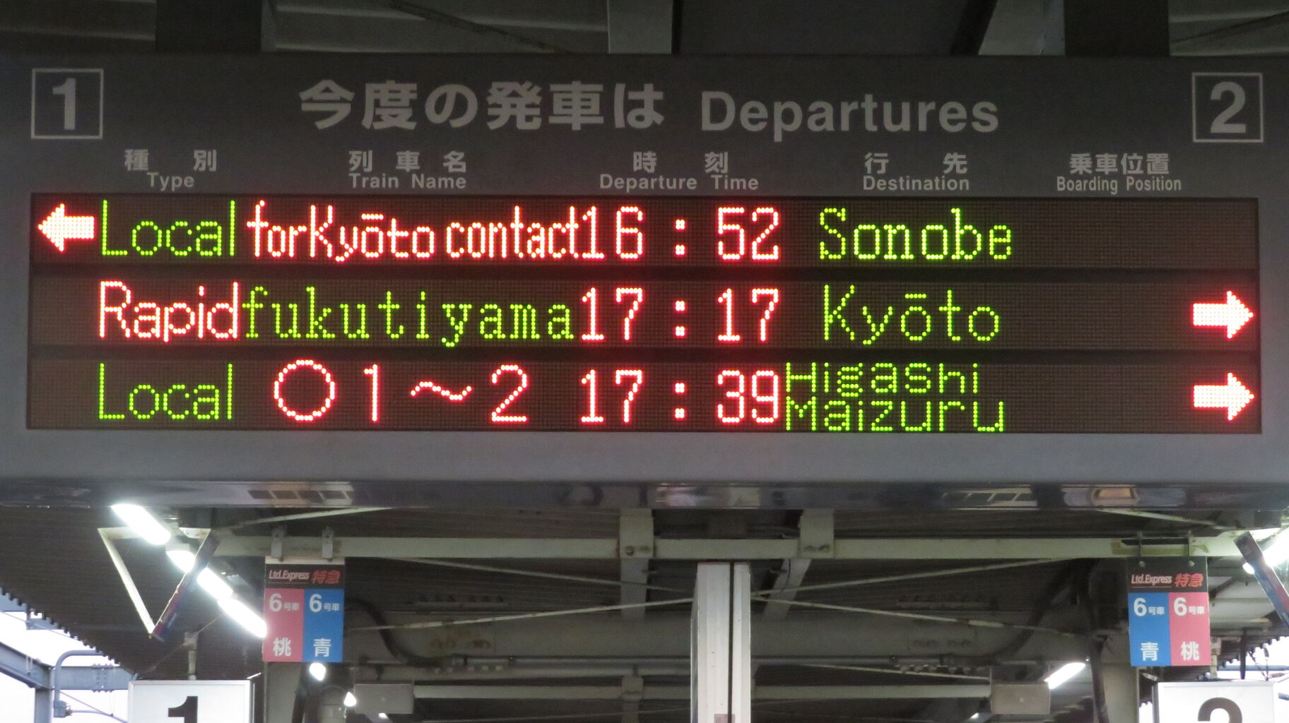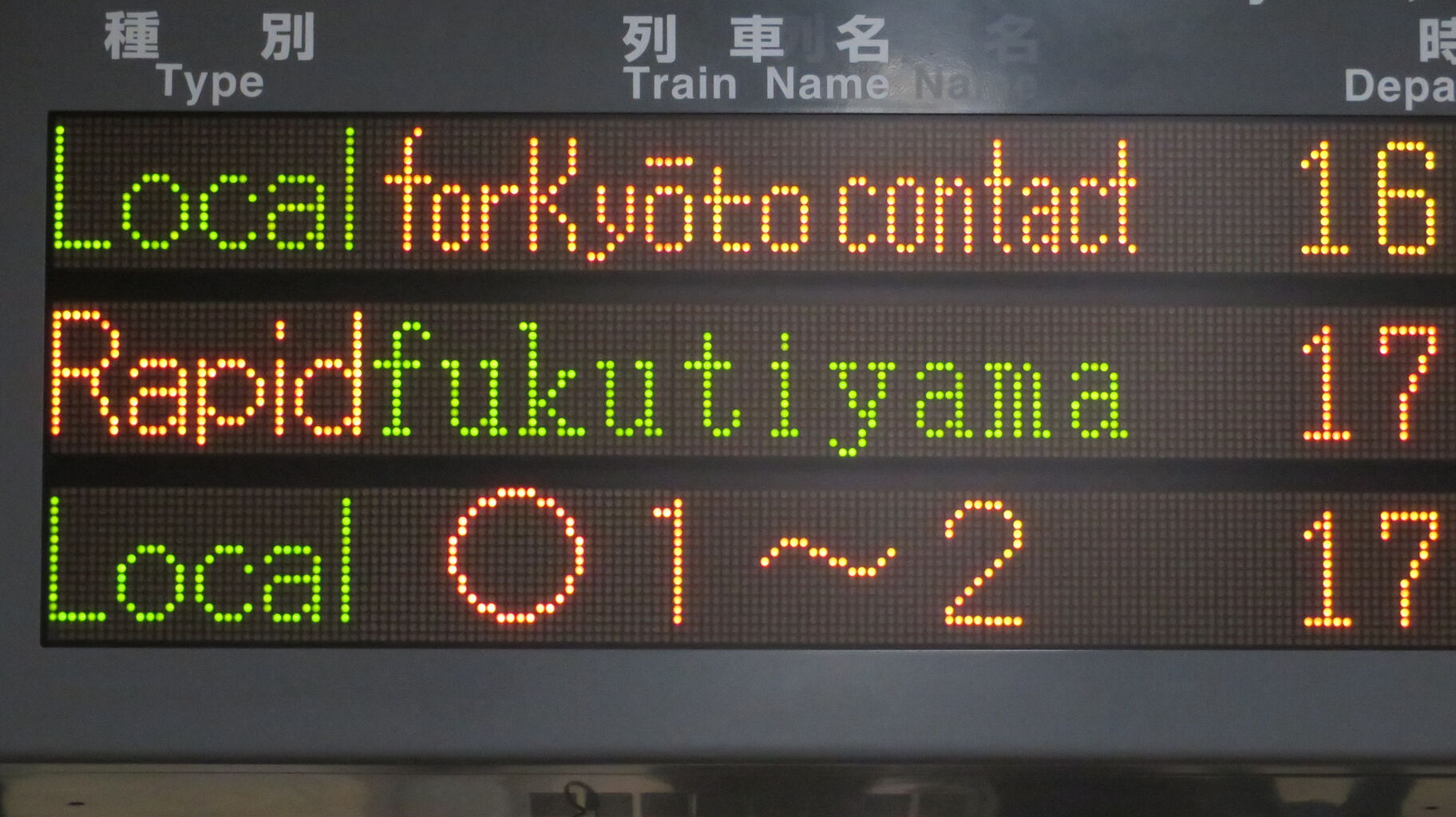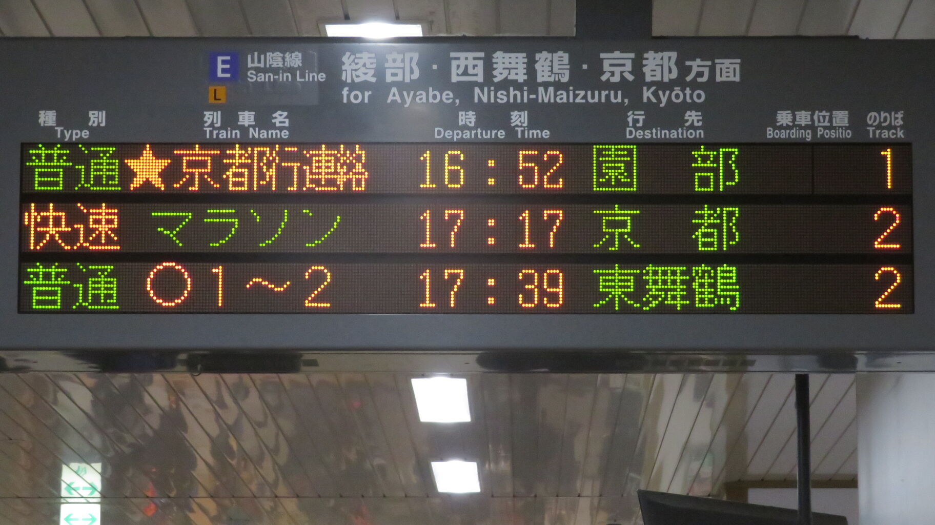 普通電車の場合、列車名欄には乗車位置が表示されるのですが、一番上の段の普通 園部行きは、「★京都行連絡」 「for Kyōto contact」 と表示されています。