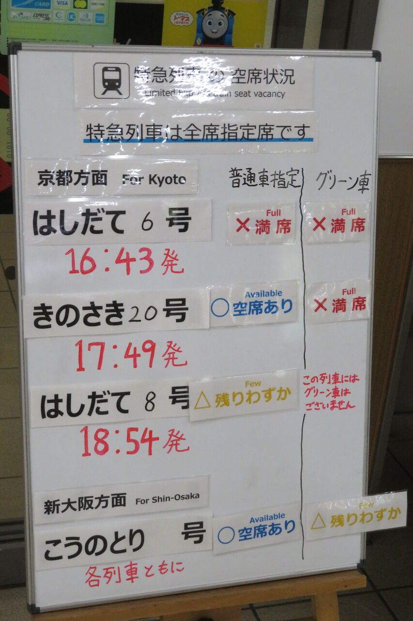 17:49発の特急きのさき20号は、16時30分時点で 普通車指定席に空席があるようでした。