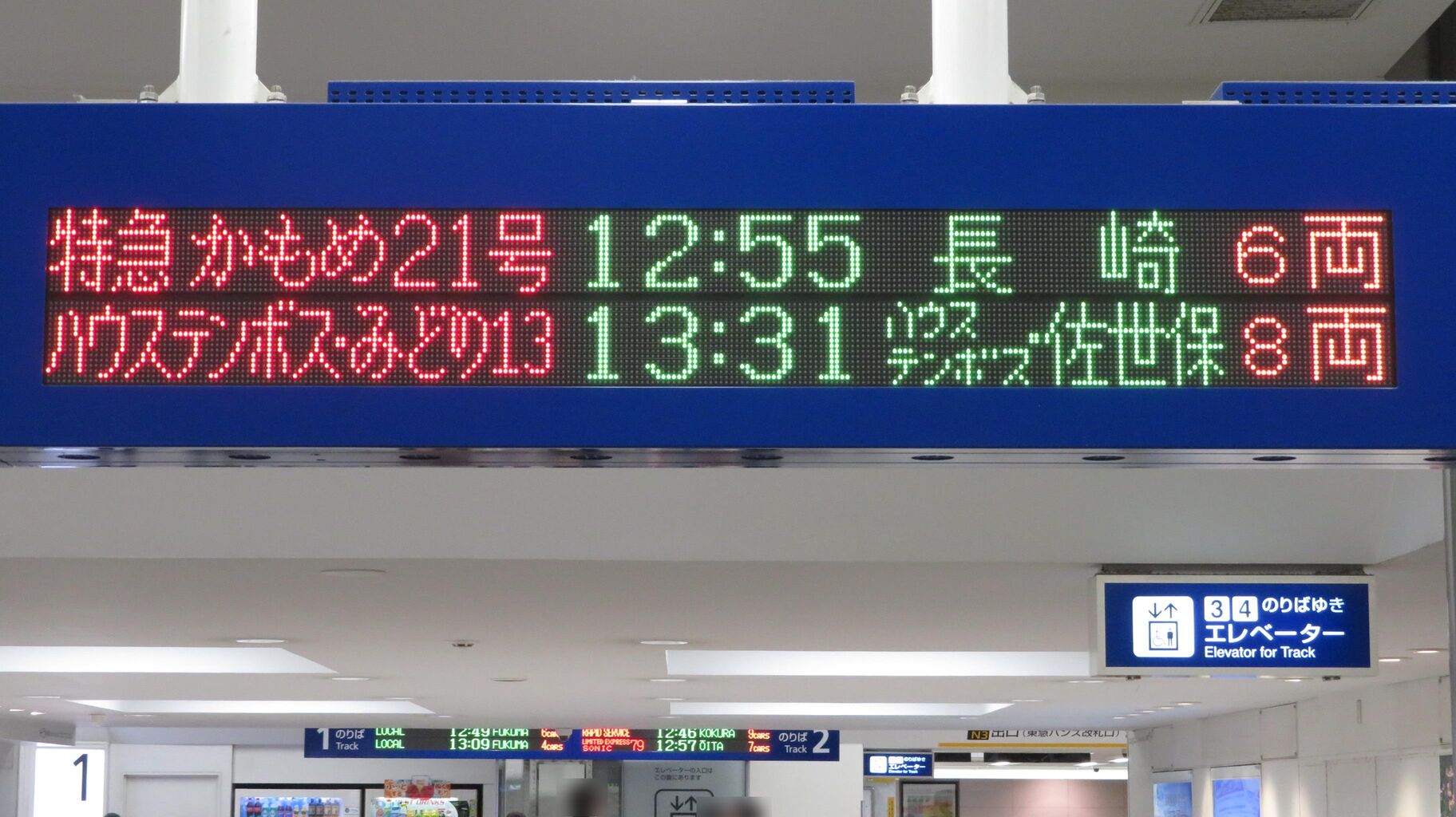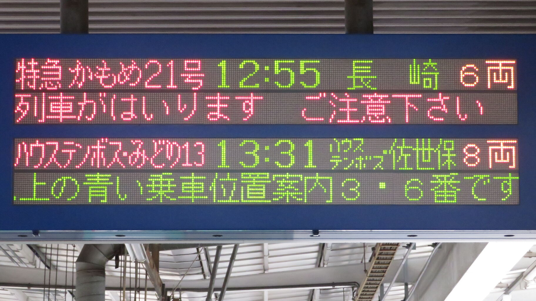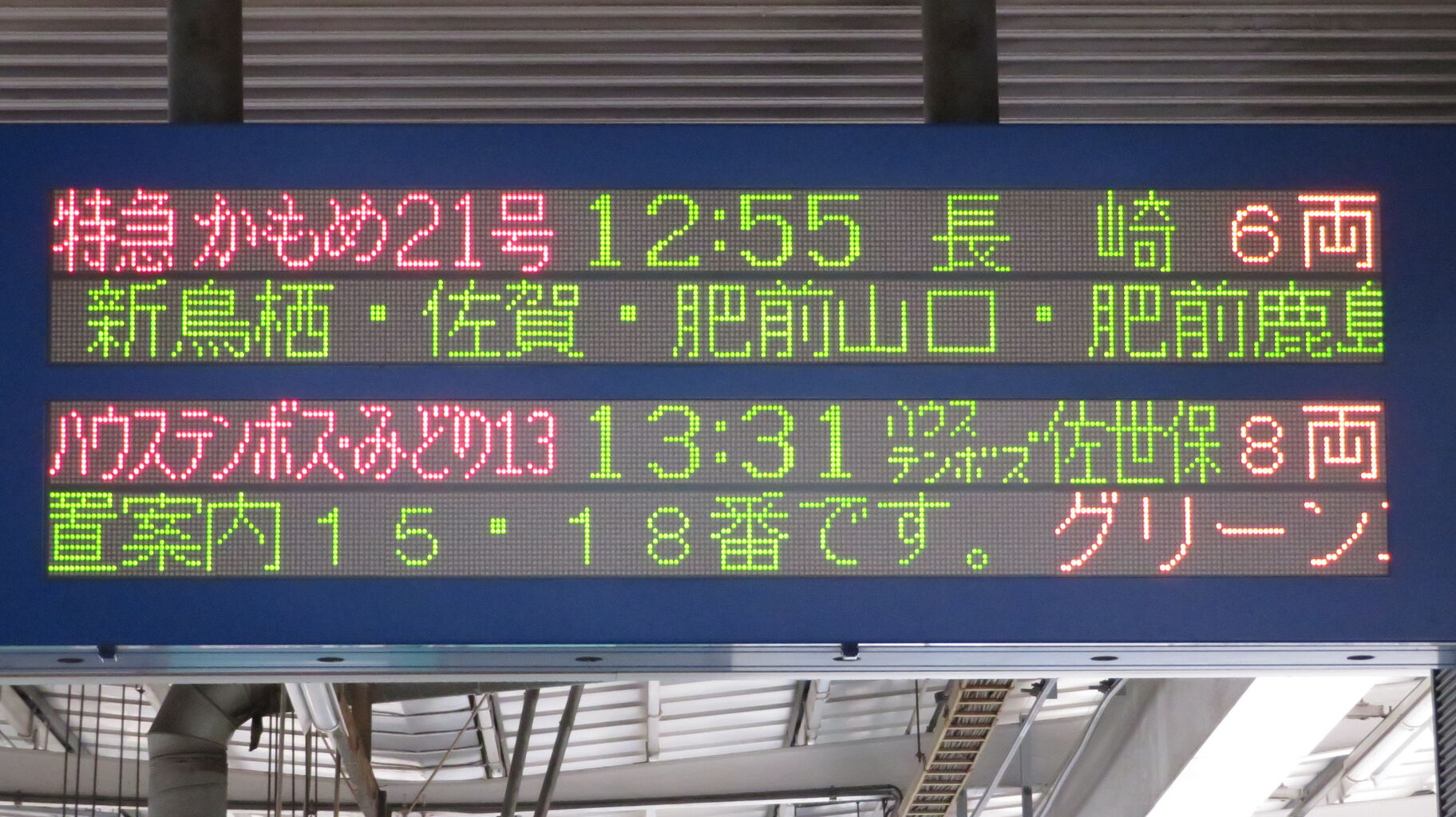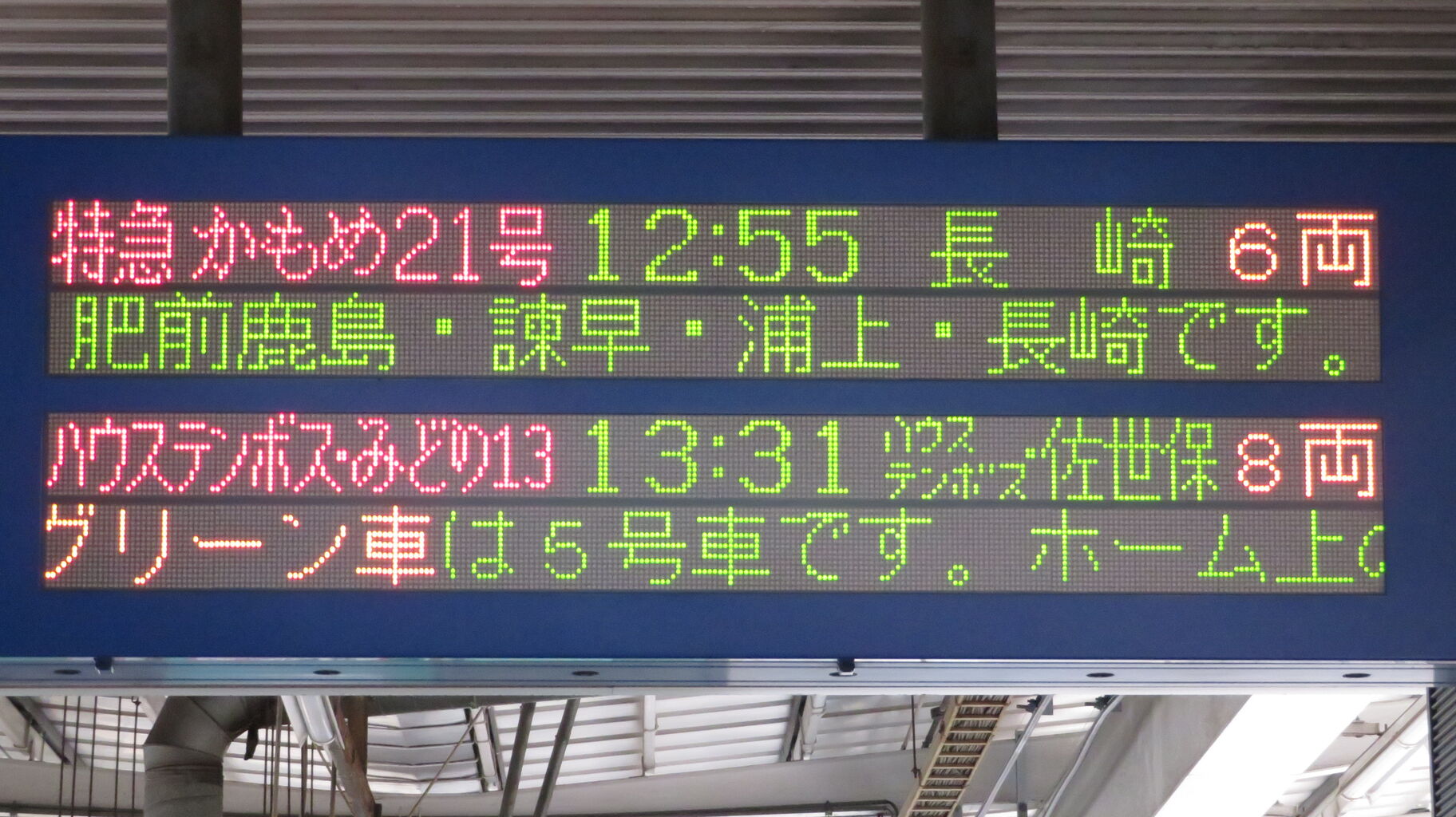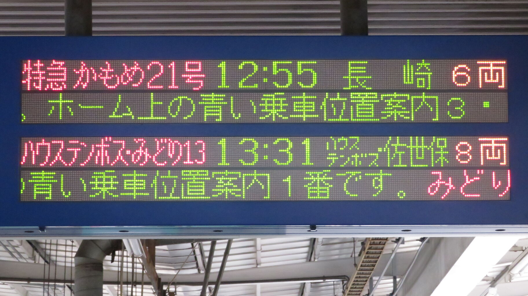 下の段に表示されているのは、特急 「ハウステンボス」 ハウステンボス行きと、特急 「みどり」 佐世保行きです。