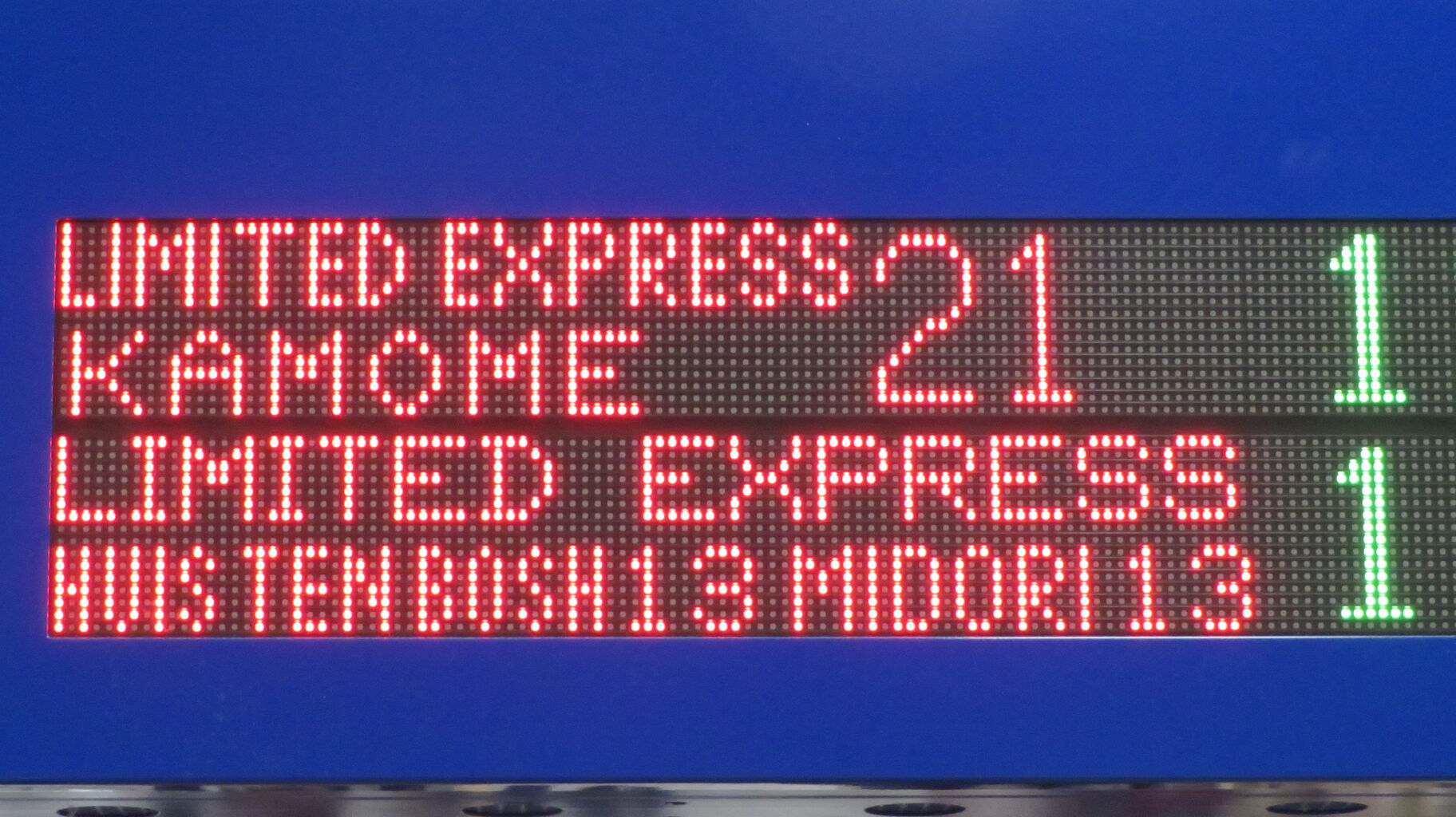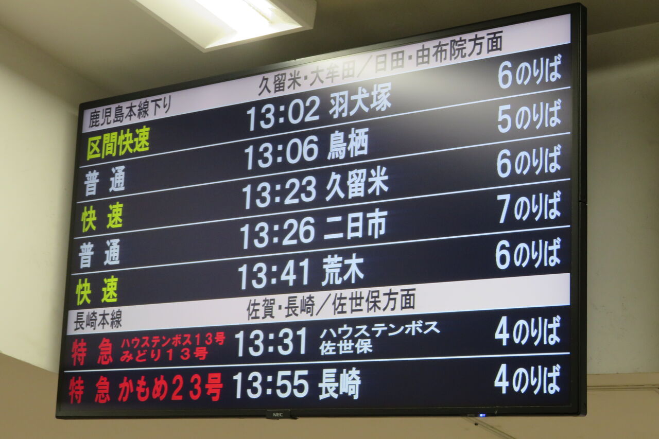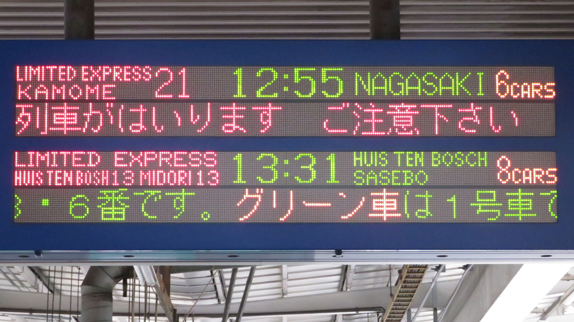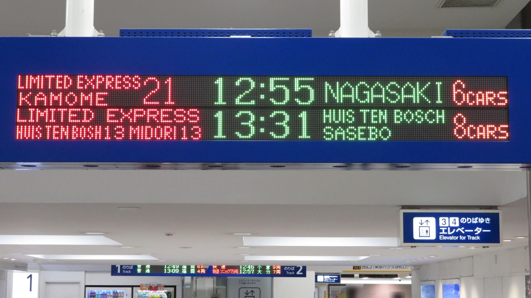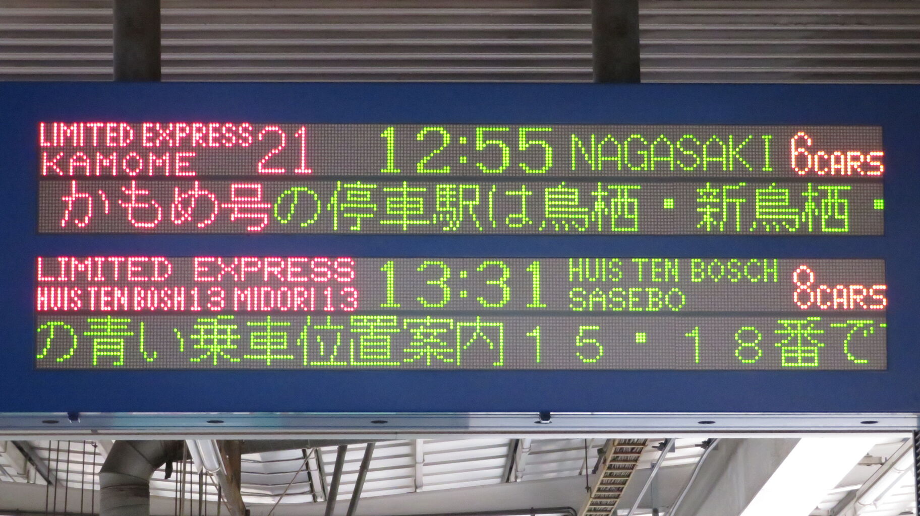 下の段に表示されているのは、特急 「ハウステンボス」 ハウステンボス行きと、特急 「みどり」 佐世保行きです。