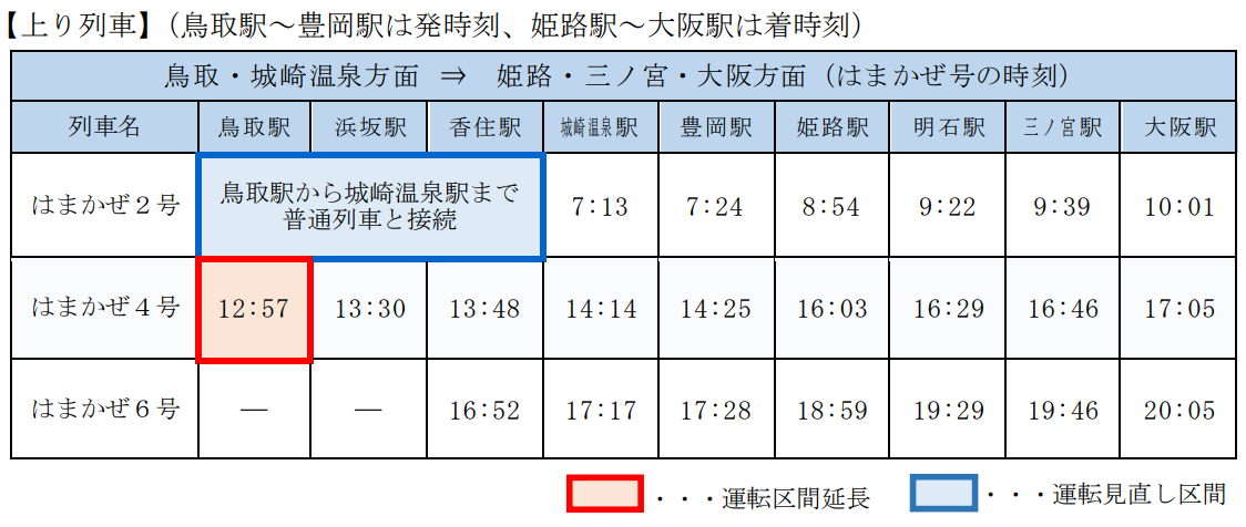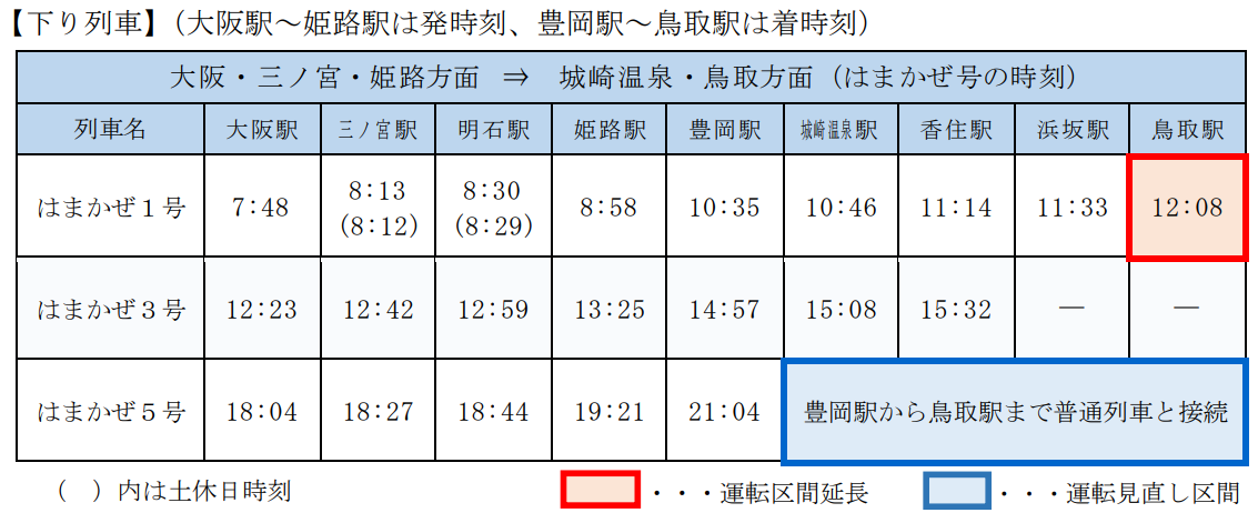 はまかぜ1号(現行は浜坂行き)は、運転時刻を1時間50分繰り上げ(大阪9:38発⇒7:48発)、運転区間を鳥取駅まで延長します。