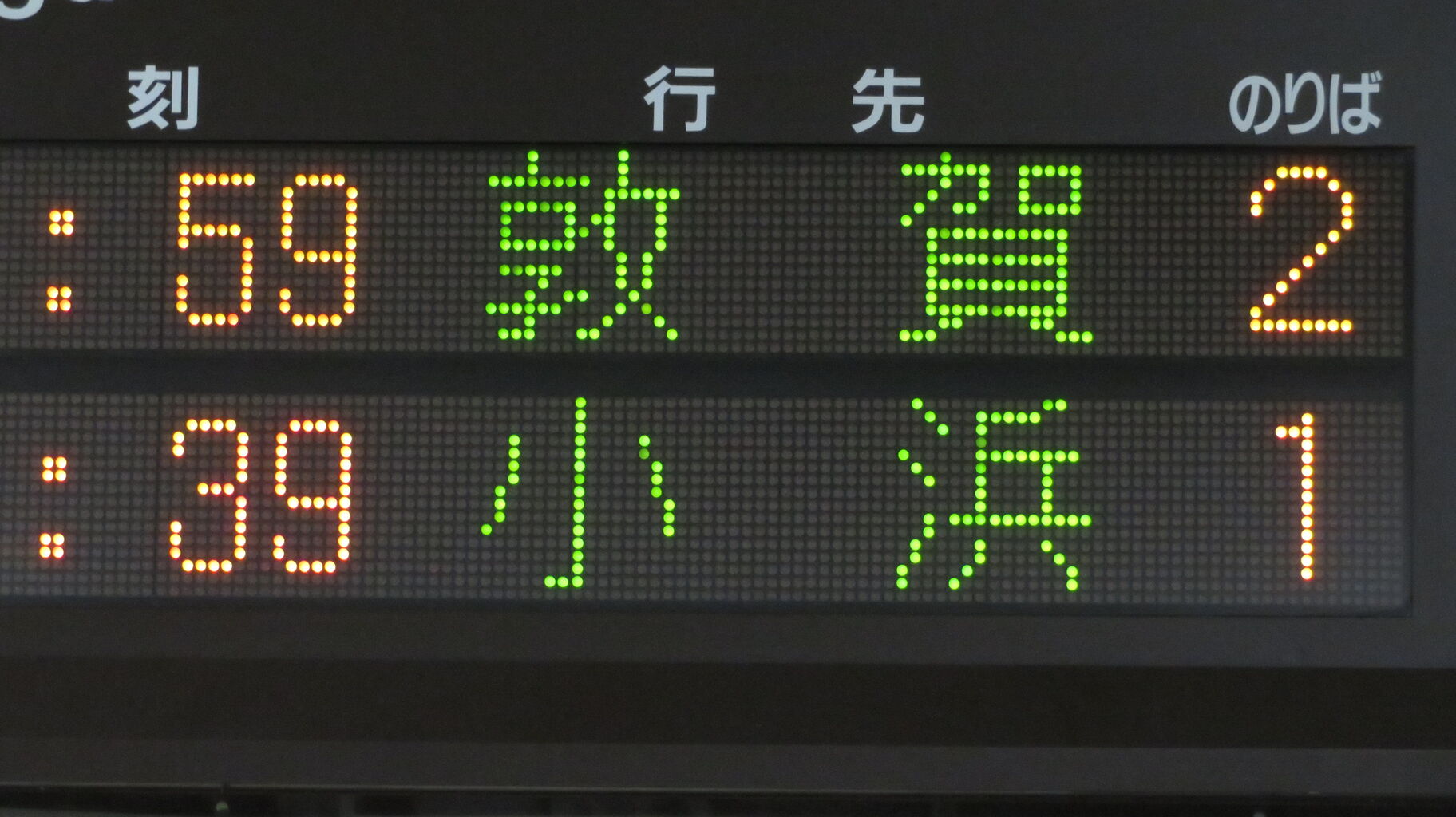 この駅の発車標は、下の段にスクロール表示が流れている時しか英語表示が出ません。