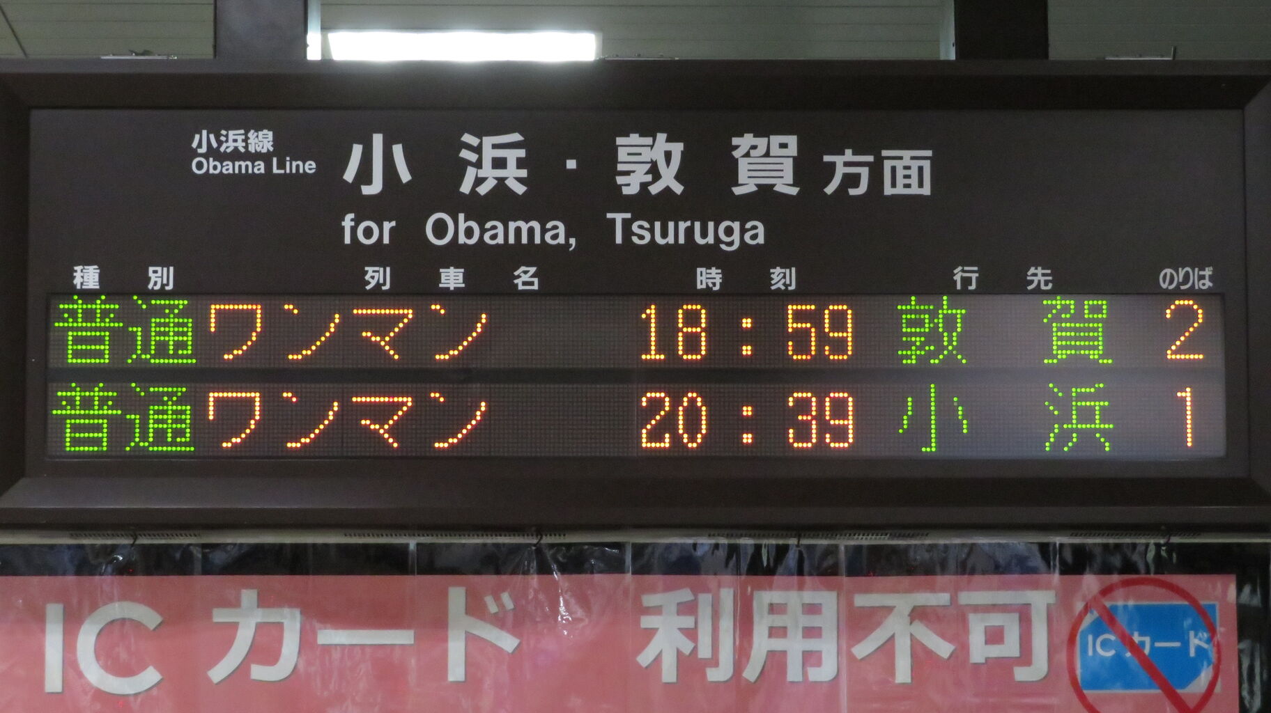 18:59発の普通 敦賀行きが発車しないと、小浜行きの英語表示が見られないのです。