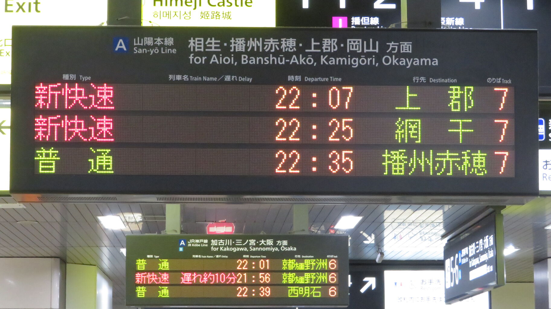 新快速の上郡行きは、22時7分に発車します。