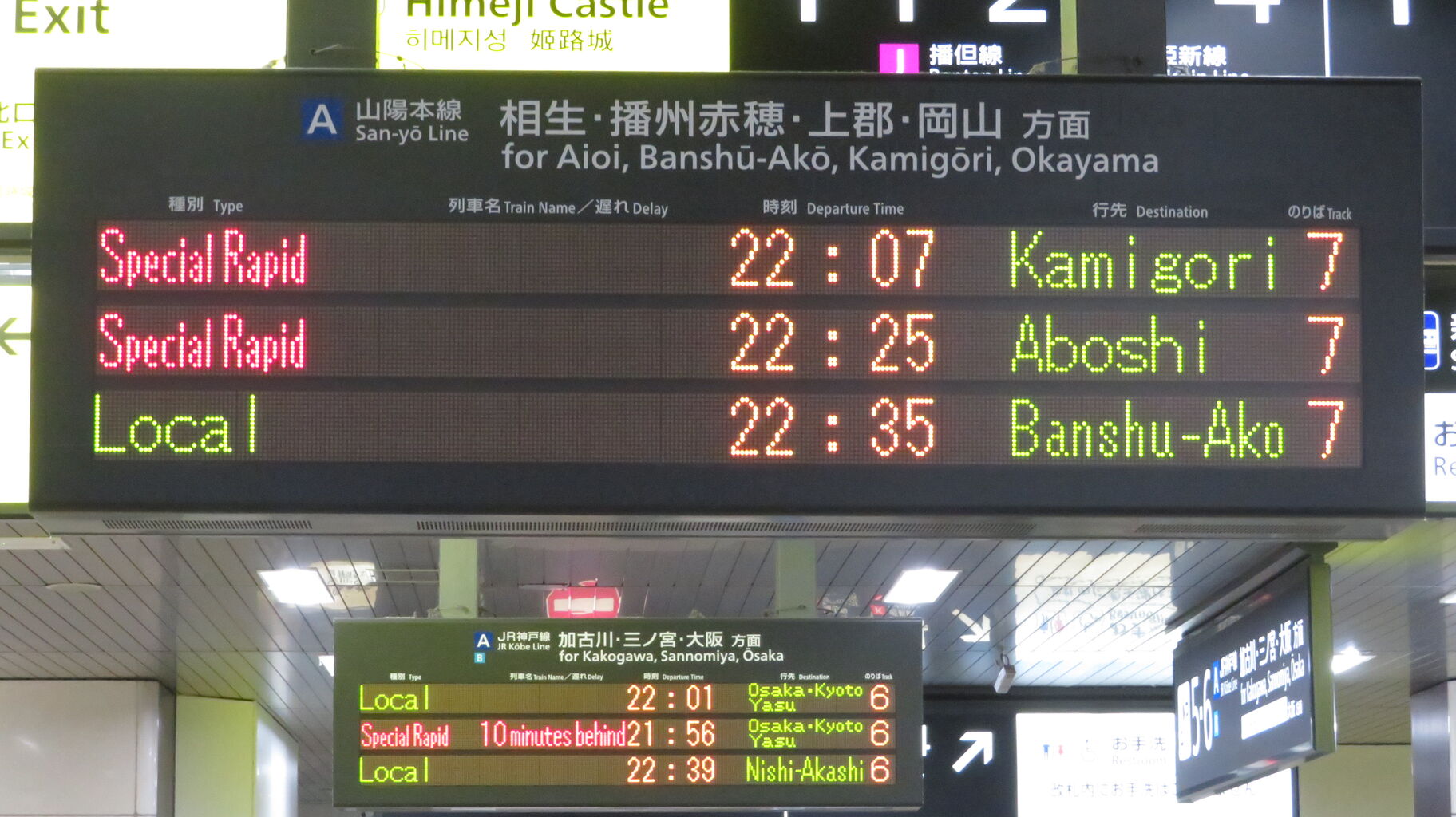姫路駅到着直後は、「姫路方面 上郡」 と表示されていました。