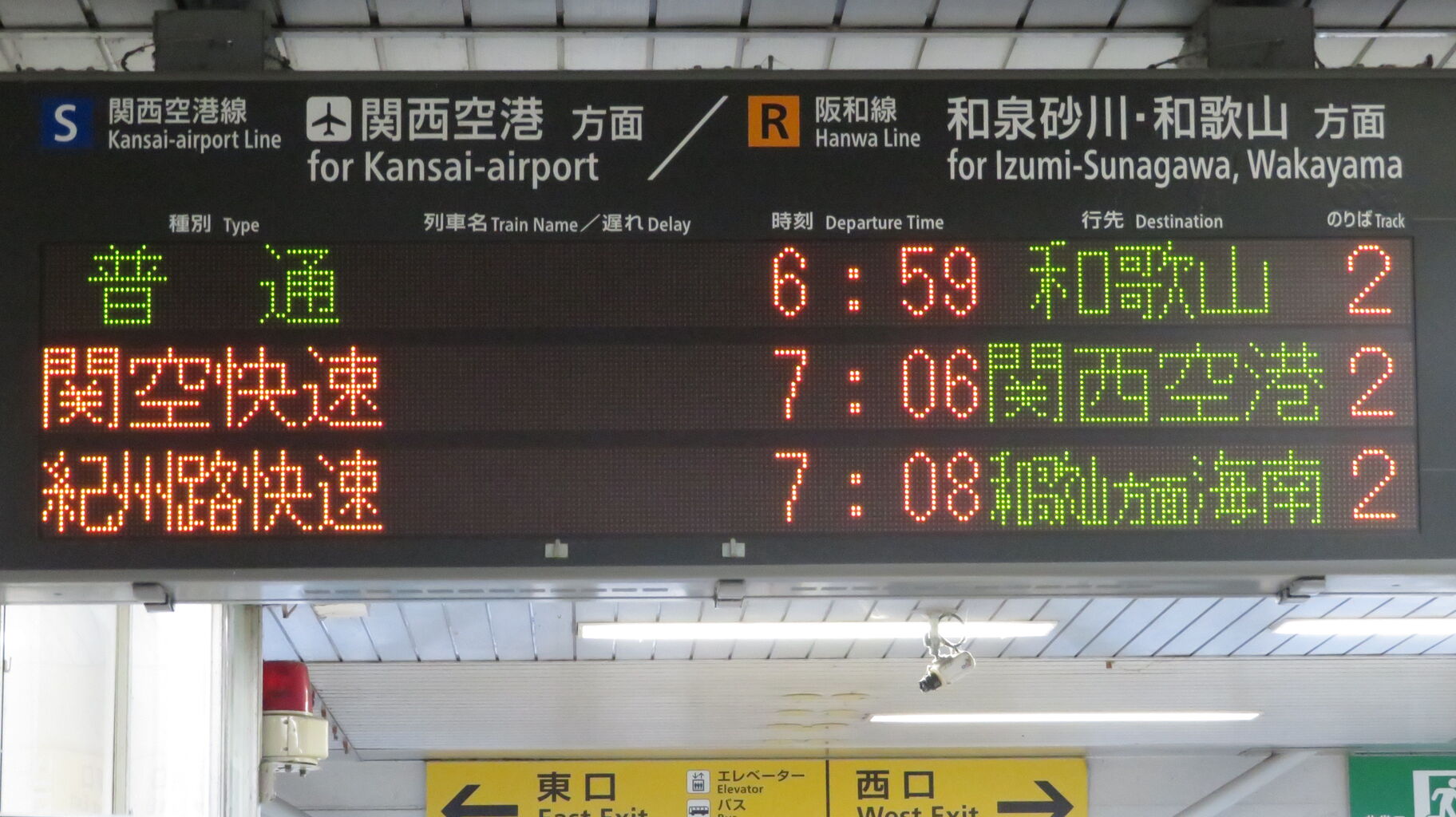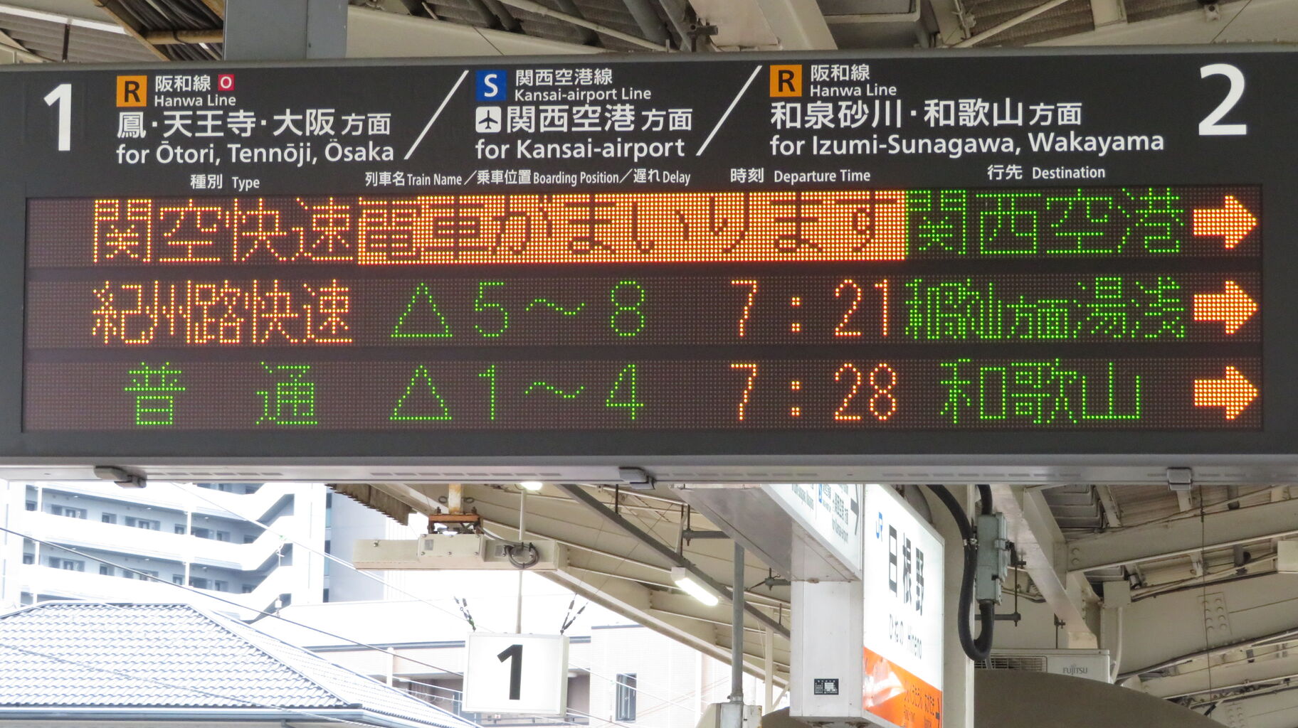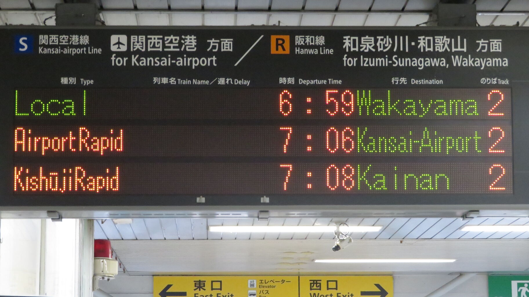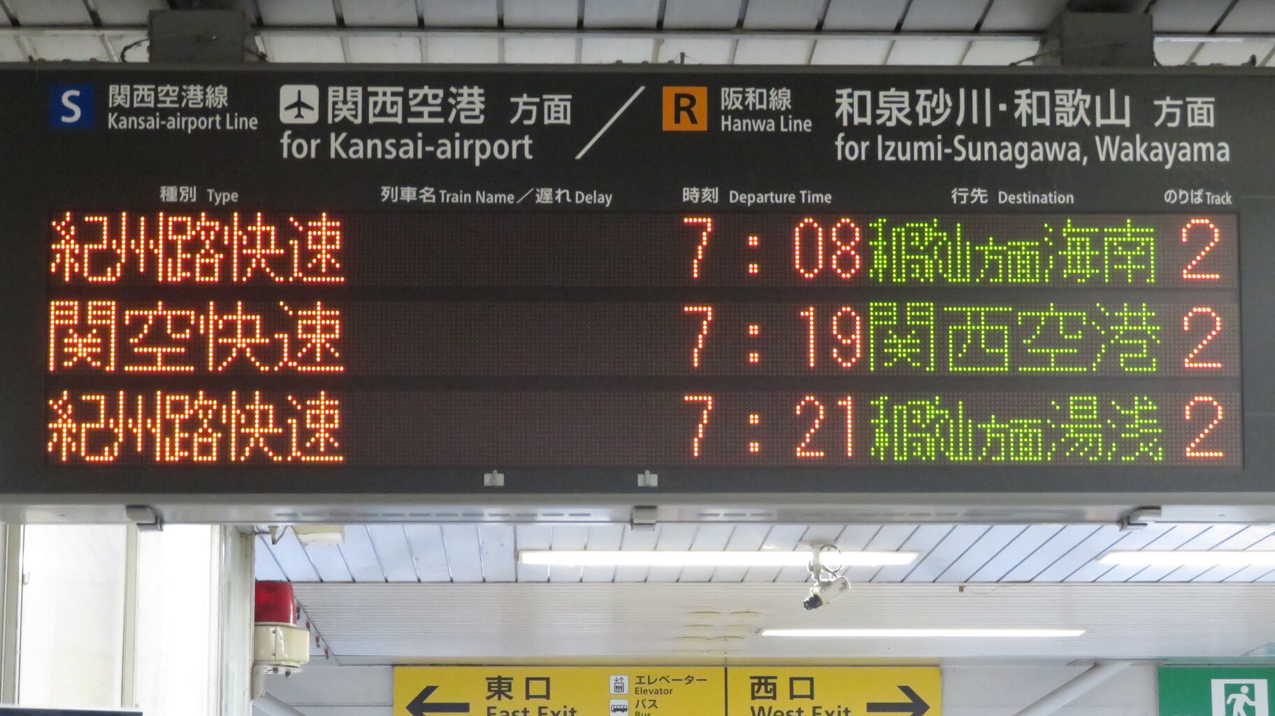 隣の熊取駅以北では、関空/紀州路快速 関西空港・海南行きと案内されるため、「和歌山方面 海南」 表示は 日根野~紀伊中ノ島(和歌山駅の1つ手前)駅間でしか見られません。
