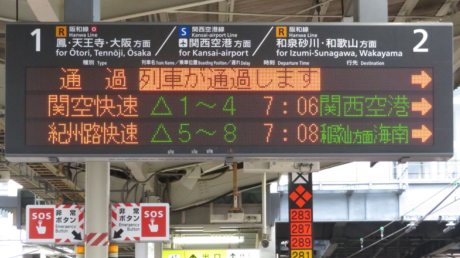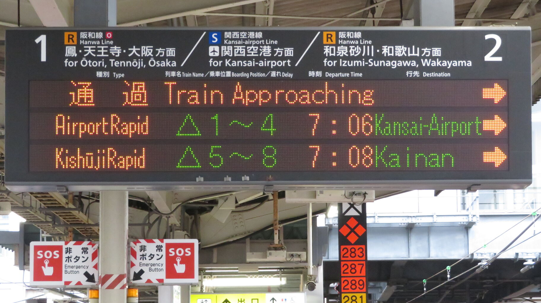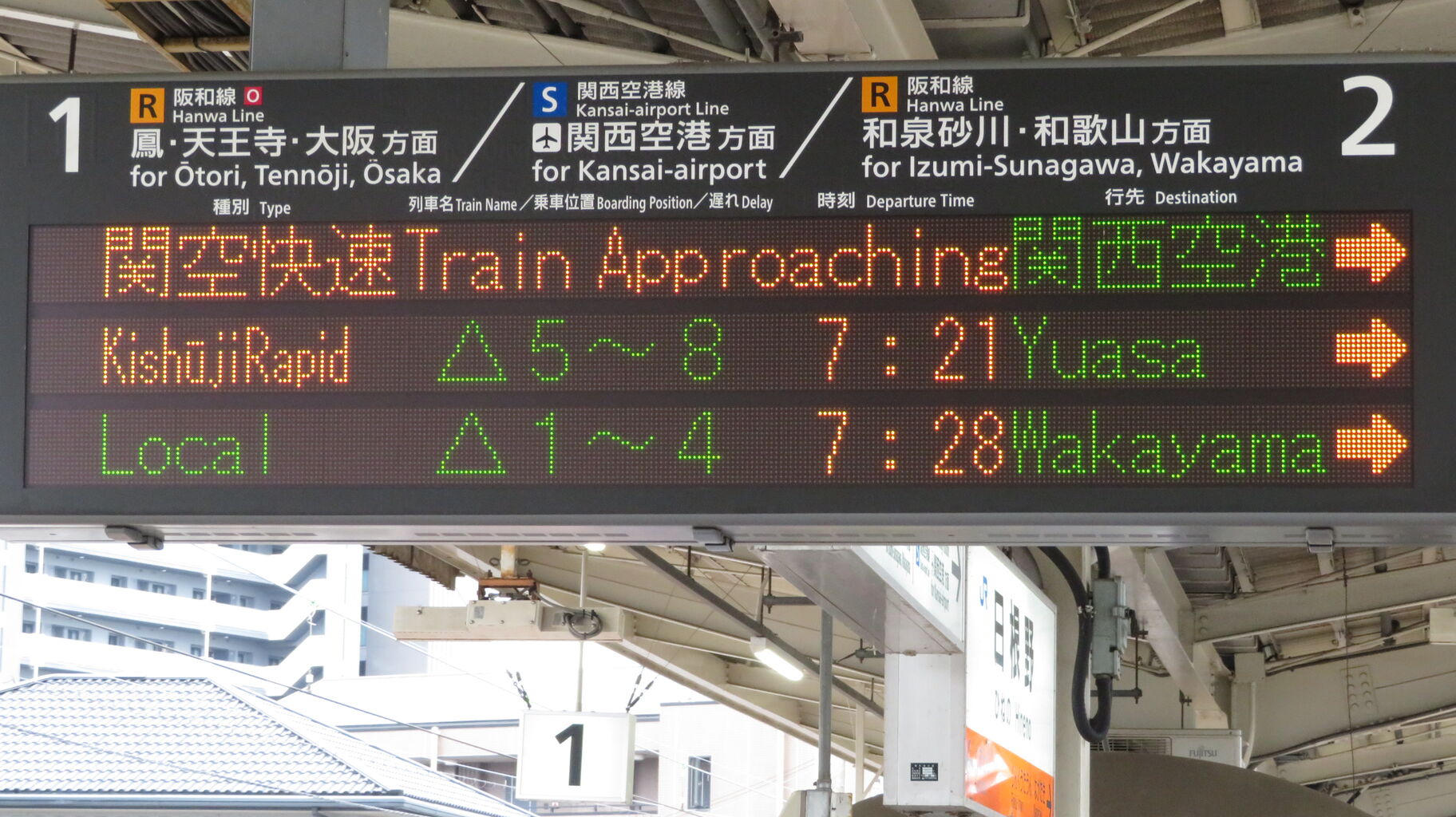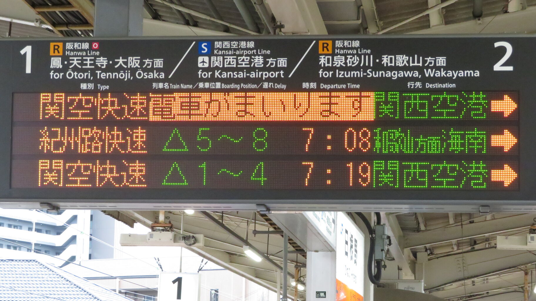 電車がまいります Train Approaching 表示は、一番上の関空快速のみ表示されています。