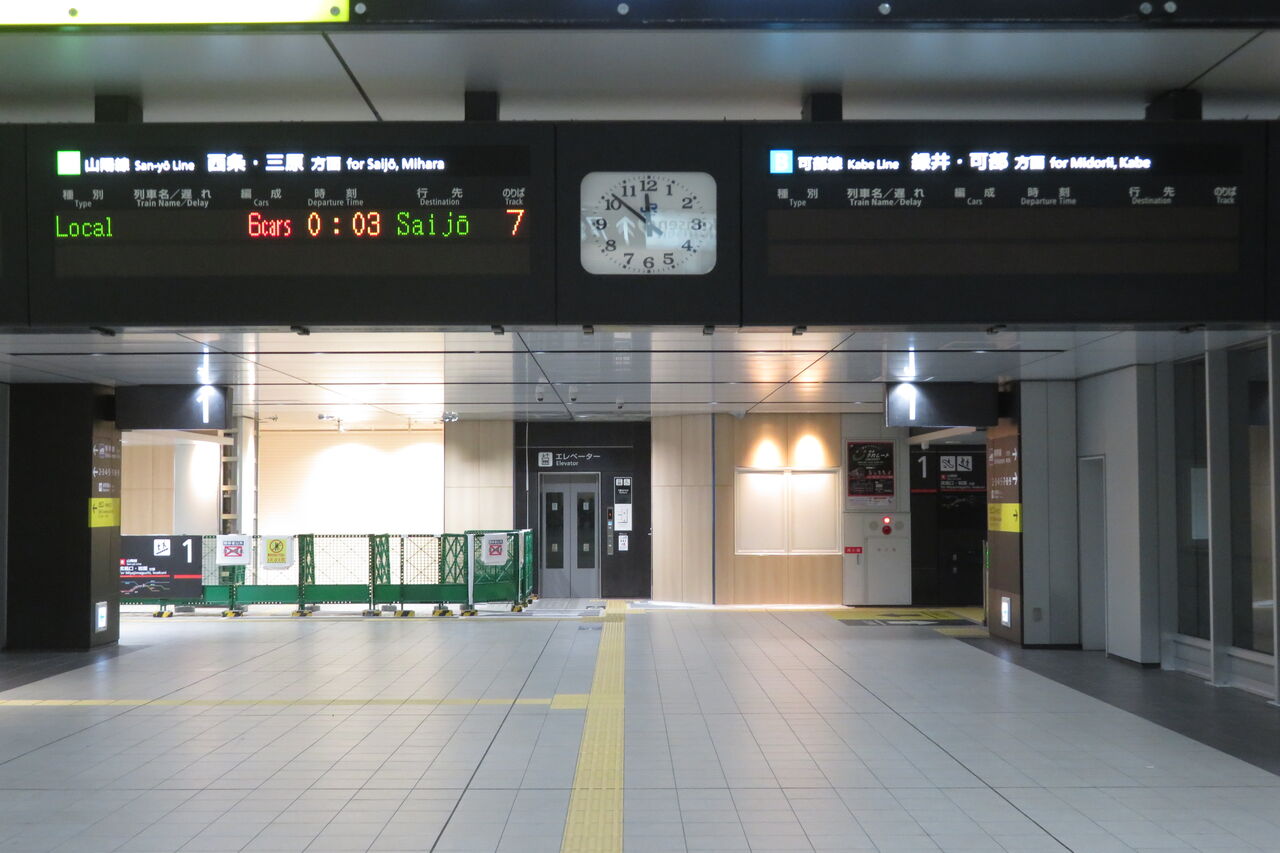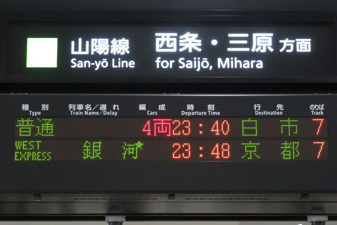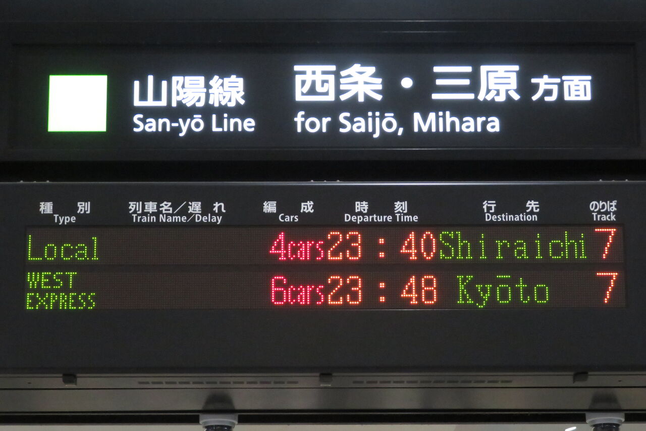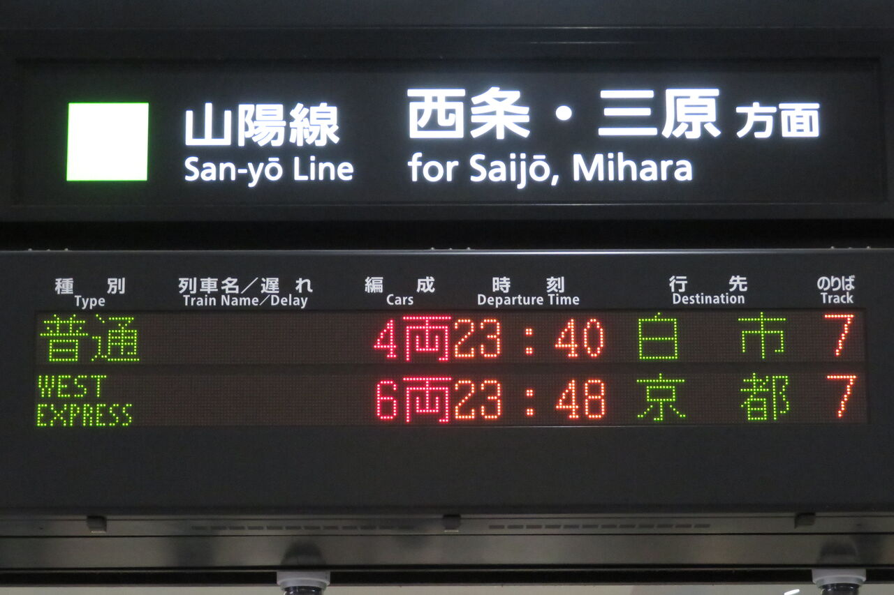下の段の普通 西条行きは、山陽線上りの最終列車です。