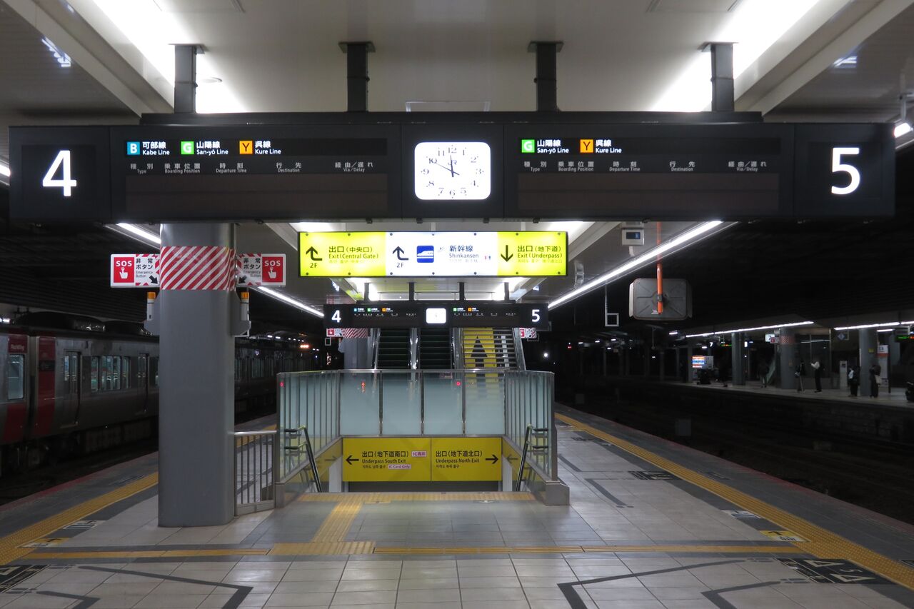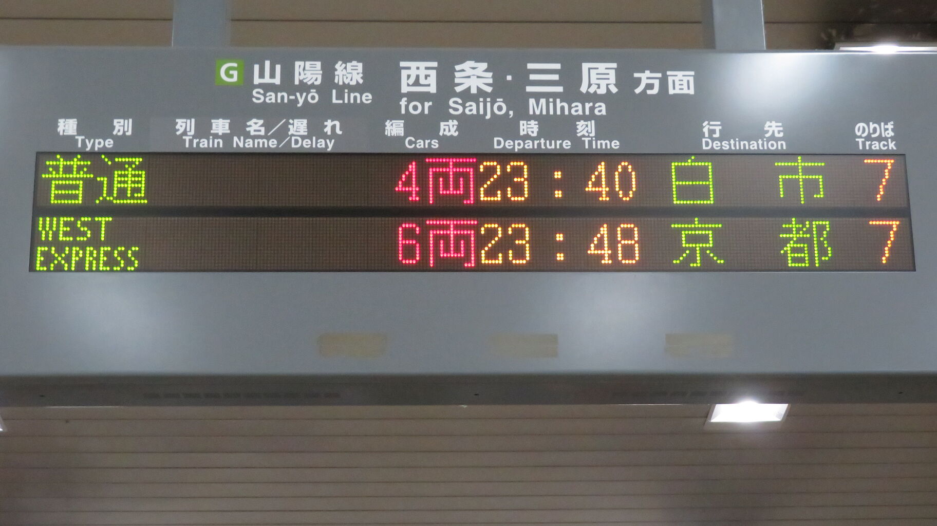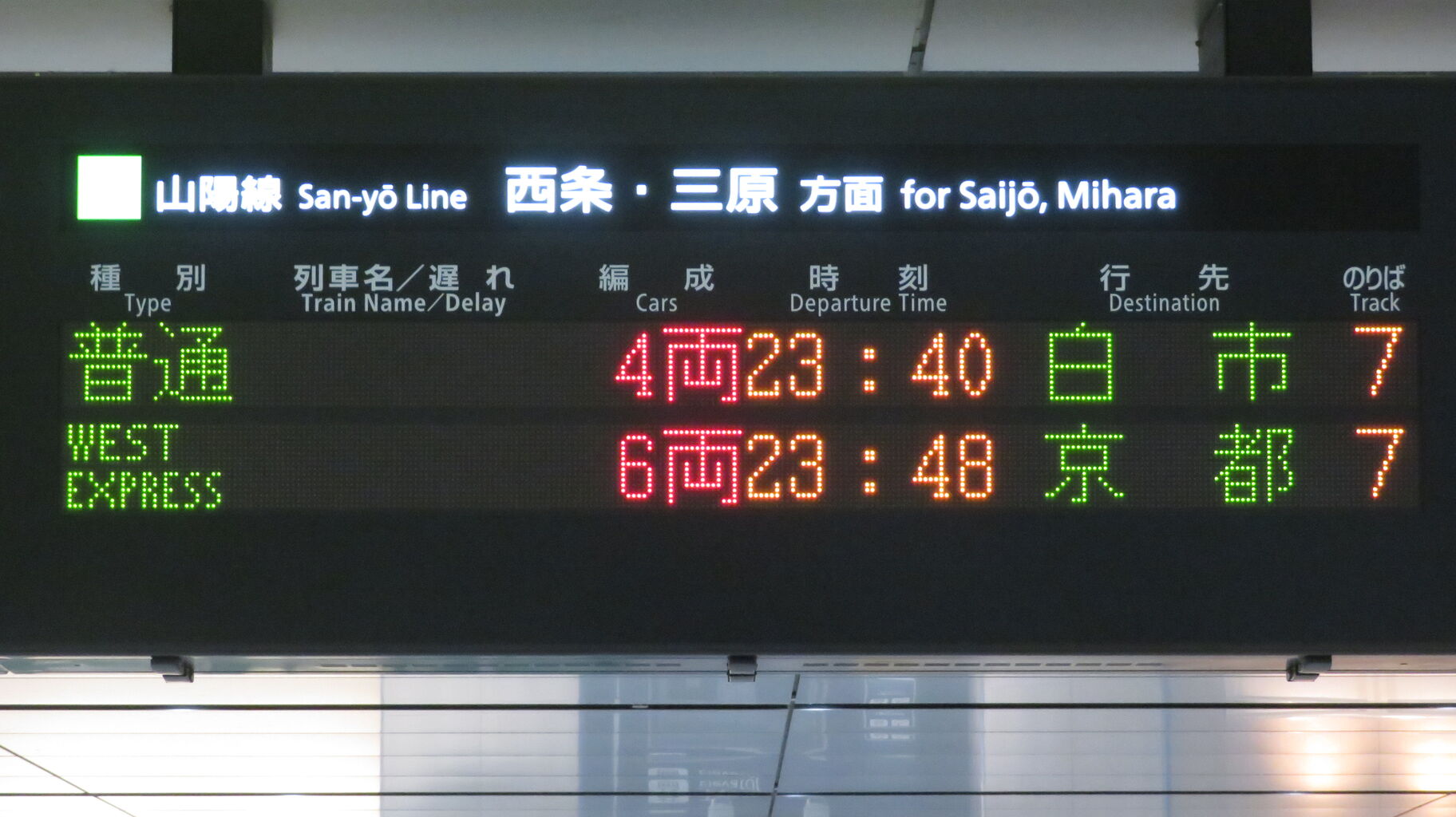 下の段の普通 西条行きは、山陽線上りの最終列車です。