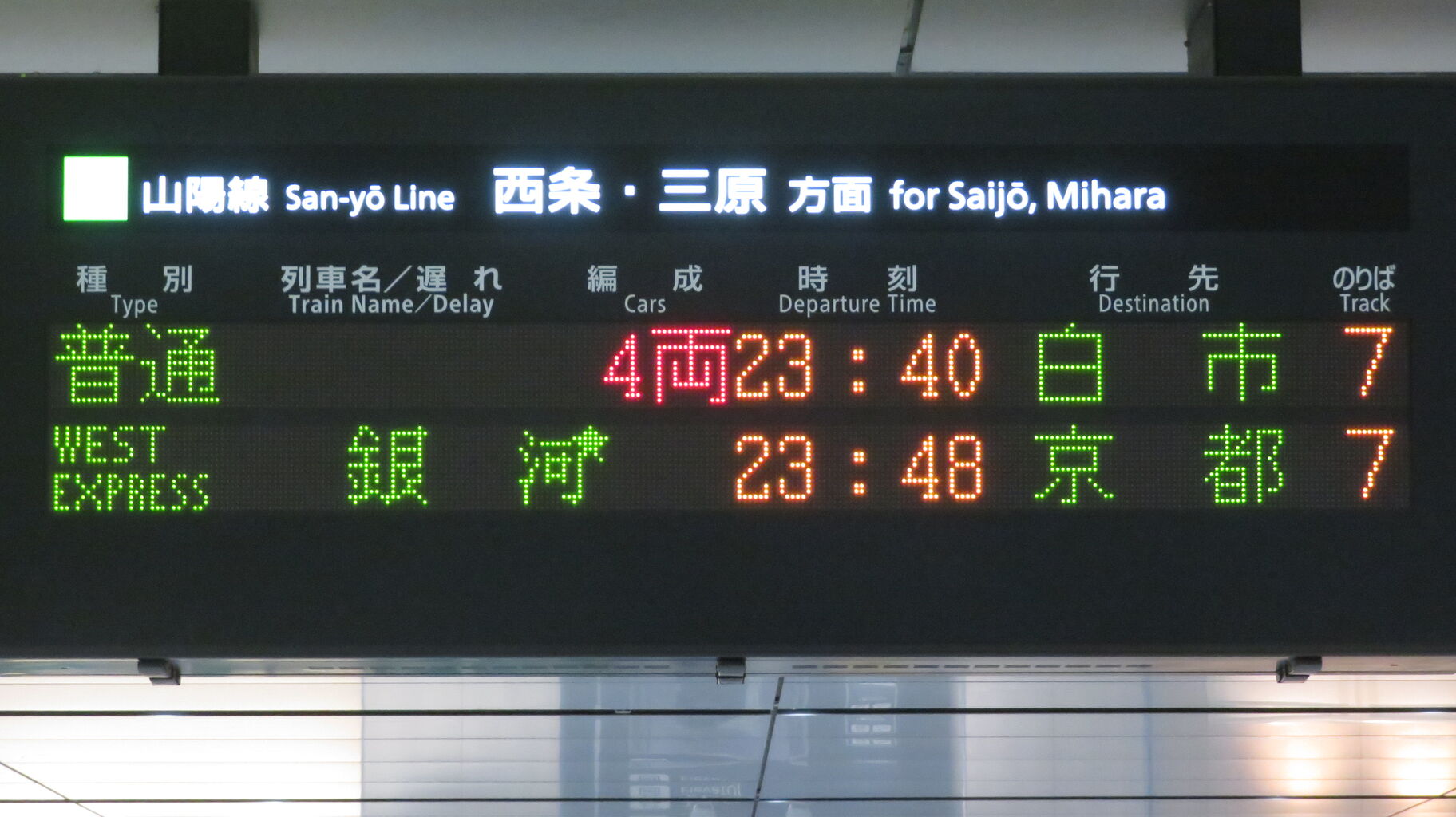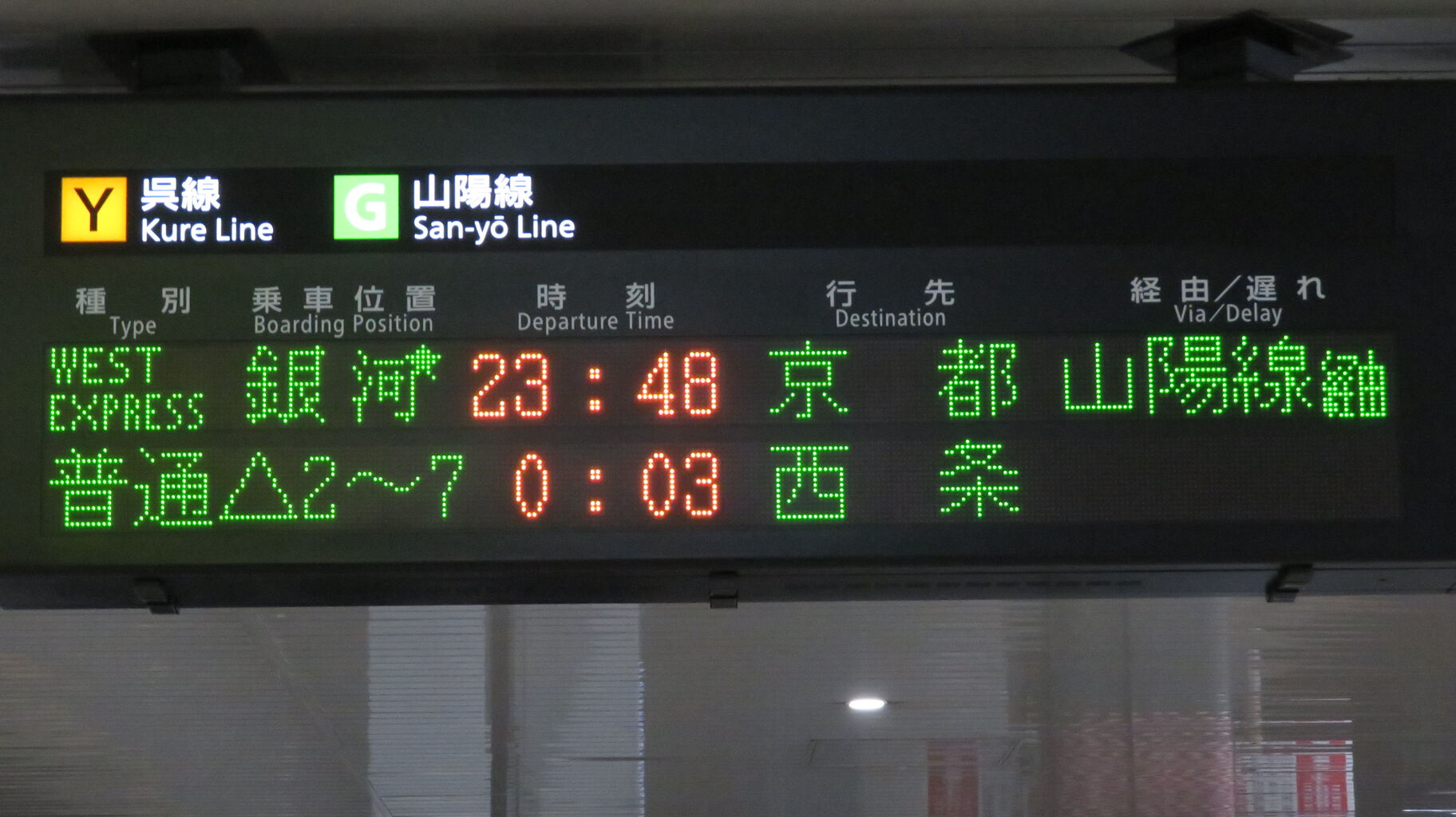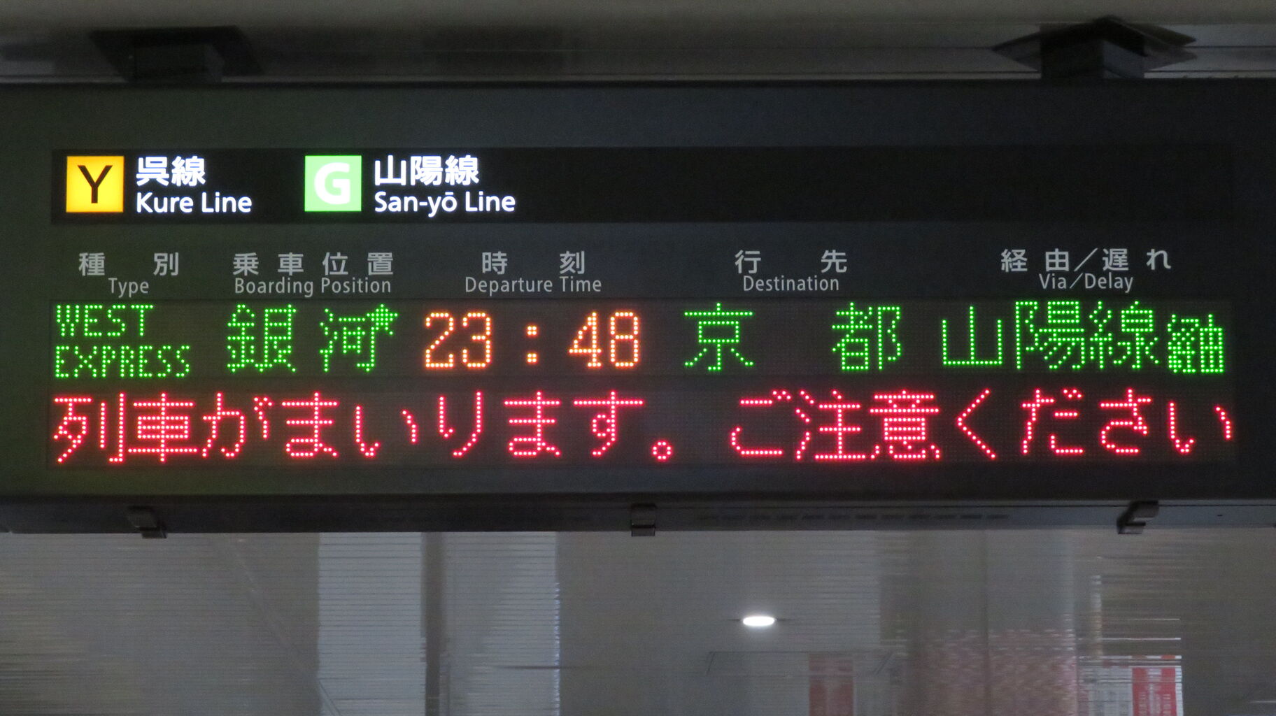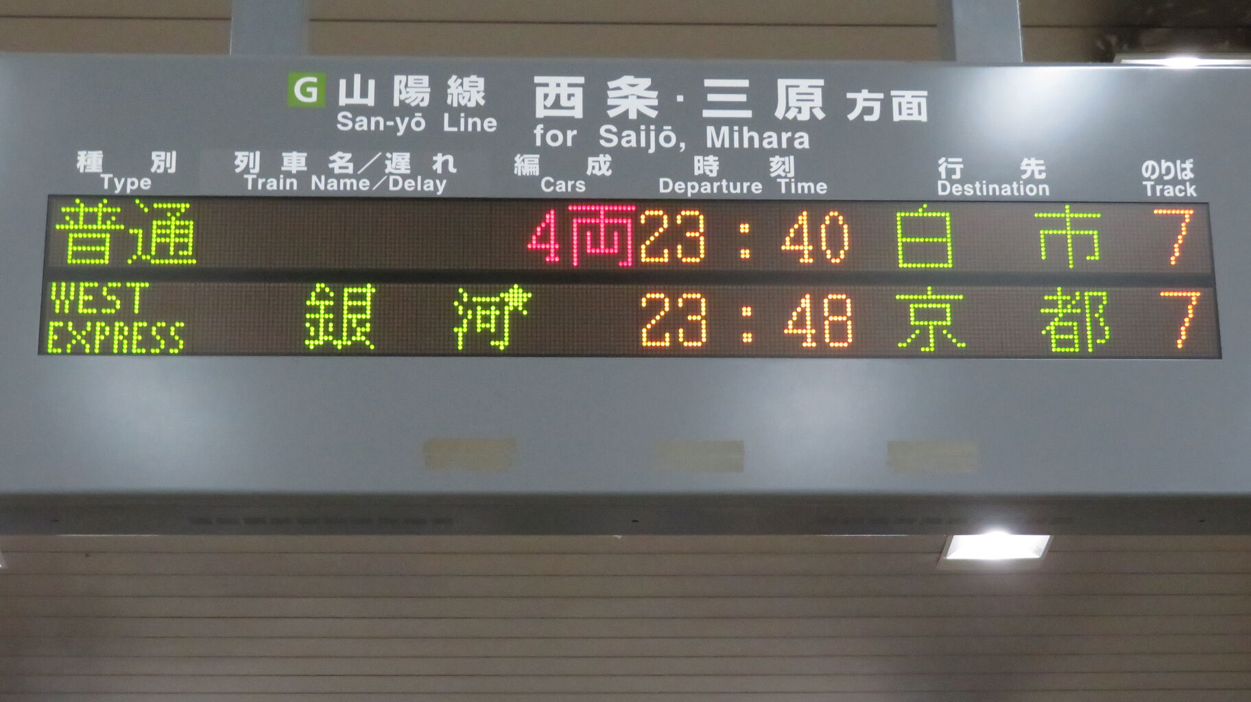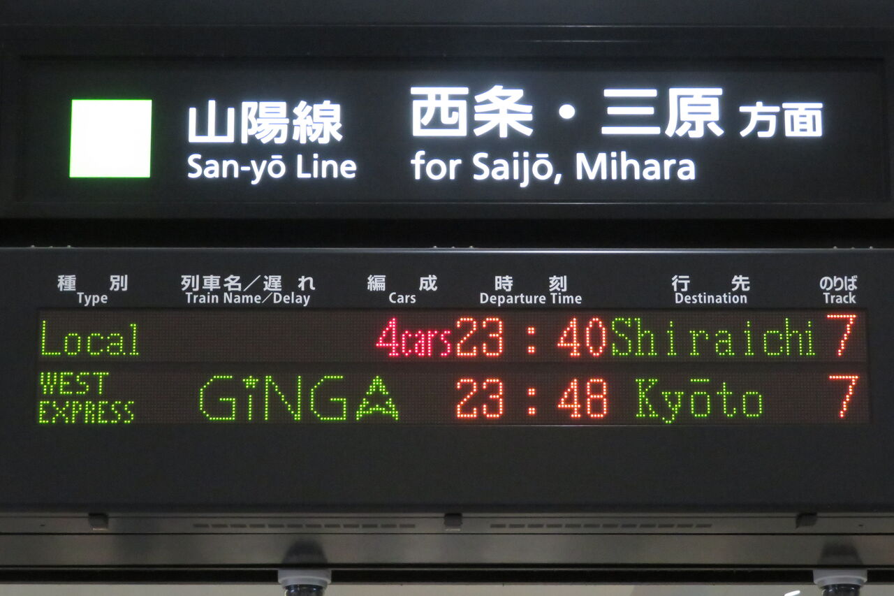 下の段に、23時48分に発車する 「WEST EXPRESS 銀河」 京都行きが表示されました。