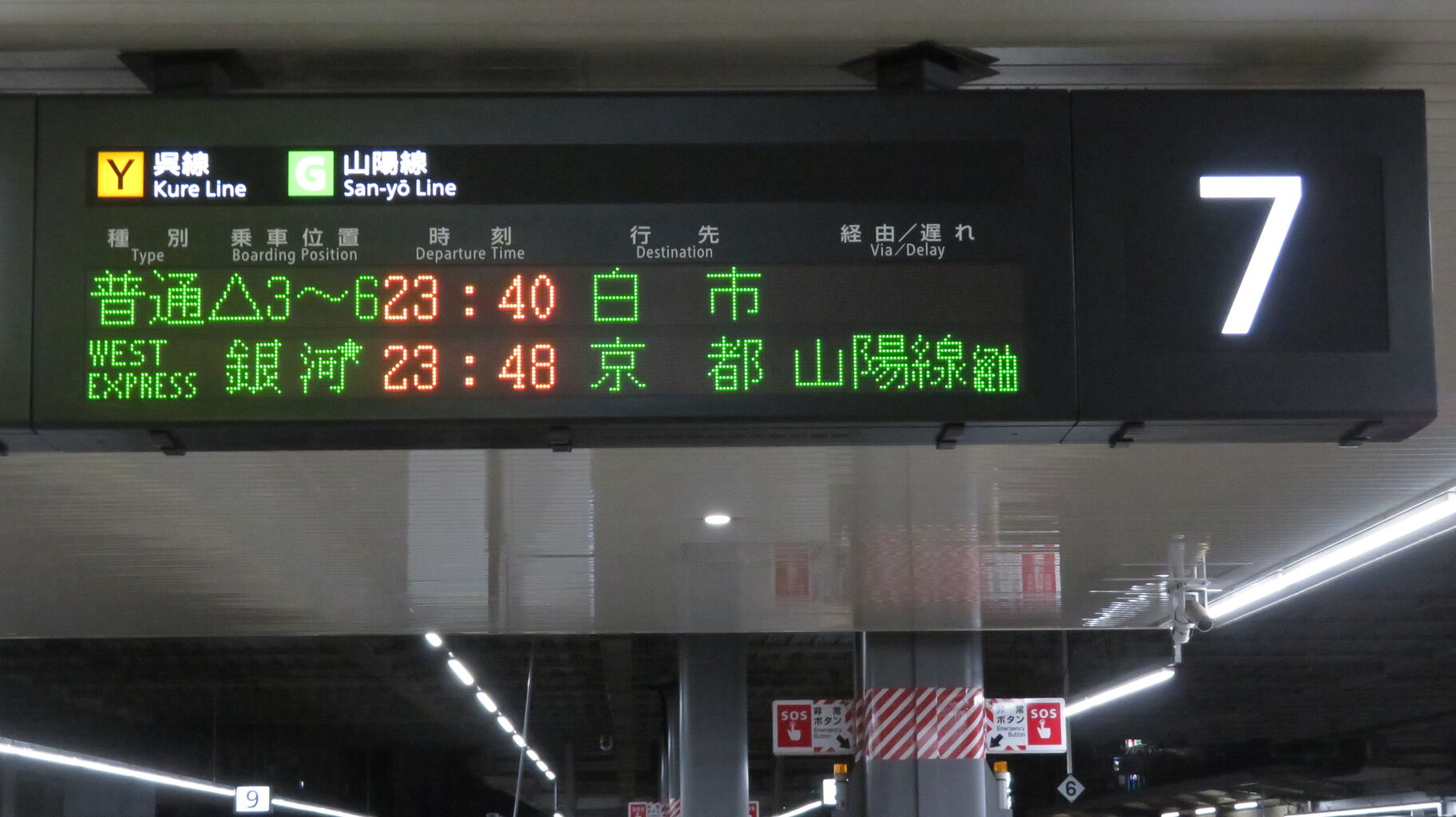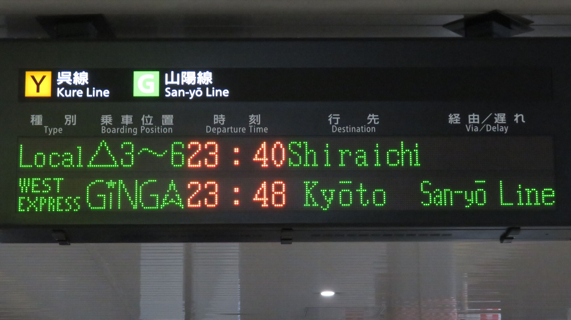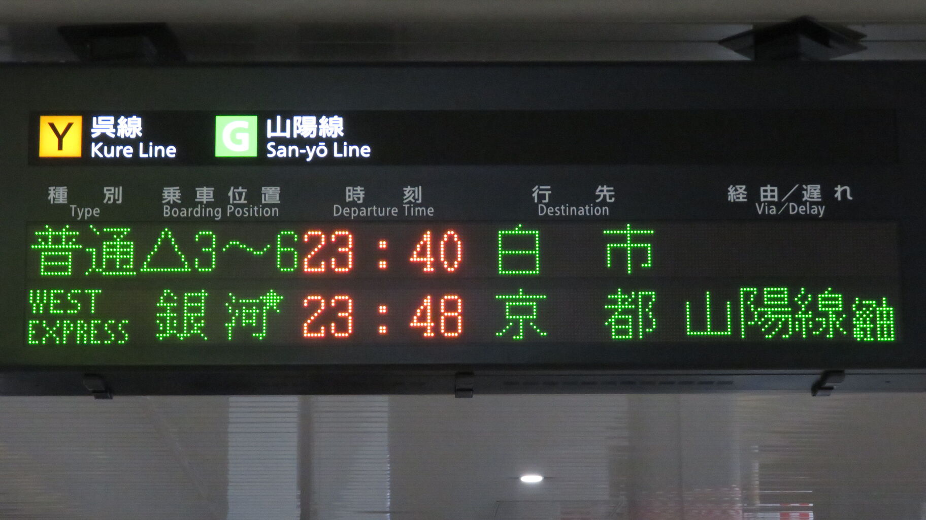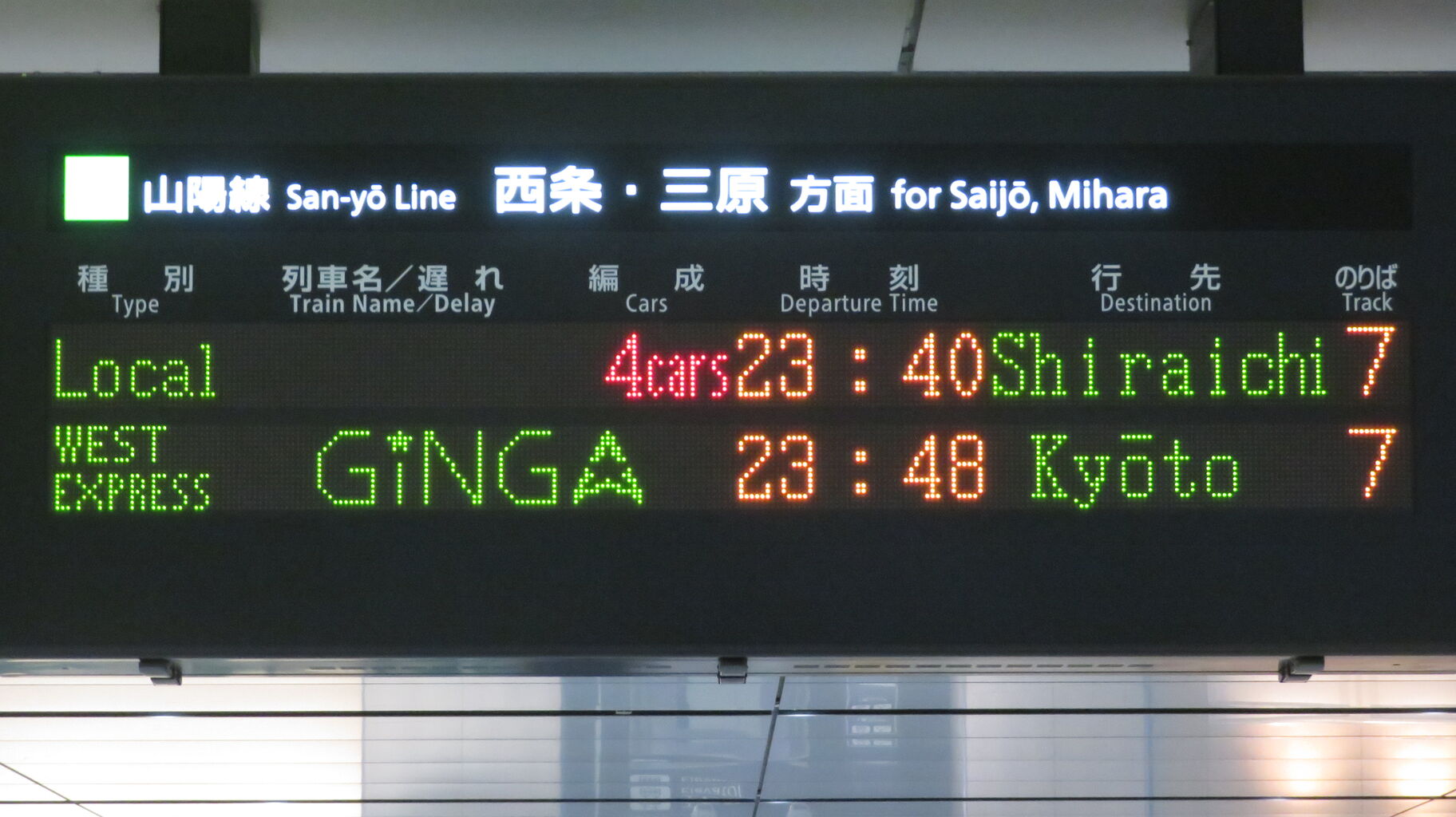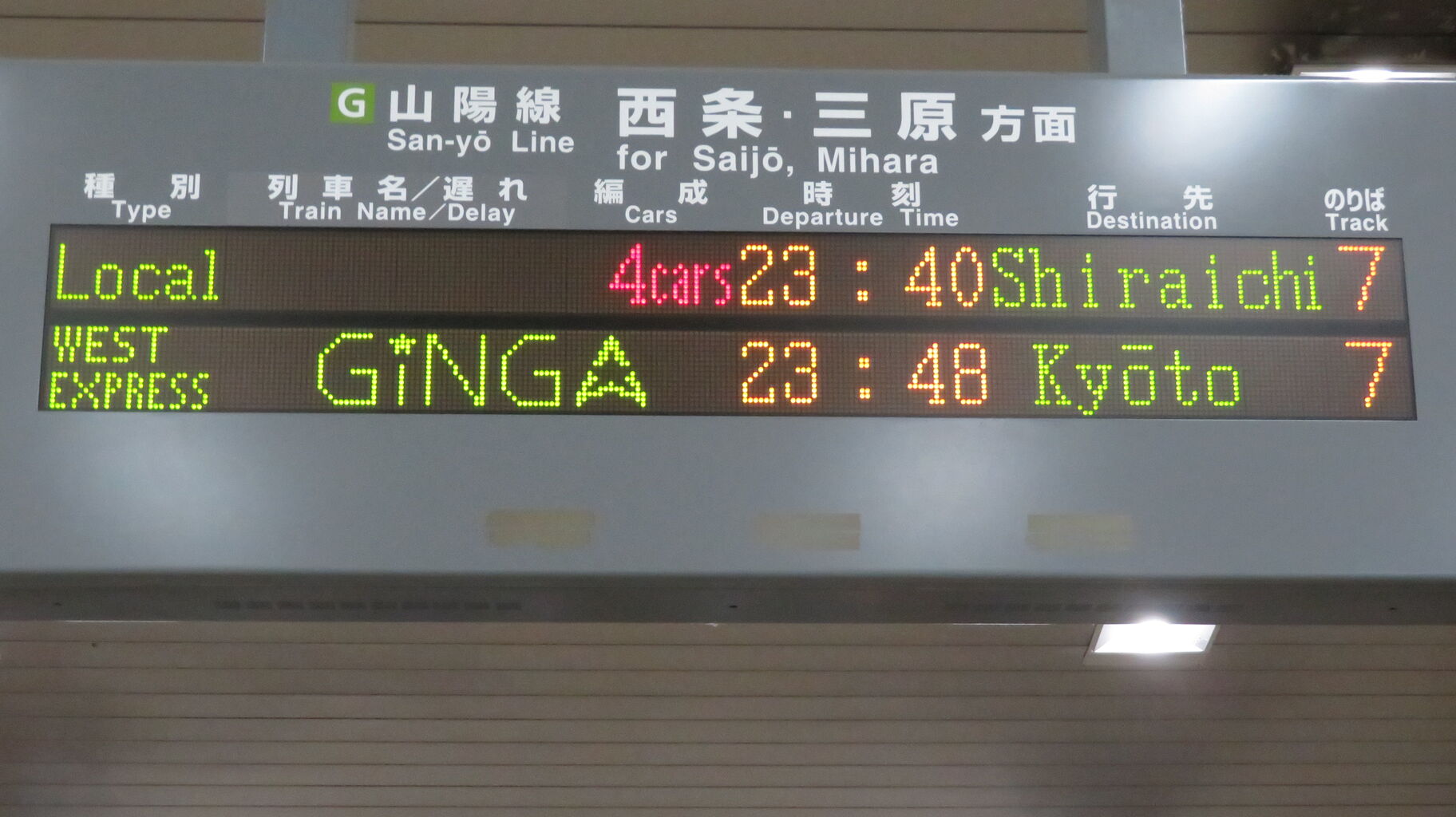 下の段に、23時48分に発車する 「WEST EXPRESS 銀河」 京都行きが表示されました。