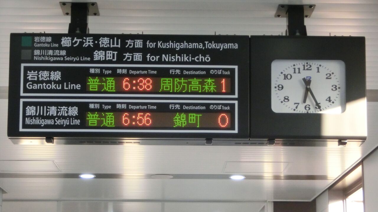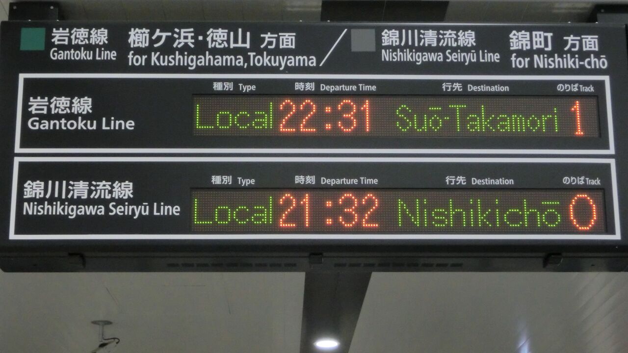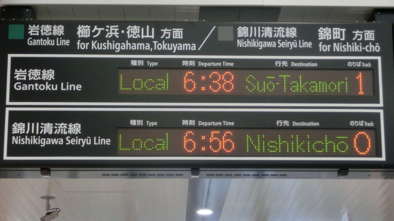 錦町行きの発車後、周防高森行きの表示を拡大して撮影。
