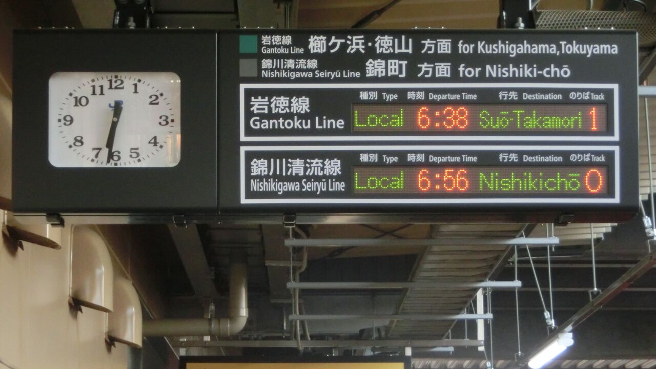 改札口の発車標には、昨日に引き続き 周防高森行きの表示が出ていました。