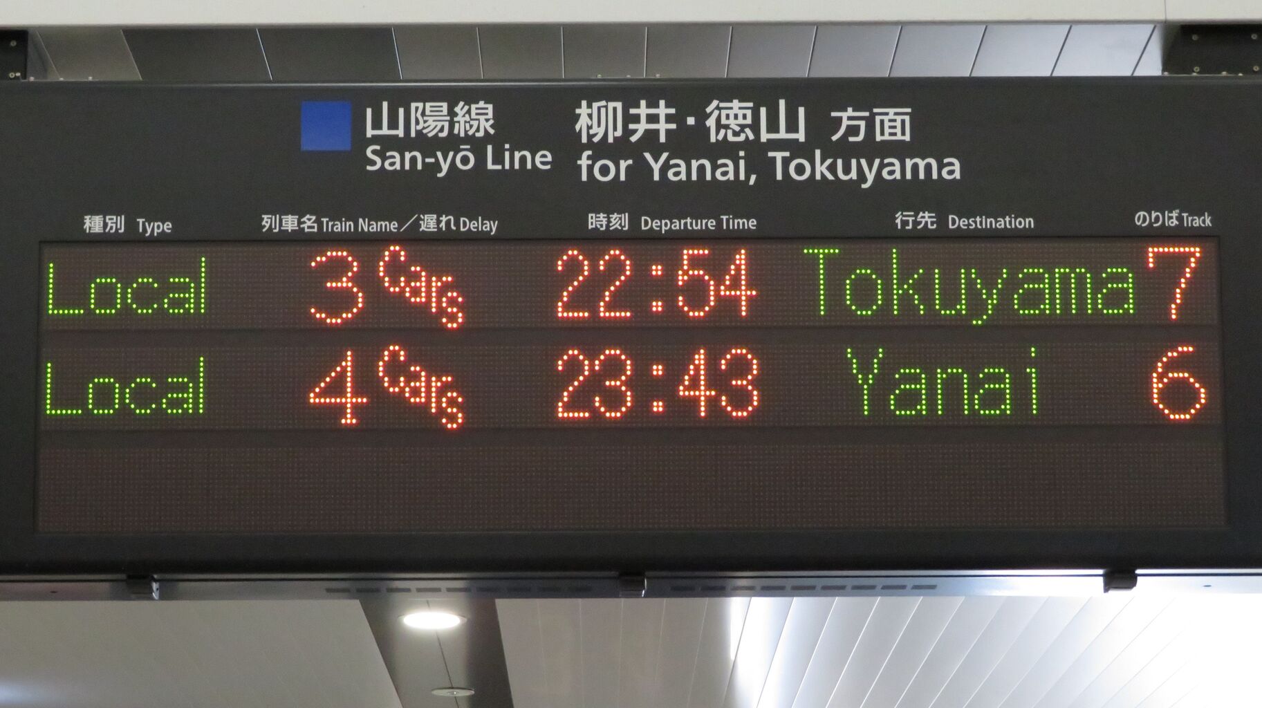 山陽線下り 柳井・徳山方面の発車標を拡大して撮影。