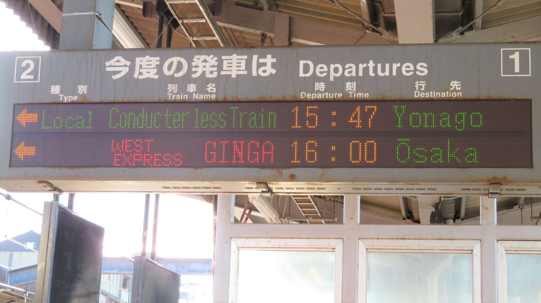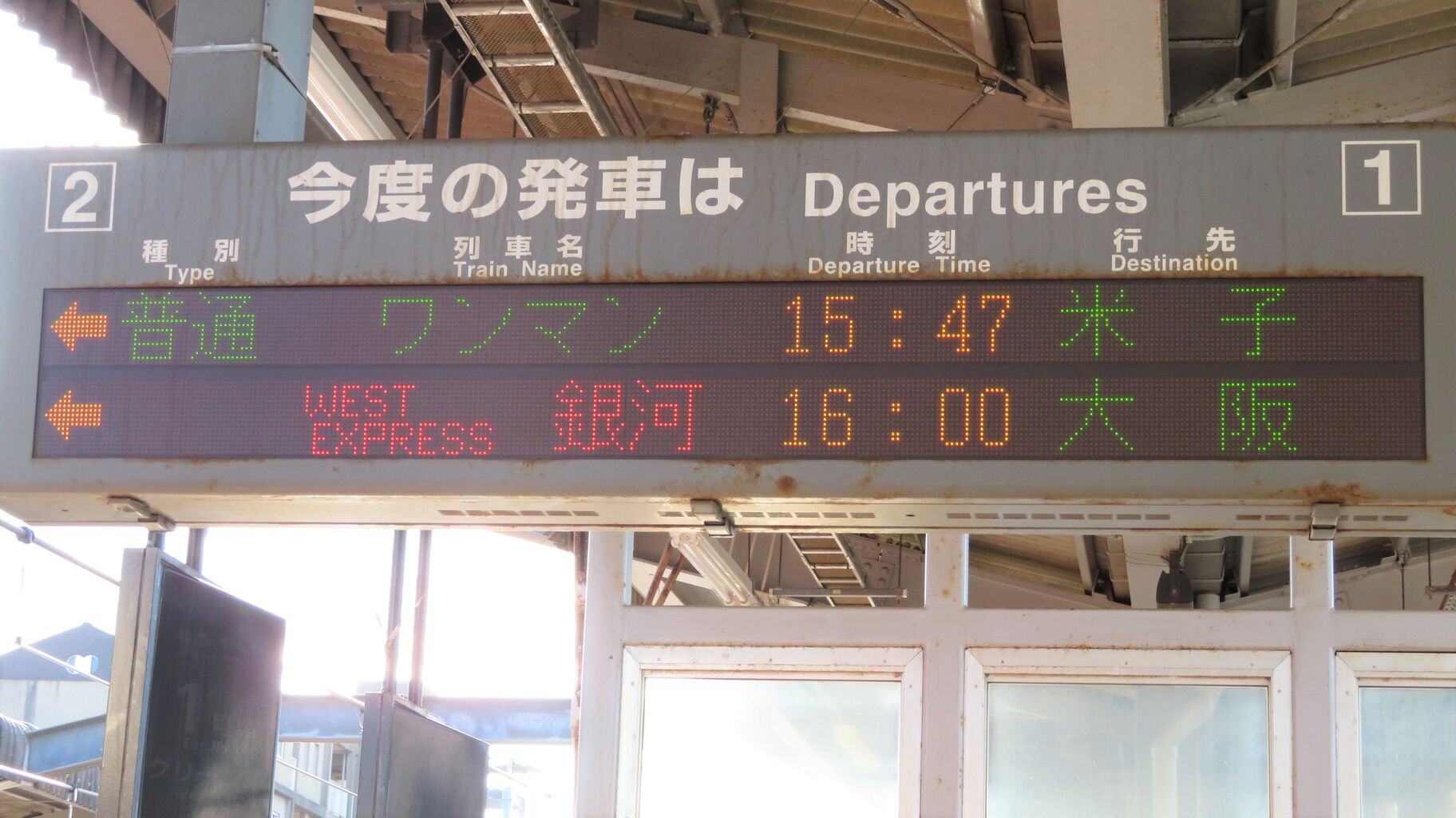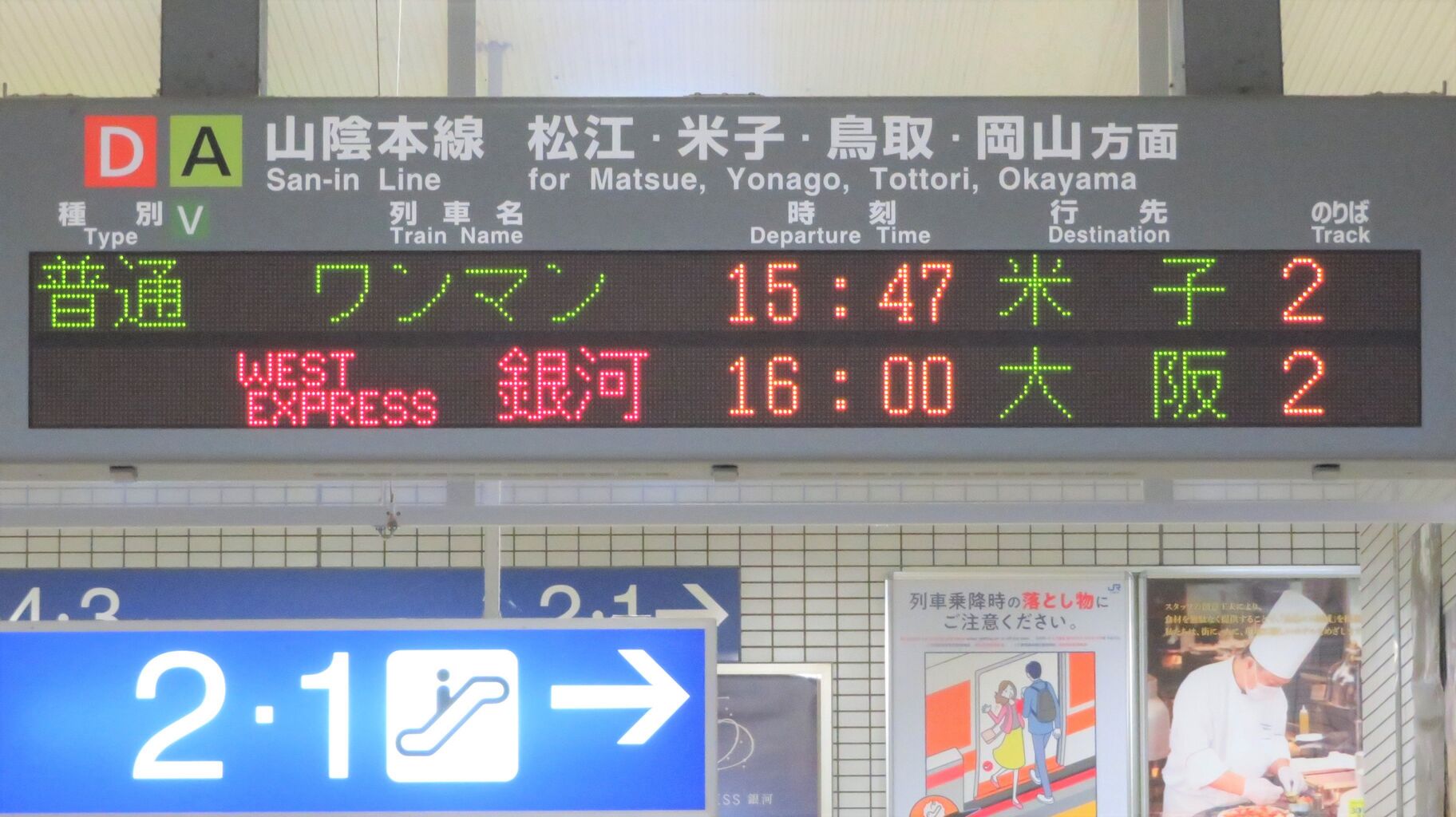 1・2番のりばへ移動し、ホームの東側(米子側)に設置されている発車標を撮影。