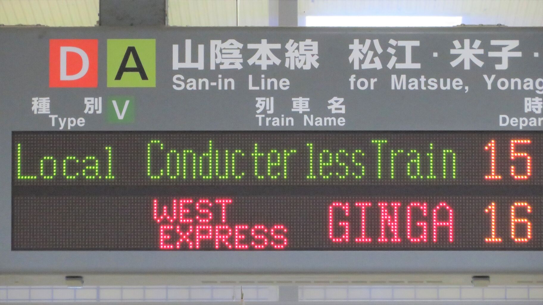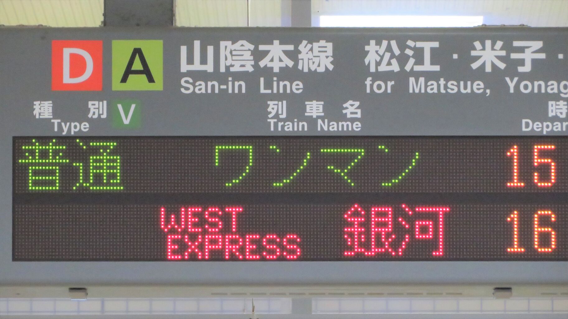 以上、出雲市駅で撮影した WEST EXPRESS 銀河の表示を紹介しました。