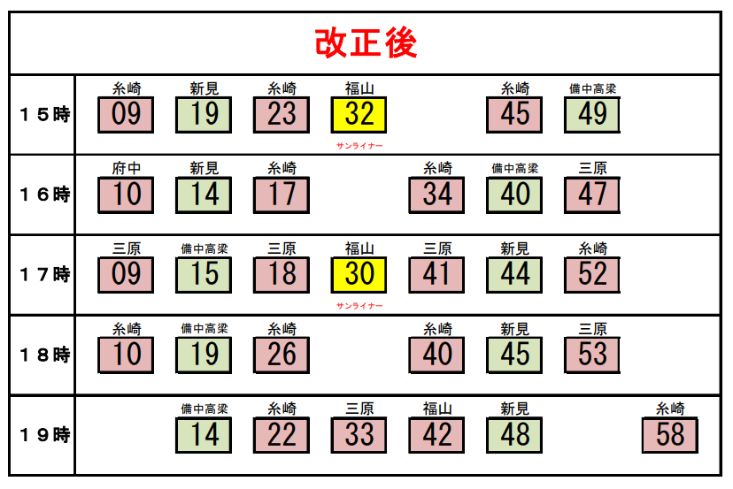 ※上の図は 岡山駅の新旧時刻表(JR西日本ニュースリリースより引用)