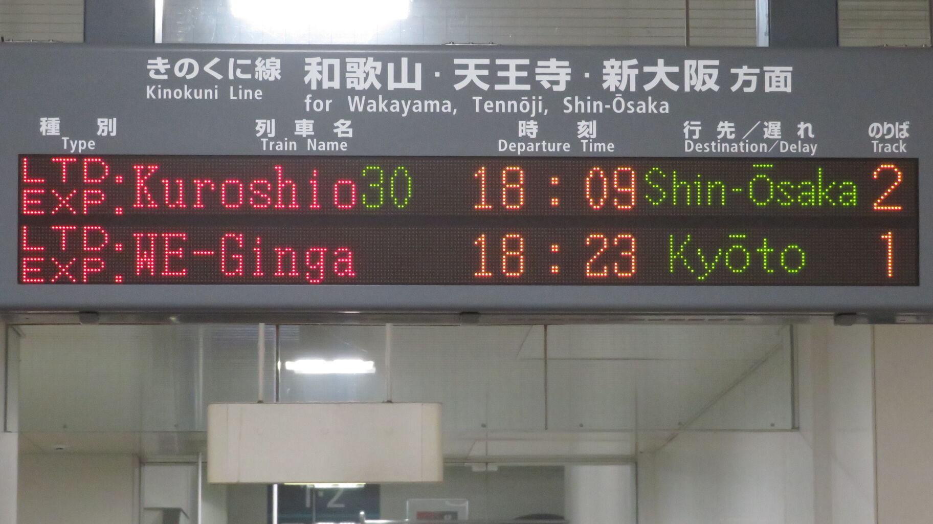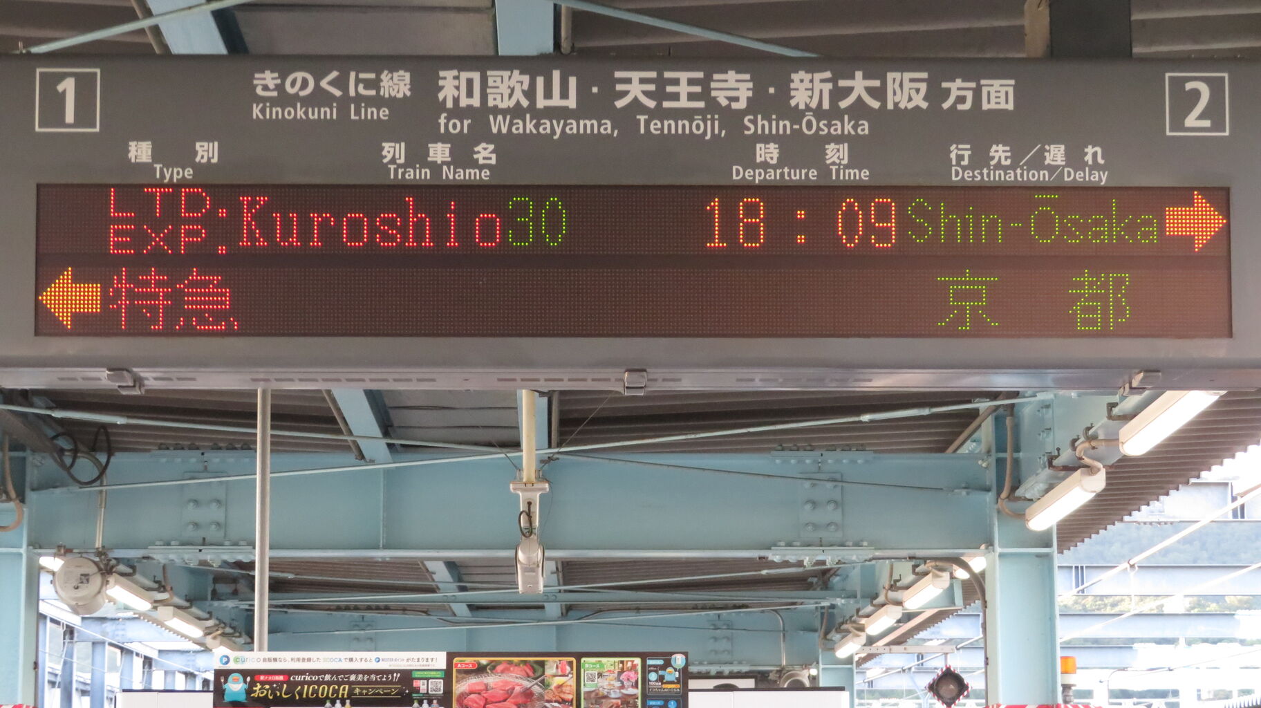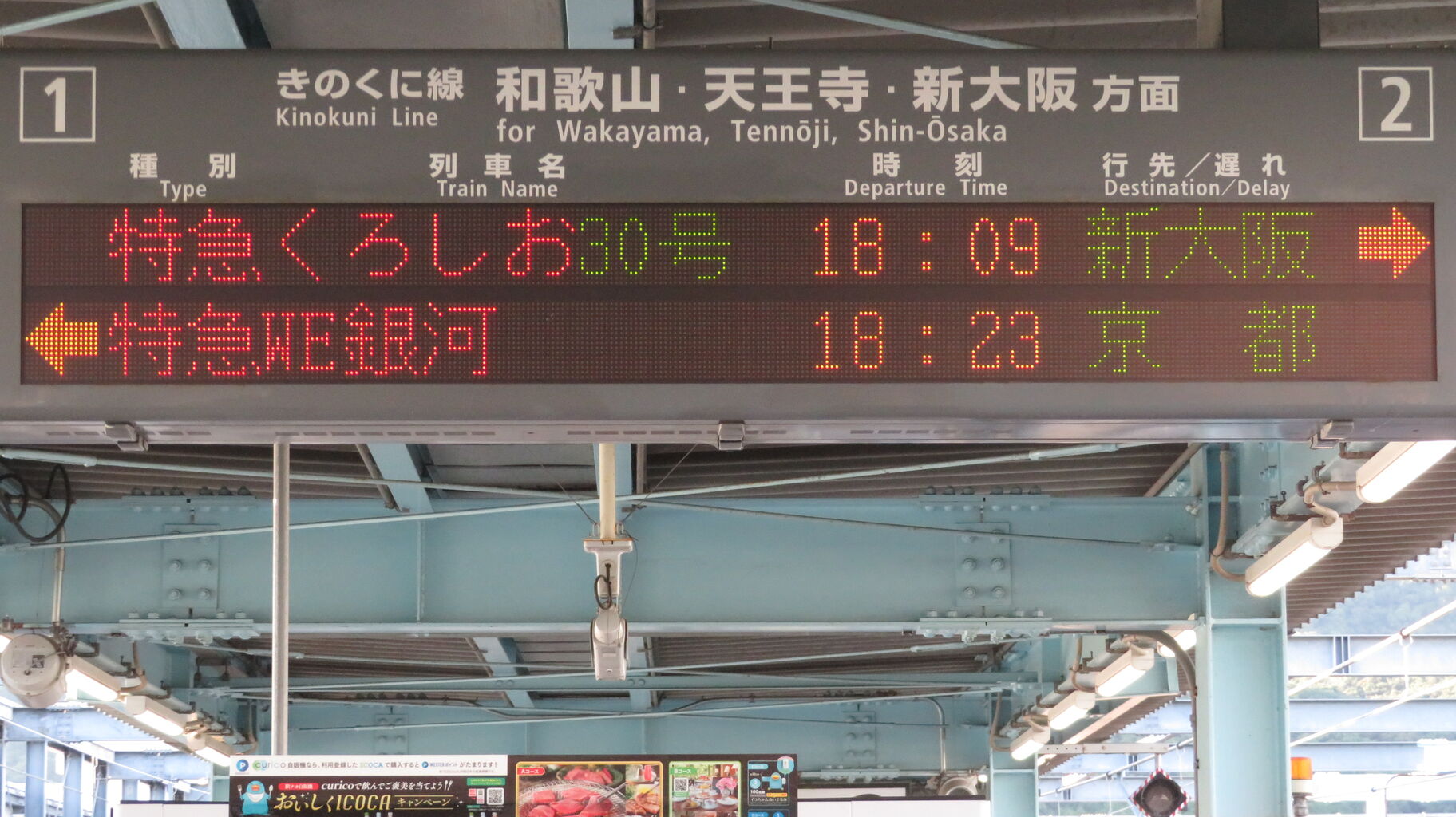 くろしおの発車後、改めてホームの発車標を撮影。