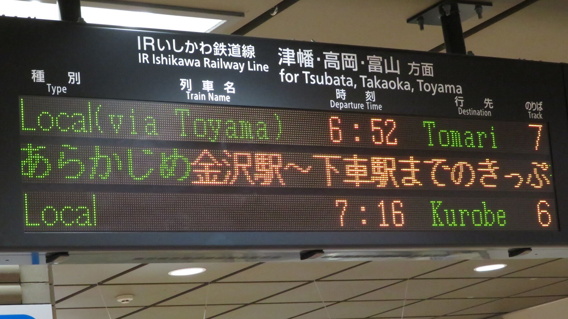 真ん中の段には、「普通(富山方面)の乗車口は、足元の白色2~5番です。」 とスクロール表示が流れていました。