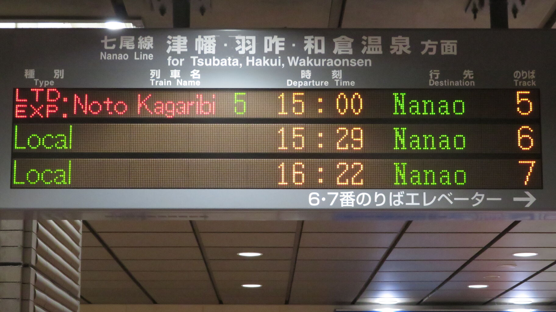 金沢駅を18時台に発車する能登かがり火は、3月16日のダイヤ改正後、正式に七尾行きとなりました。