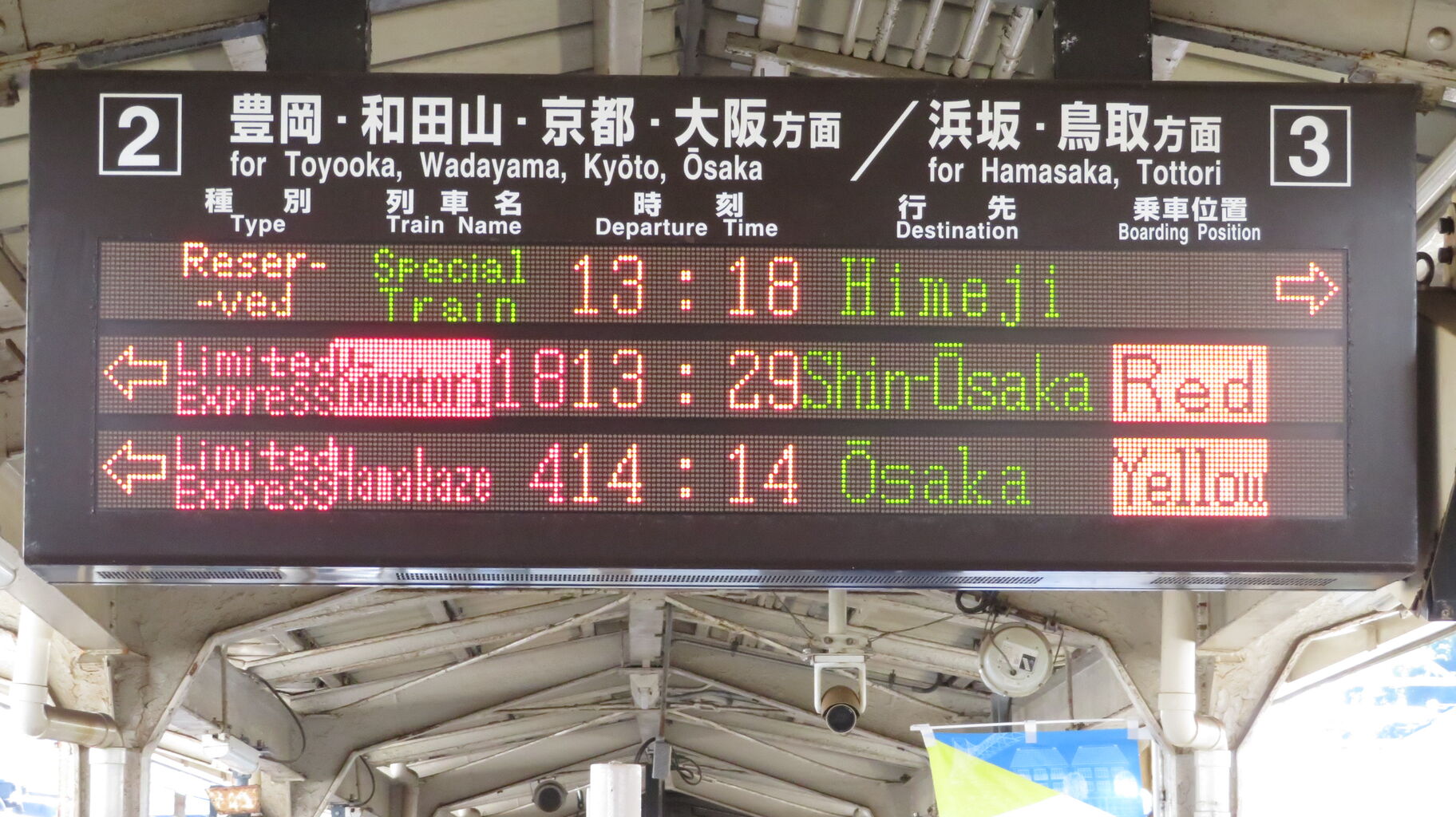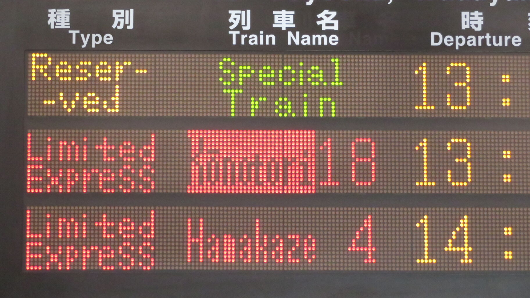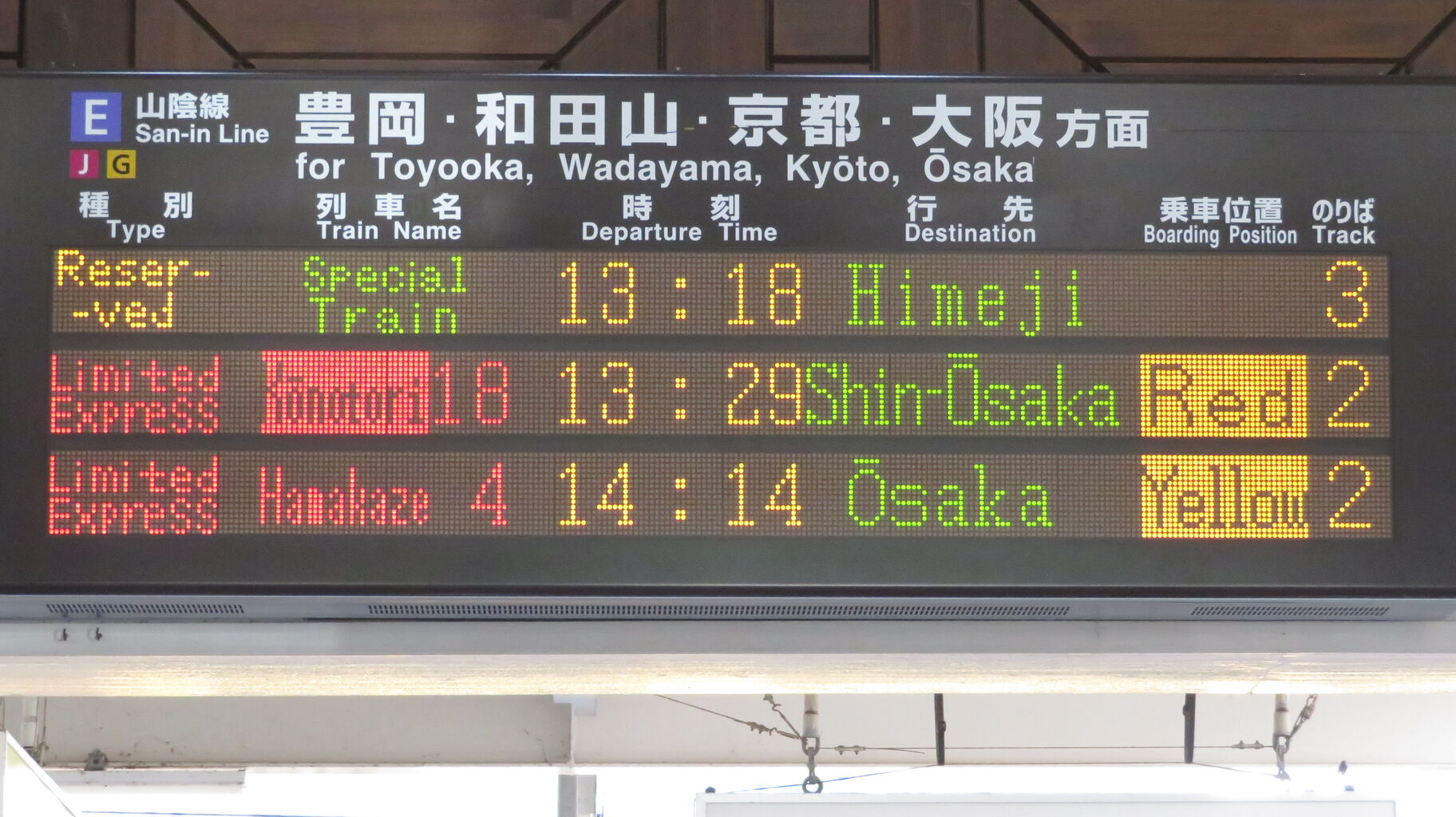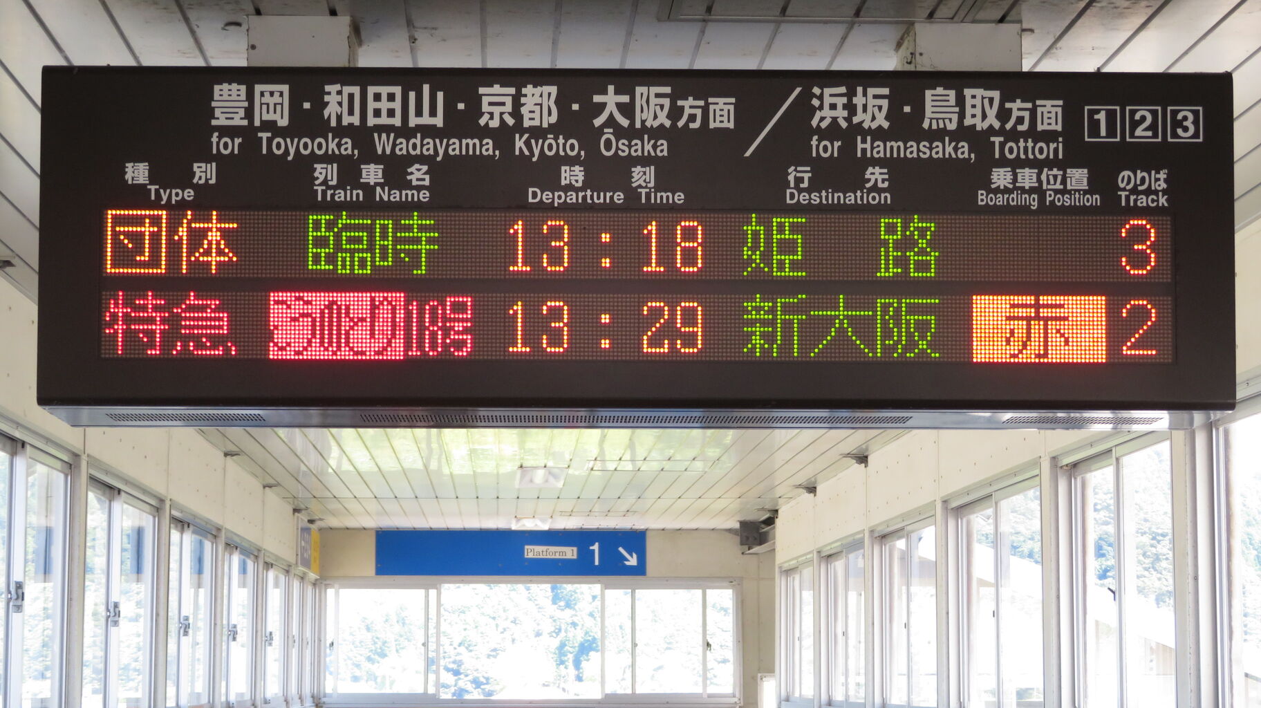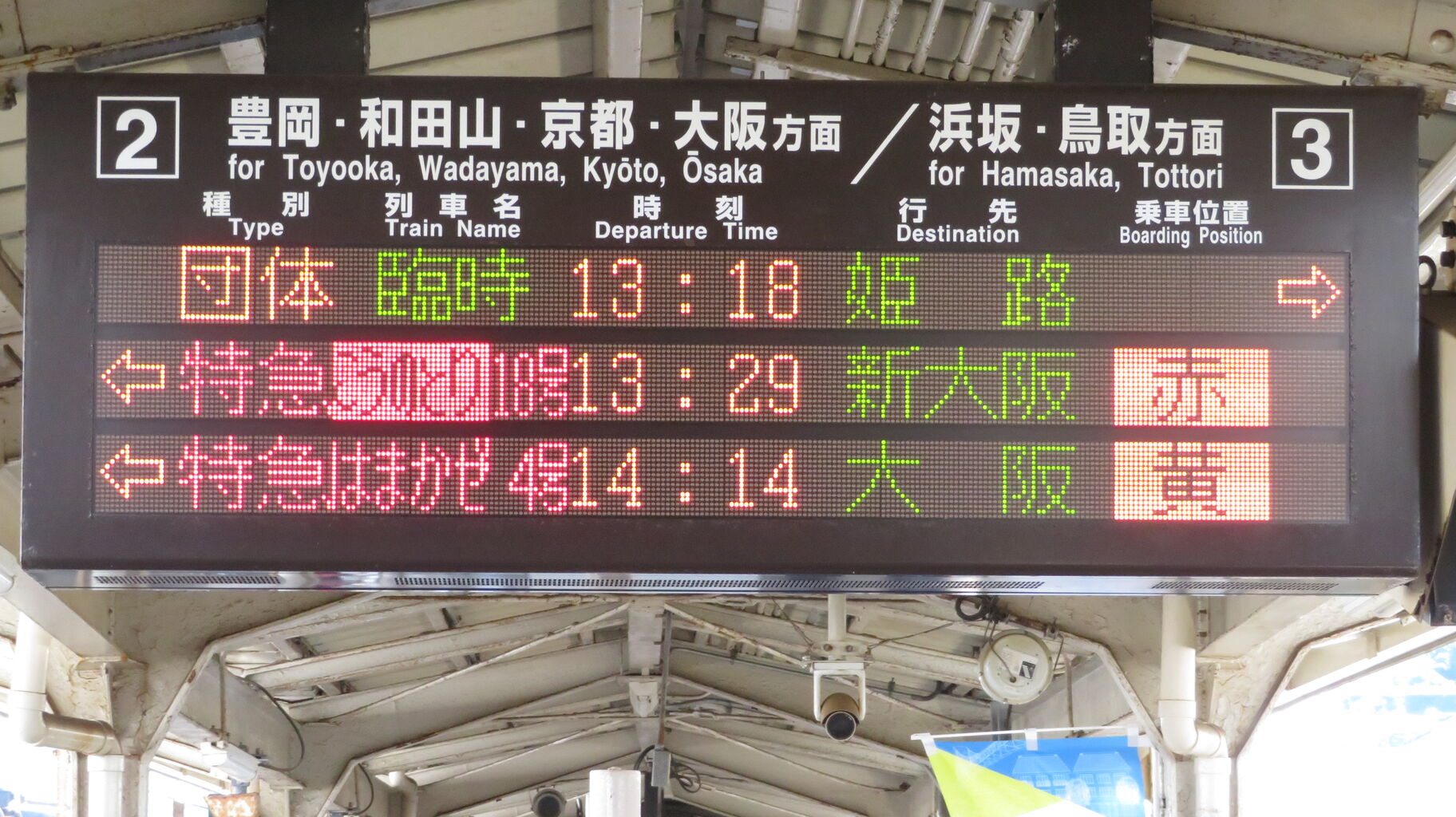 和田山駅や浜坂駅では 発車標の列車名欄に 「兵庫テロワール旅号」 と表示されましたが、この駅では 「臨時」 と表示されていました。