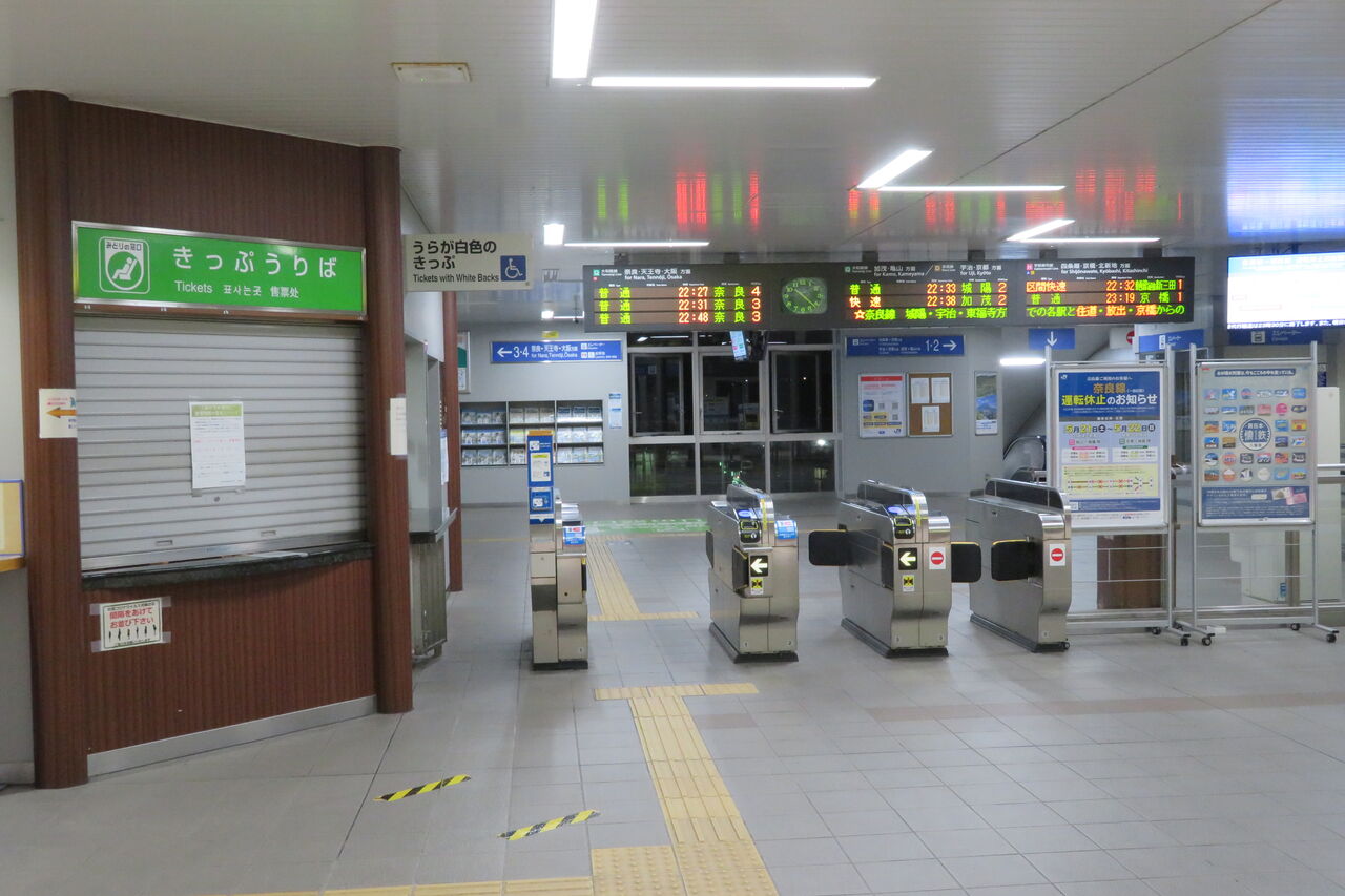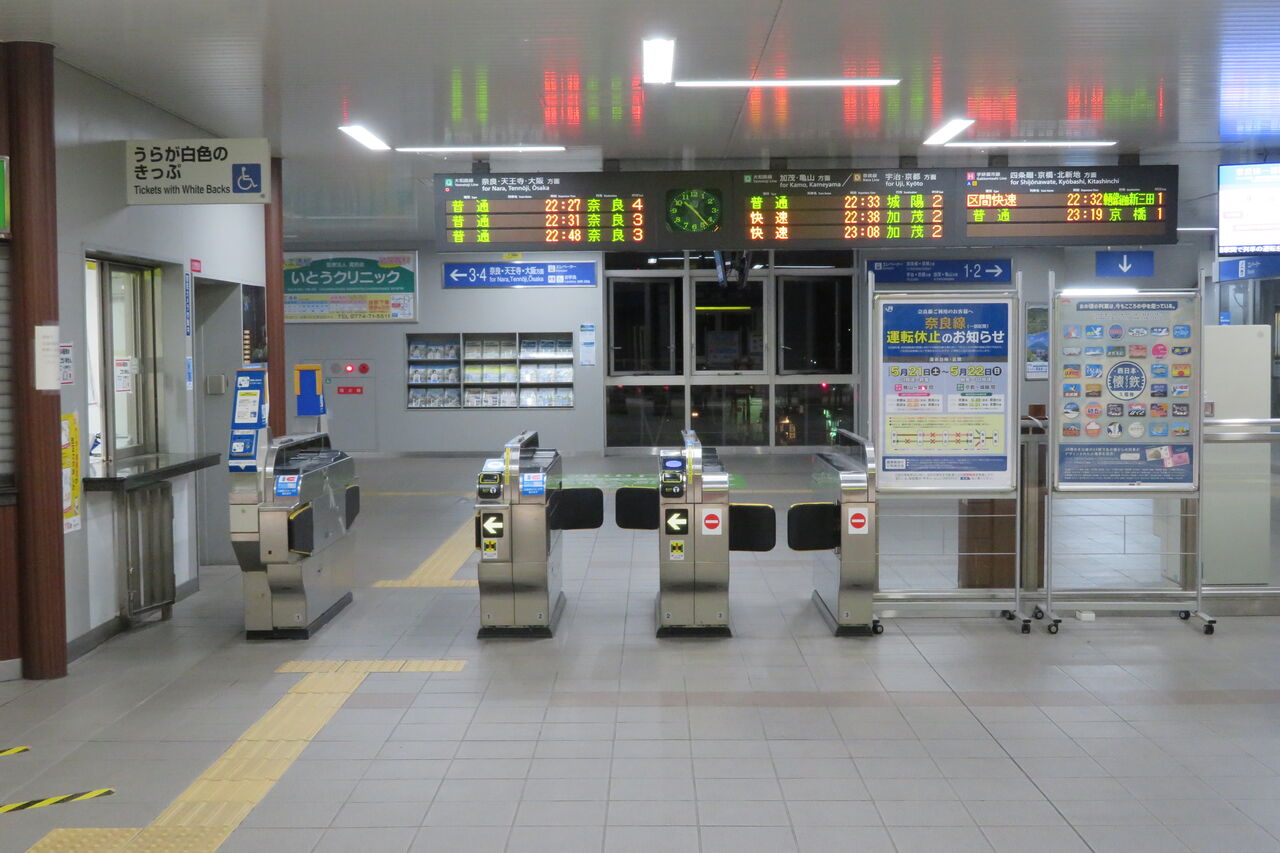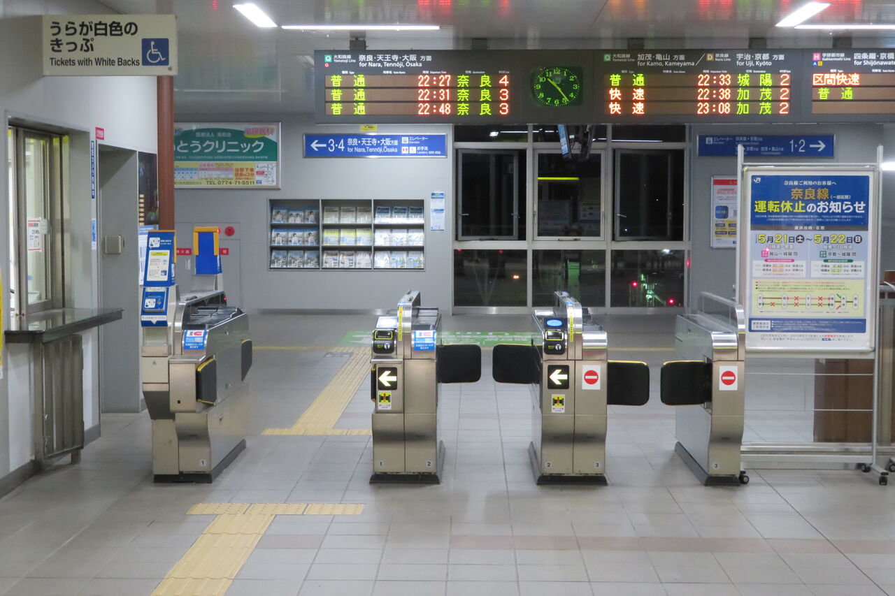 2022年5月の22時台に木津駅を訪れた際、ついでに改札口の様子を撮影しました。