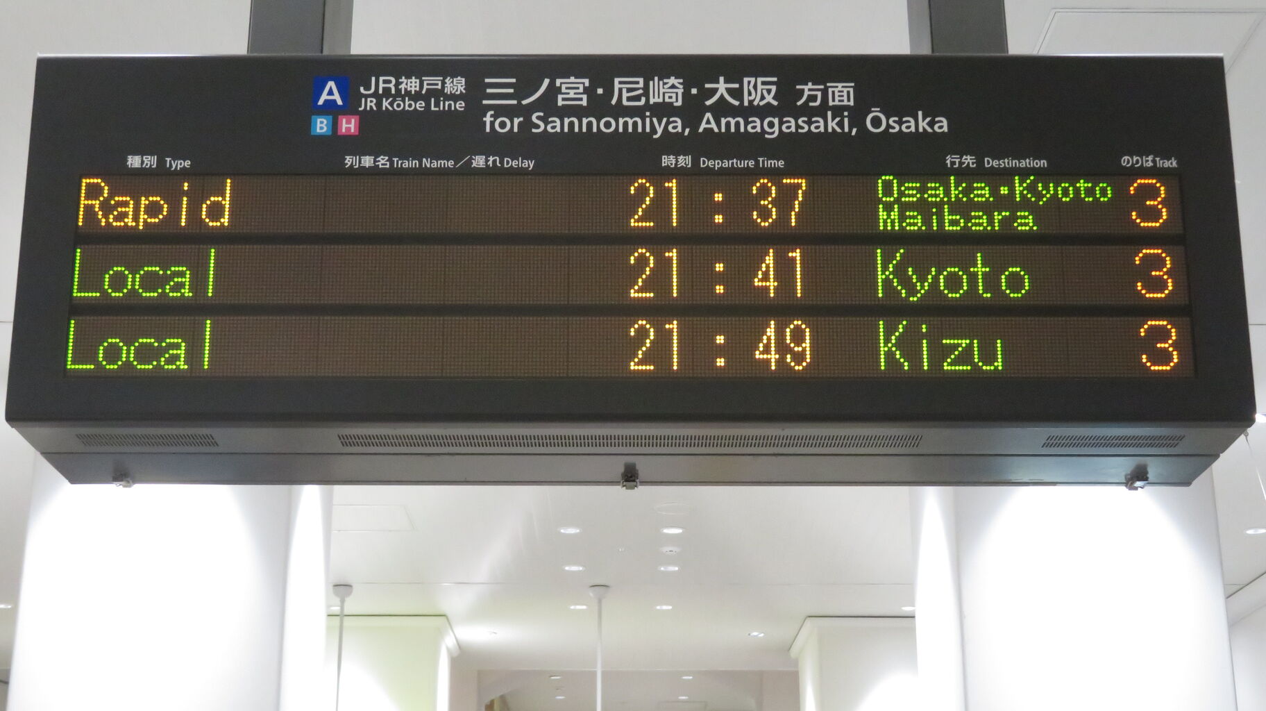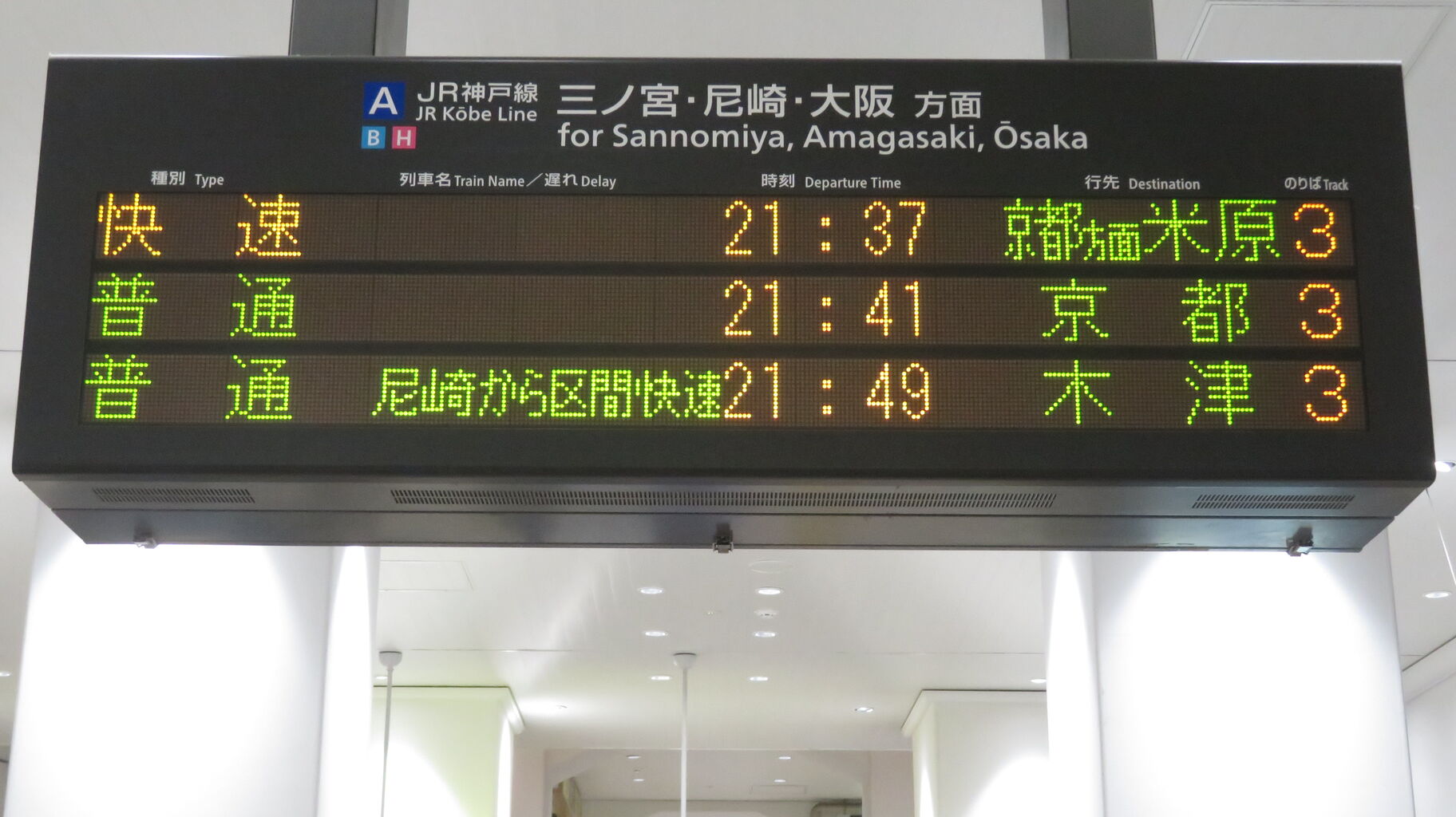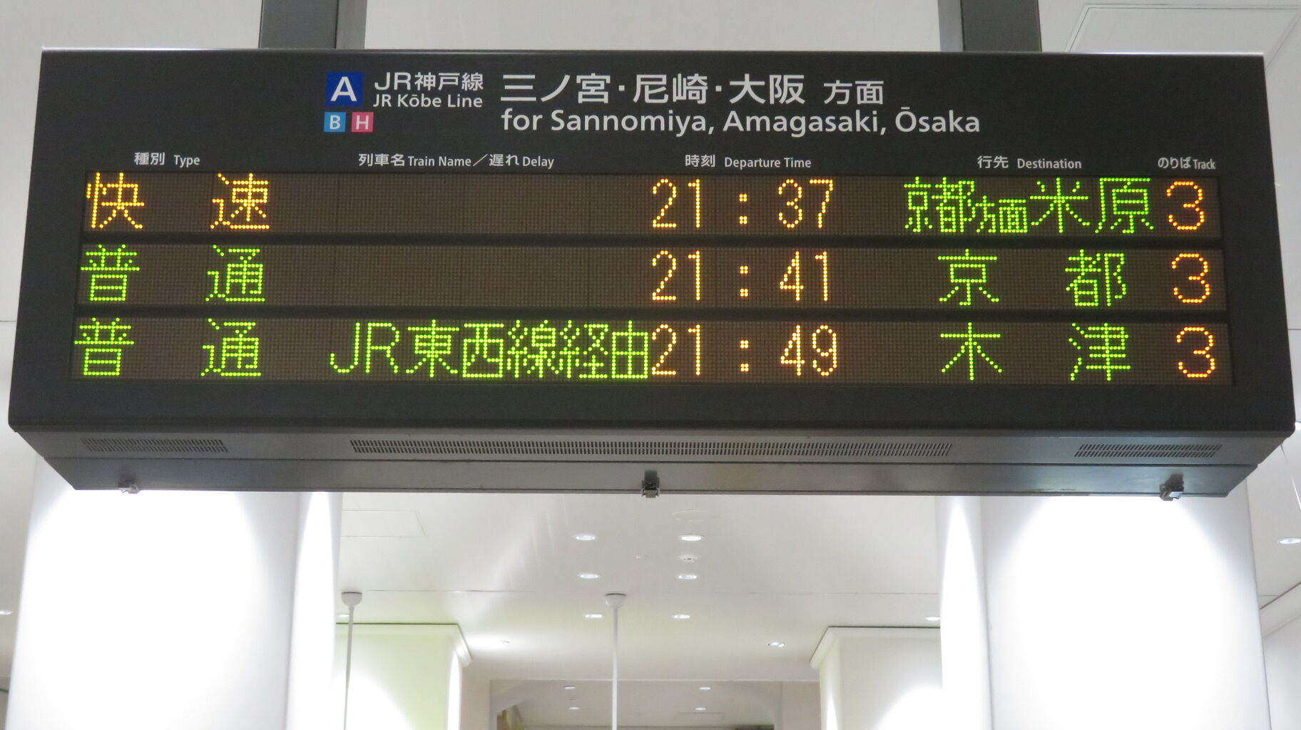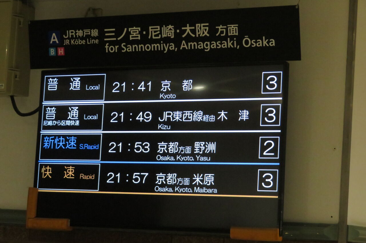 明石駅に設置されているLCD発車標の場合、木津行きは ただ単に 「木津」 と表示されていましたが、神戸駅では 「JR東西線経由 木津」 となっています。