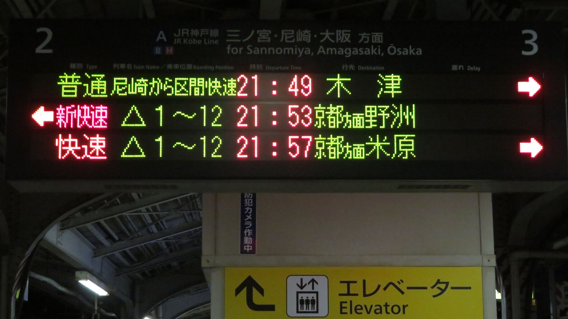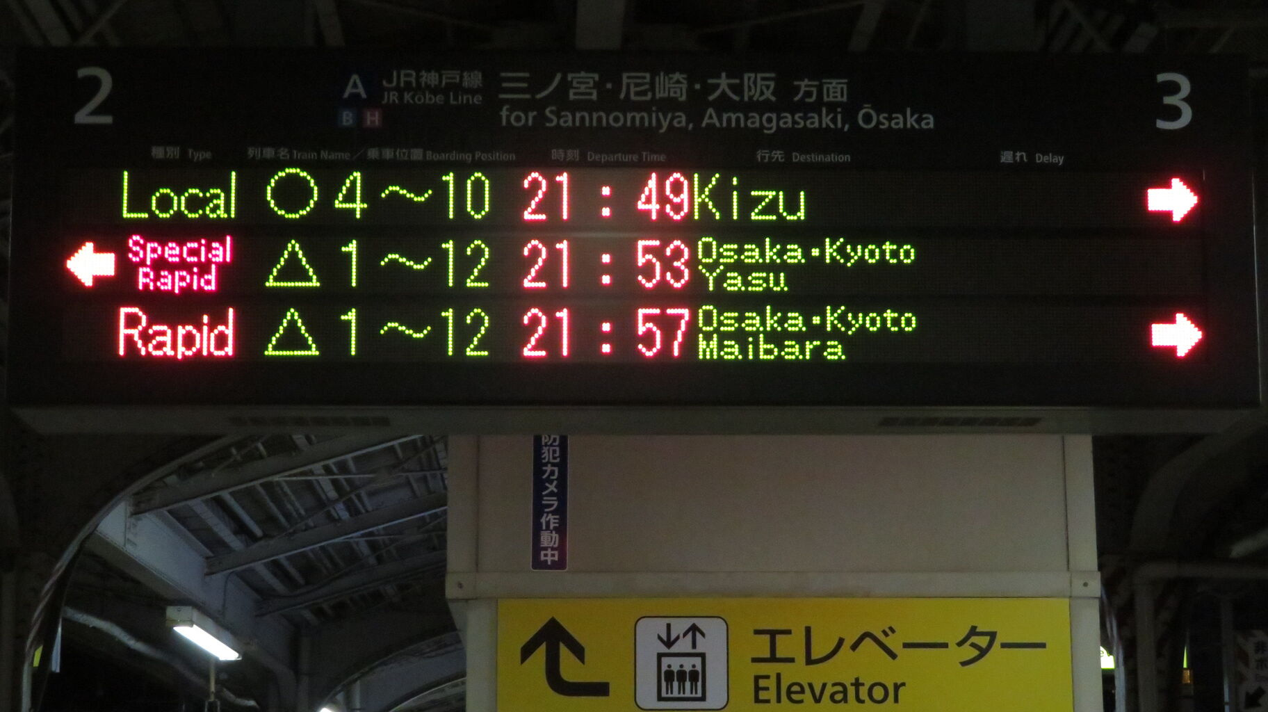 続いて、中央口に設置されている3色LED発車標を撮影。