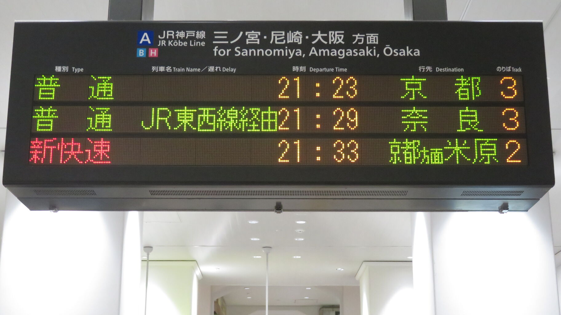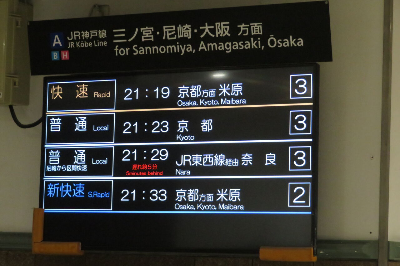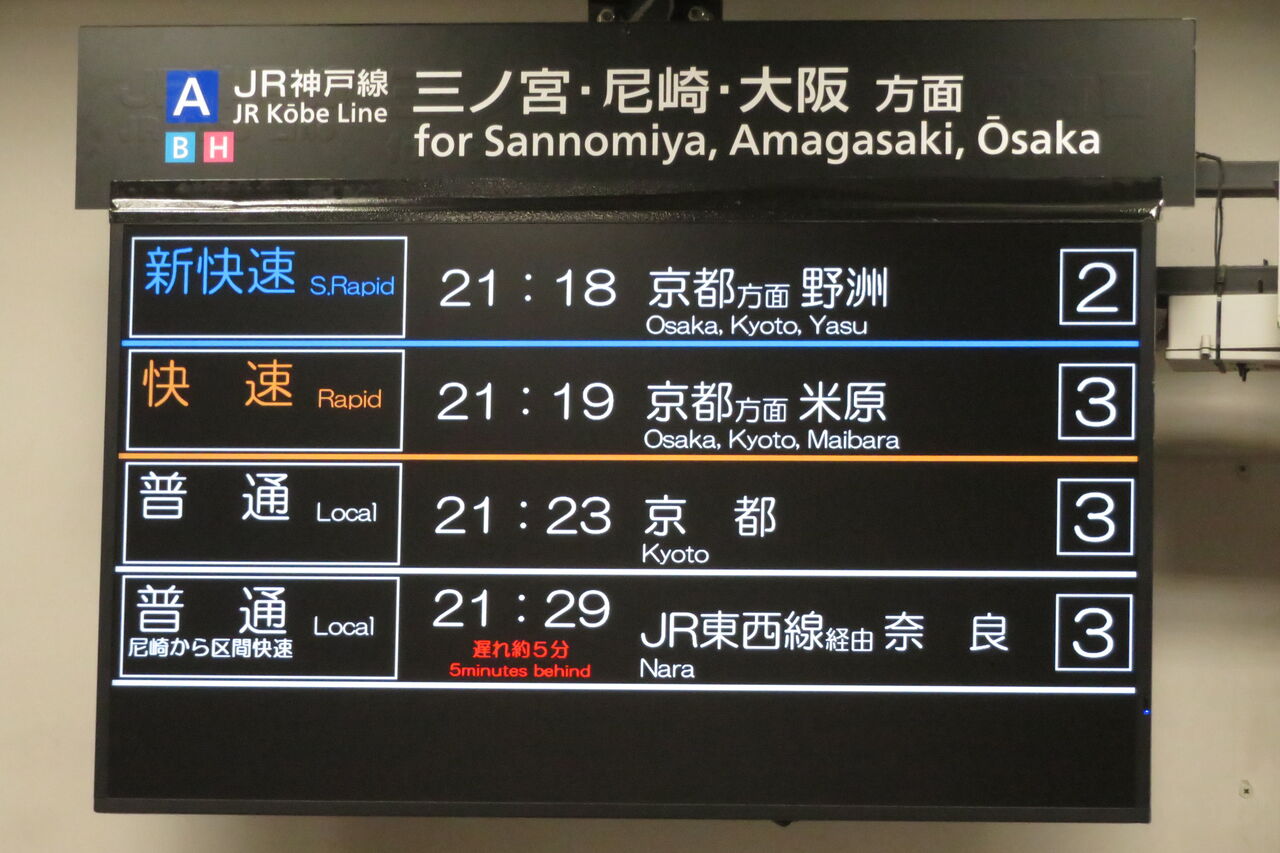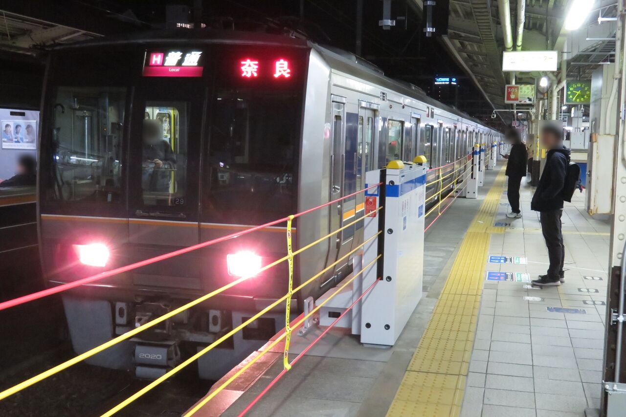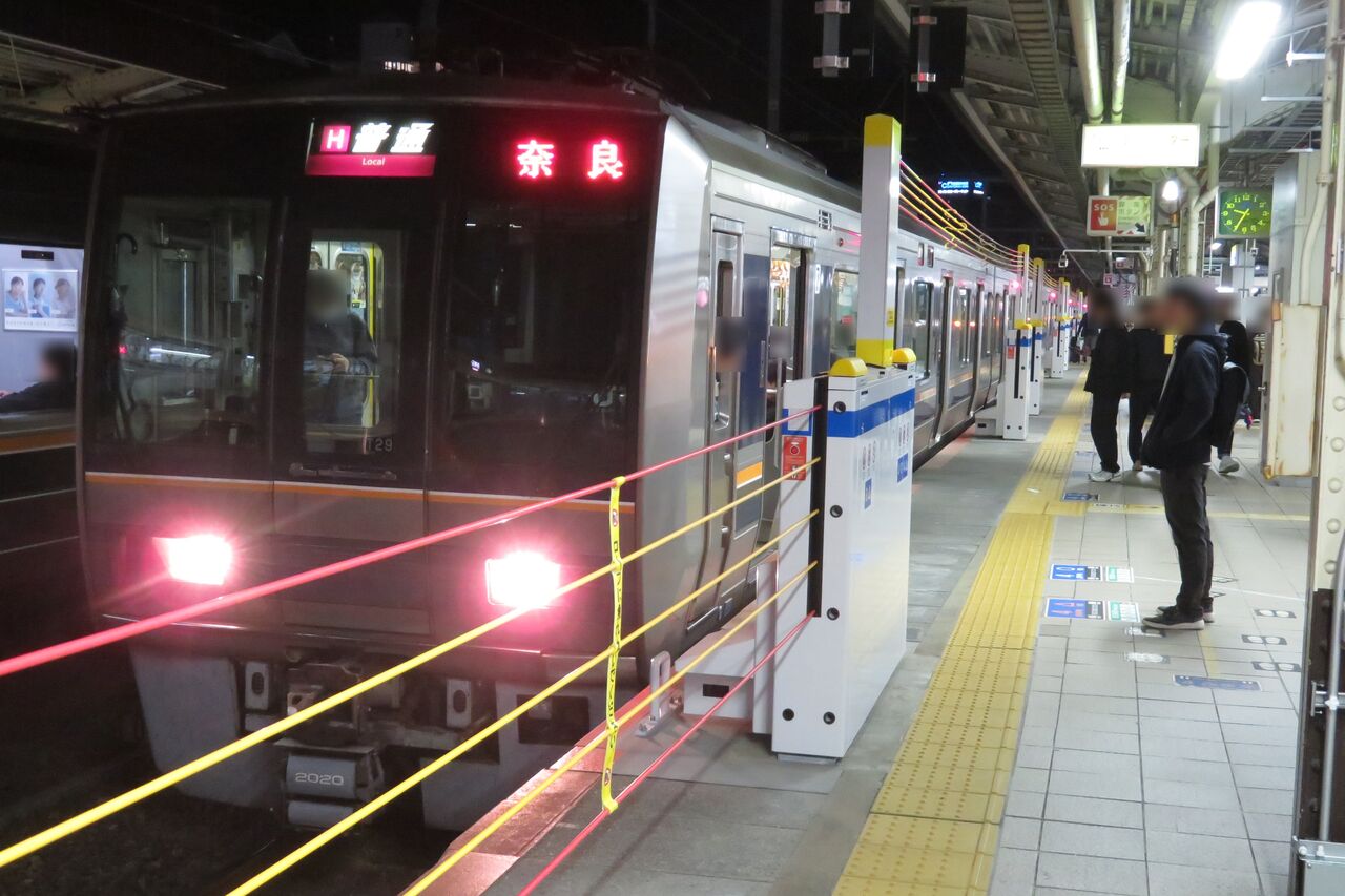この日は普通 奈良行きが6分遅れていたので、21時33分発の新快速 米原行きが先に到着しました。