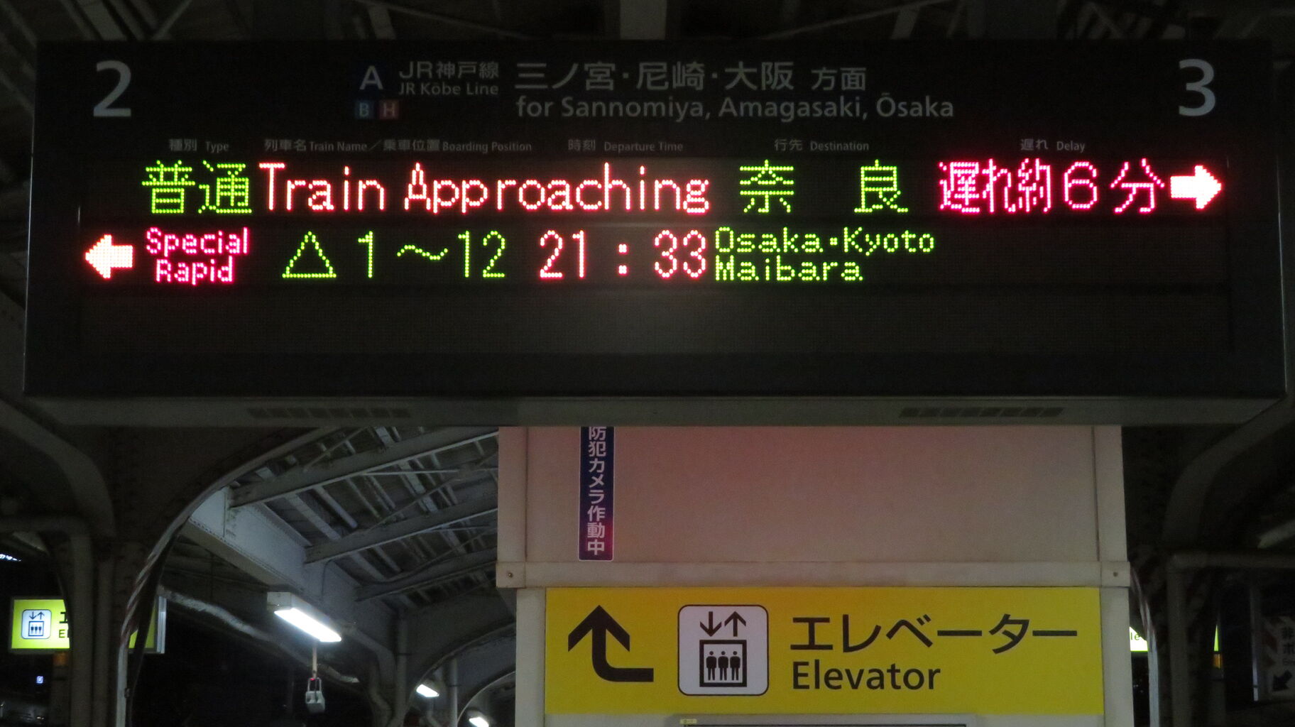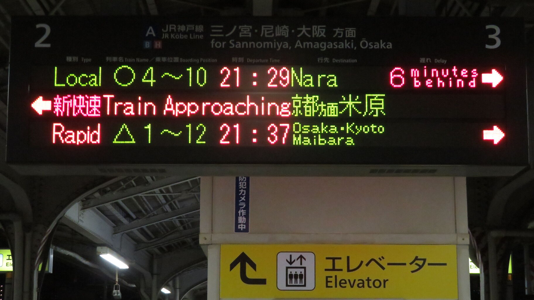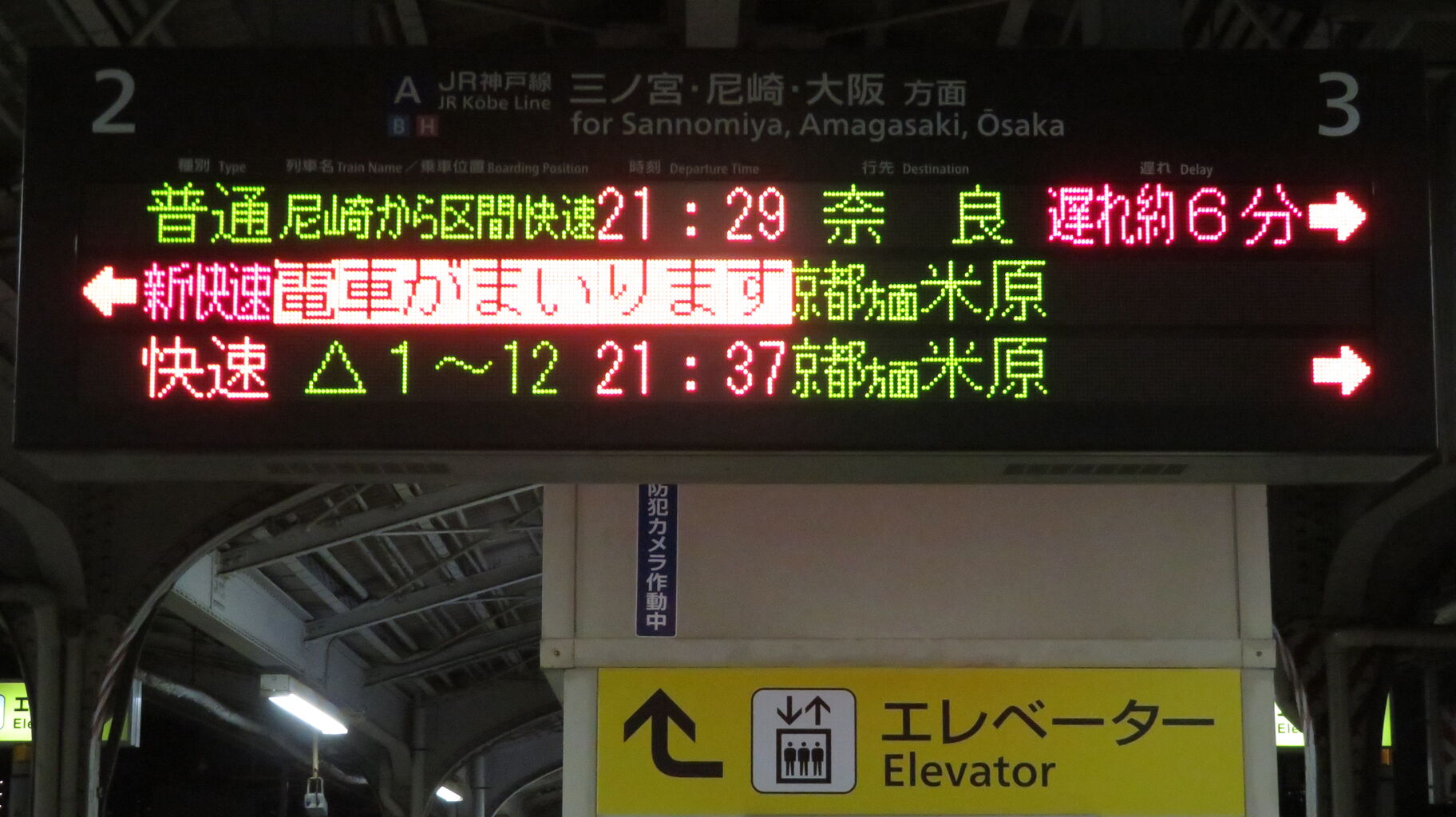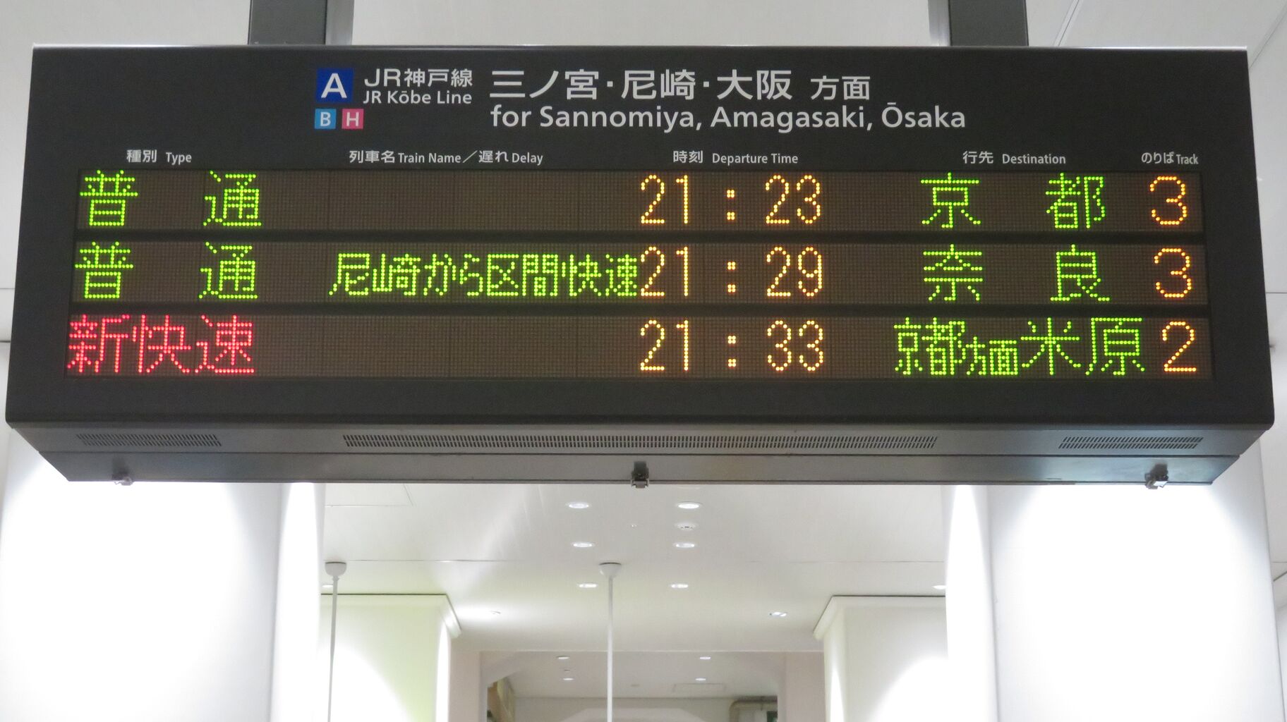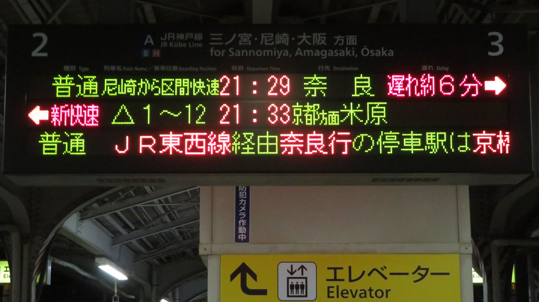 この日は普通 奈良行きが6分遅れていたので、21時33分発の新快速 米原行きが先に到着しました。