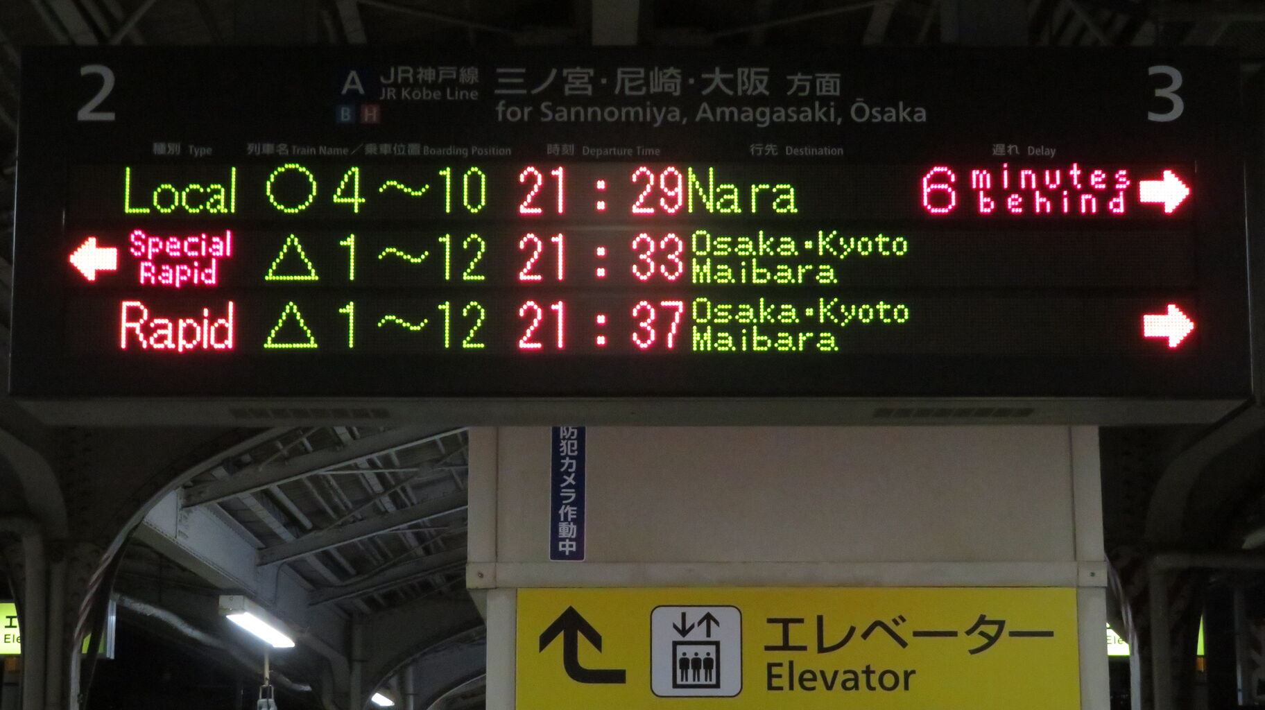 続いて、中央口に設置されている3色LED発車標を撮影。