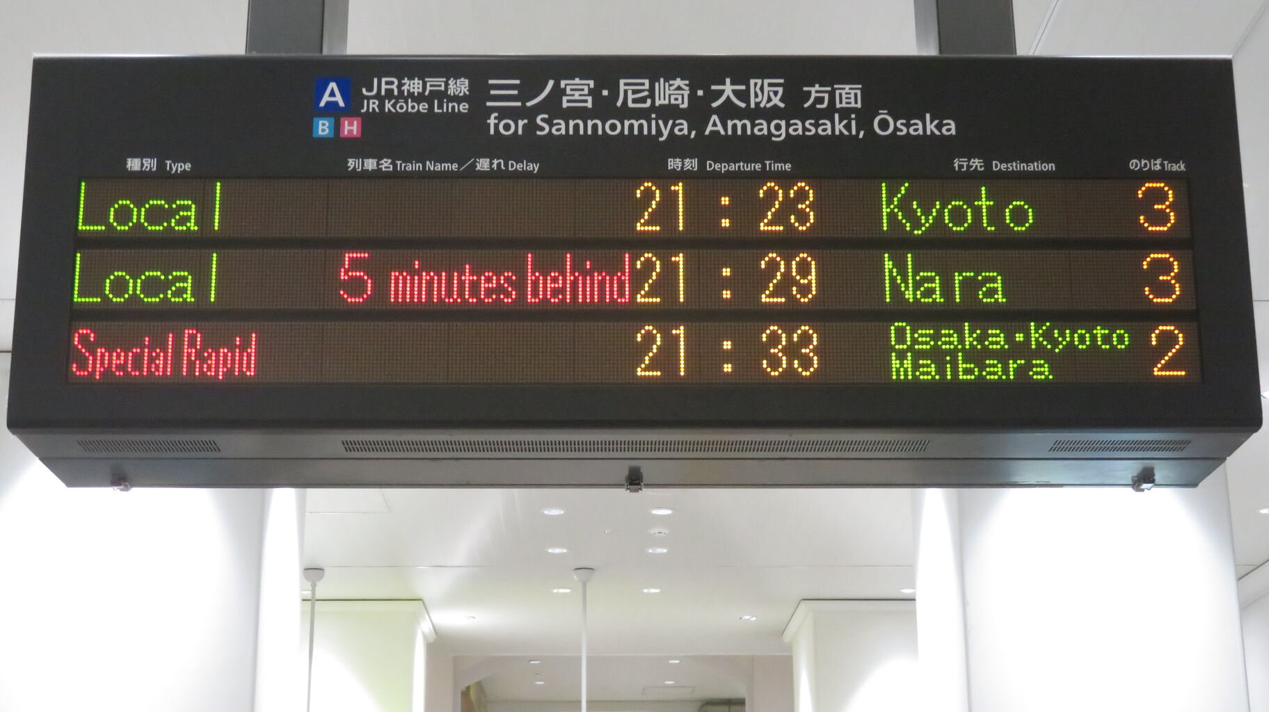 明石駅に設置されているLCD発車標の場合、奈良行きは ただ単に 「奈良」 と表示されていましたが、神戸駅では 「JR東西線経由 奈良」 となっています。