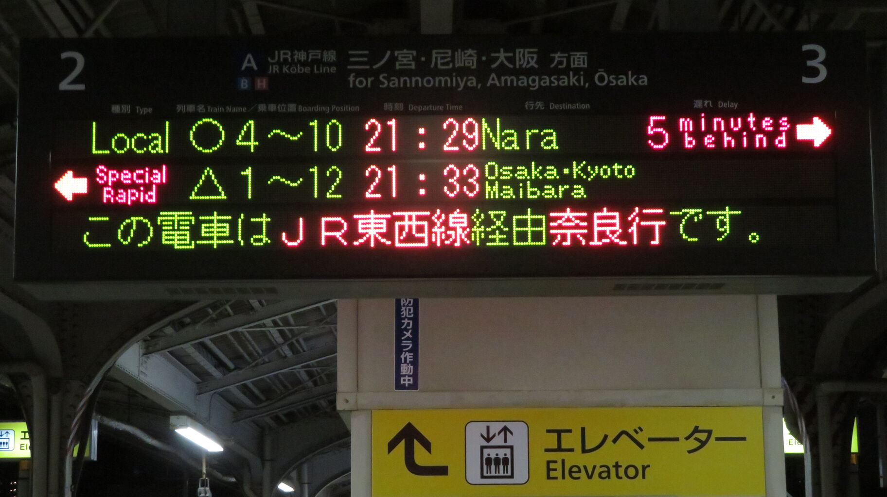 まず、「この電車はJR東西線経由奈良行です。」 と流れます。