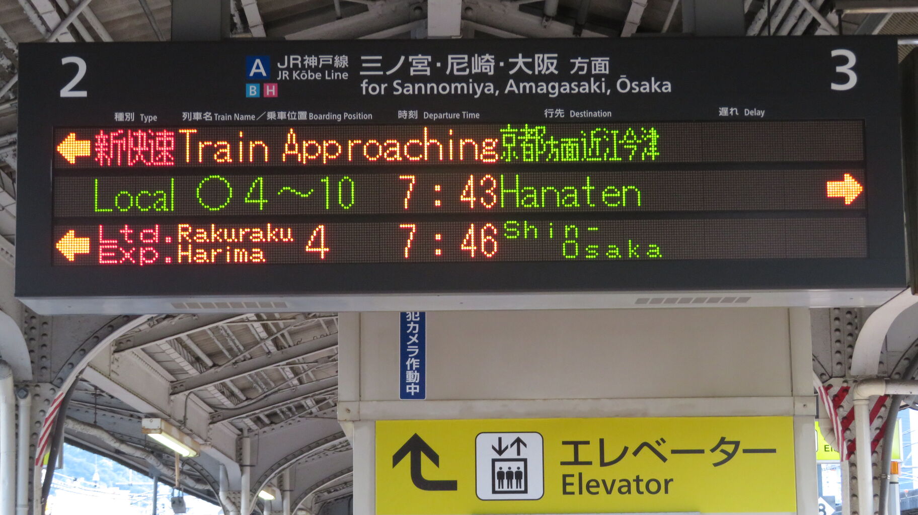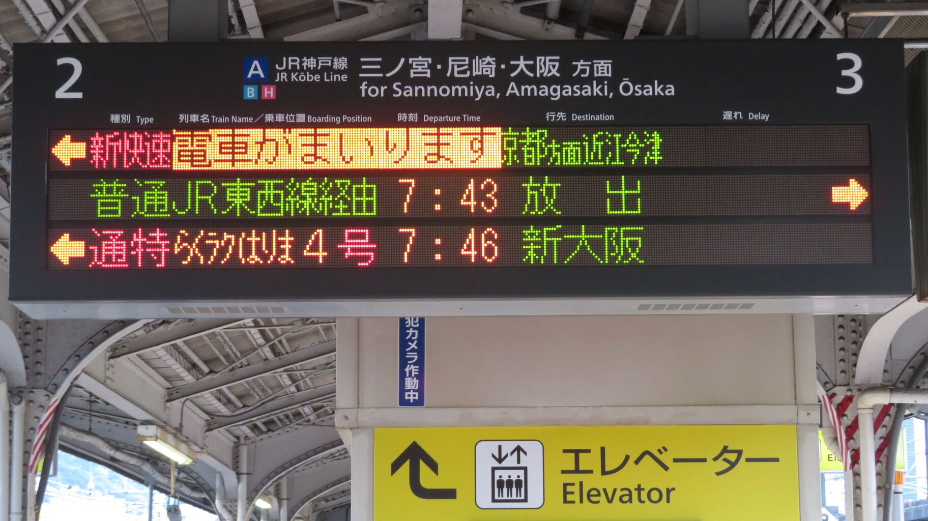 以上、神戸駅で撮影した新快速 「京都方面 近江今津行き」 の表示を紹介しました。