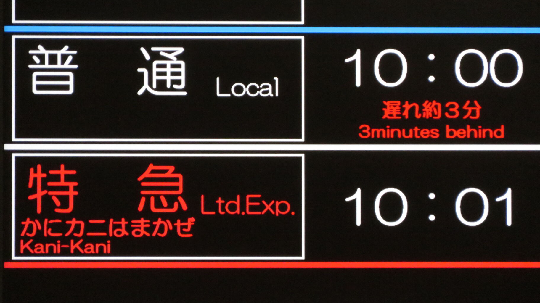 このLCD発車標は、種別の下に列車名が小さく表示されます。