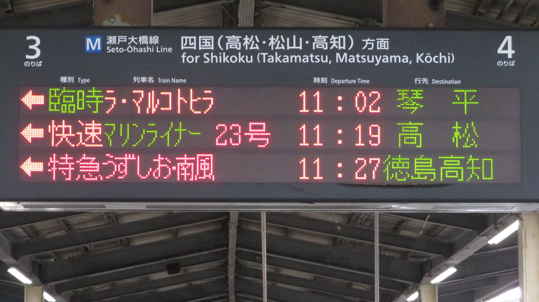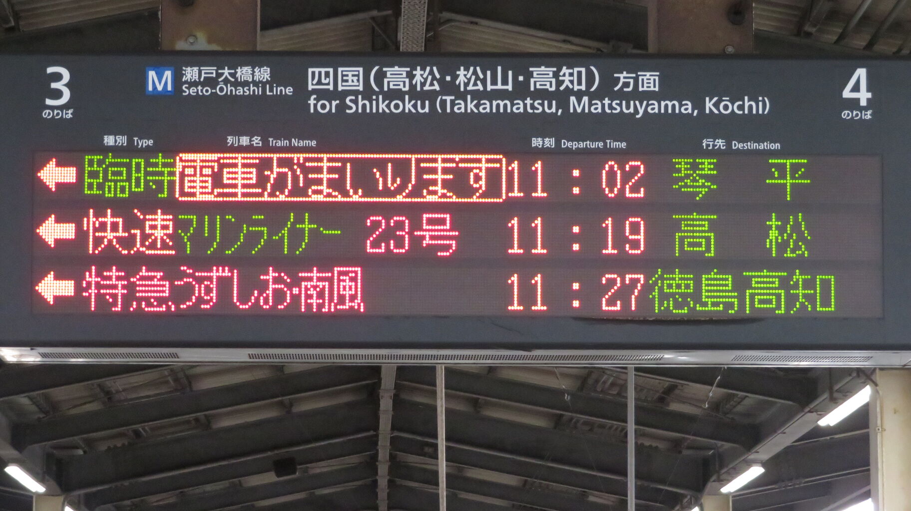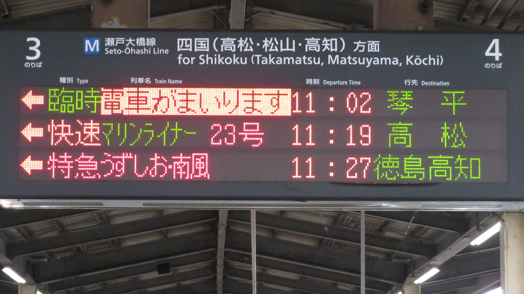 一番下の段には、1日に2本しかない 特急南風・うずしお 「高知・徳島行き」 が表示されています。