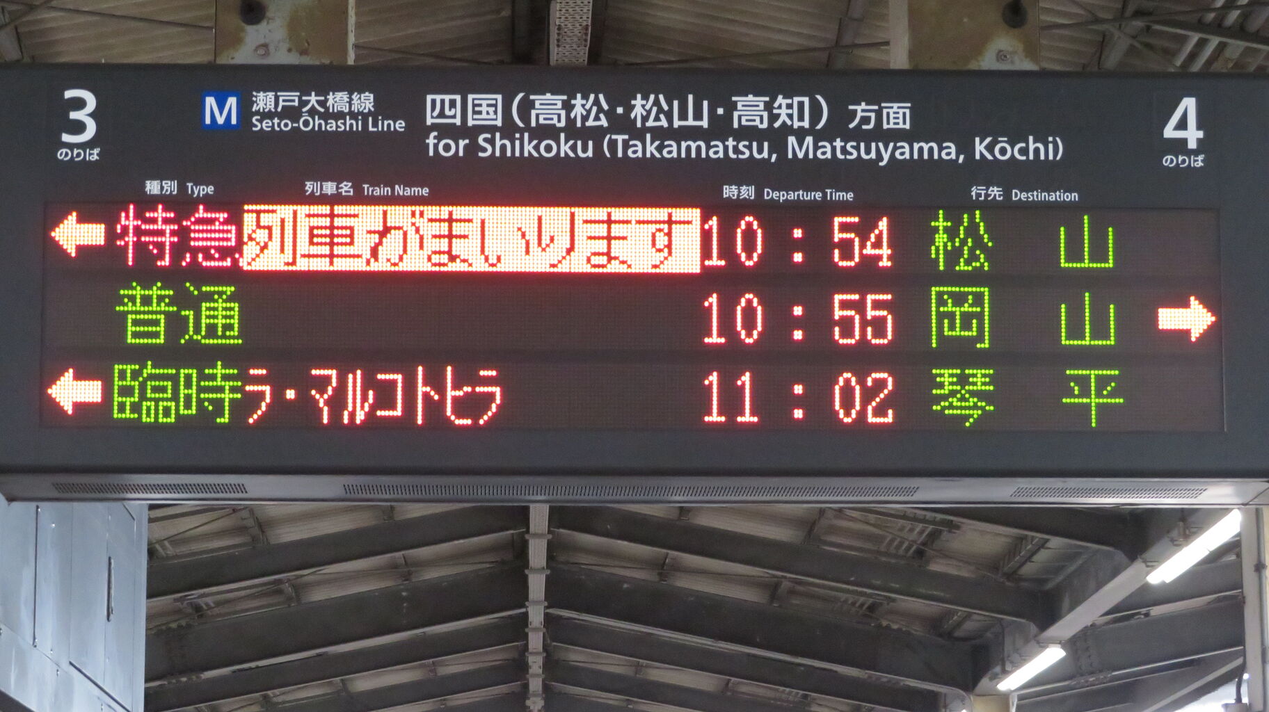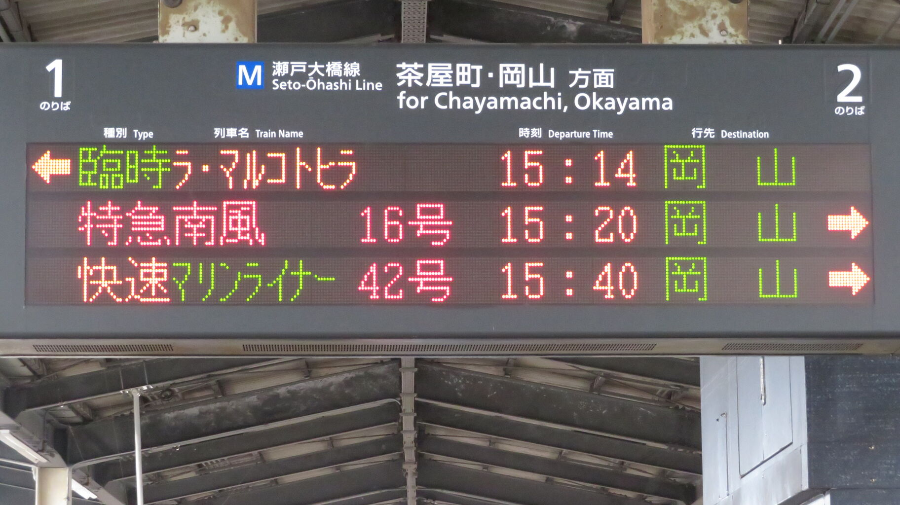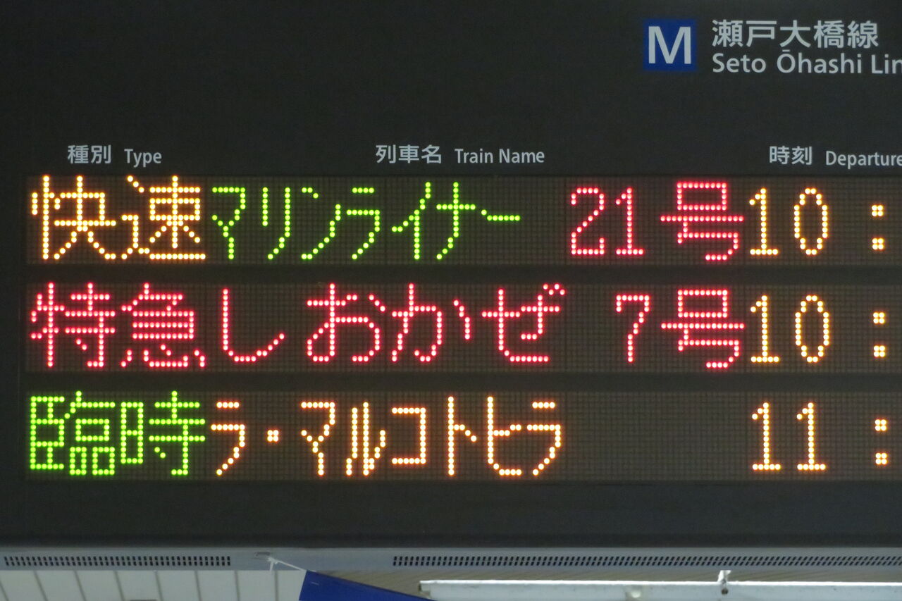 岡山駅の場合、臨時列車が入線する時は 電車であっても 「列車がまいります」 と表示されますが、児島駅では普通・快速電車と同様に 「電車がまいります」 と表示されます。