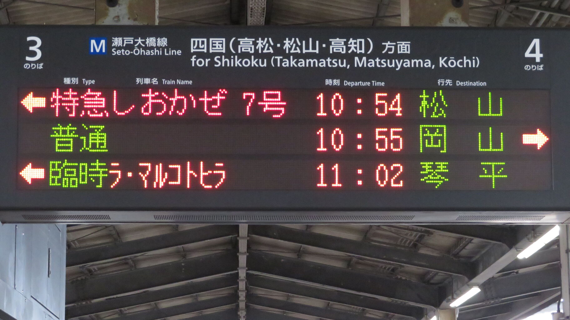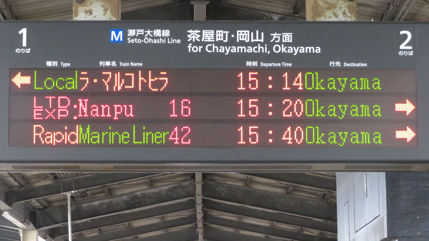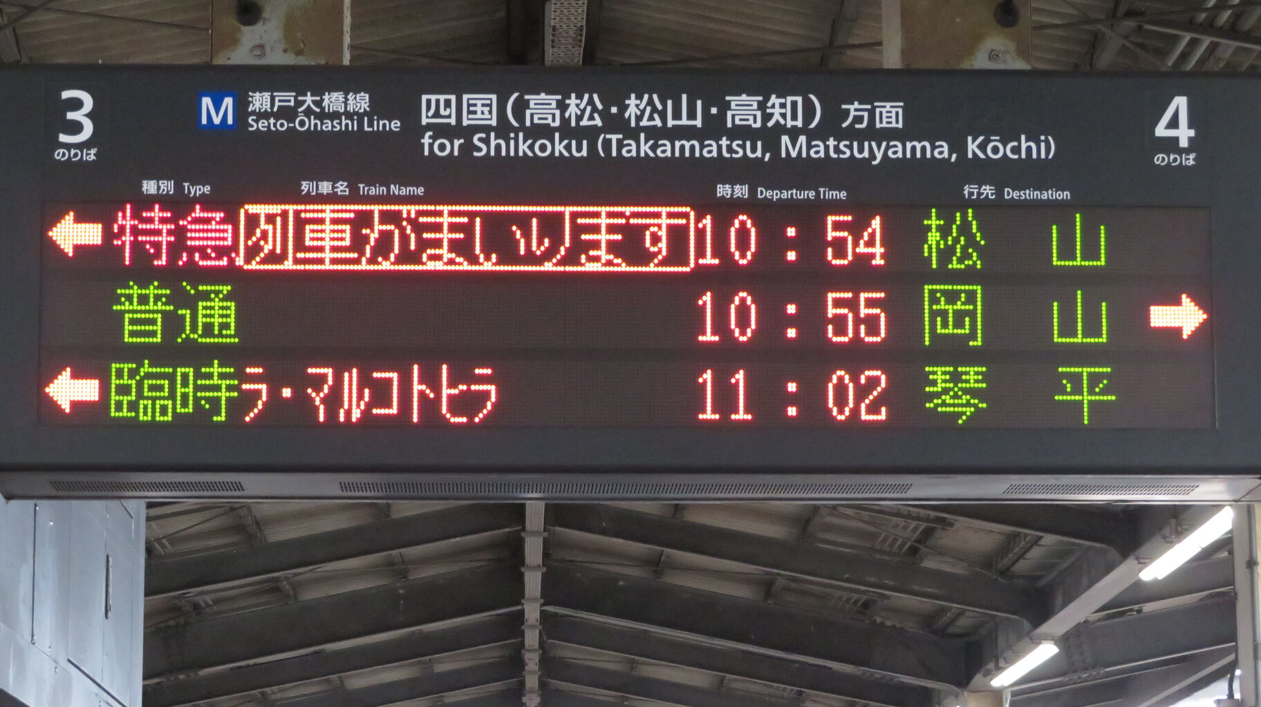 岡山駅の場合、臨時列車が入線する時は 電車であっても 「列車がまいります」 と表示されますが、児島駅では普通・快速電車と同様に 「電車がまいります」 と表示されます。