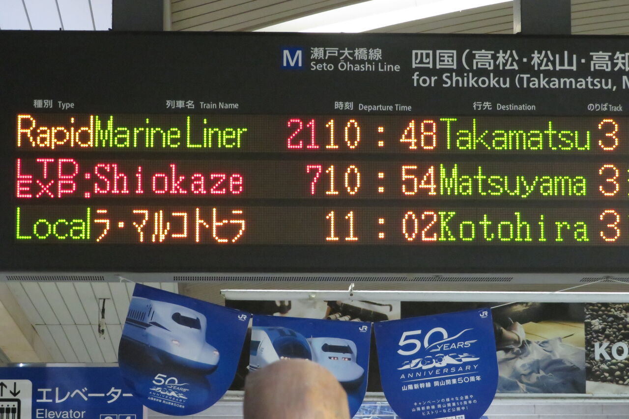 臨時の英語表示は 岡山駅だと 「Temporary」 ですが、 児島駅では なぜか快速を意味する 「Rapid」 だったんですよね。