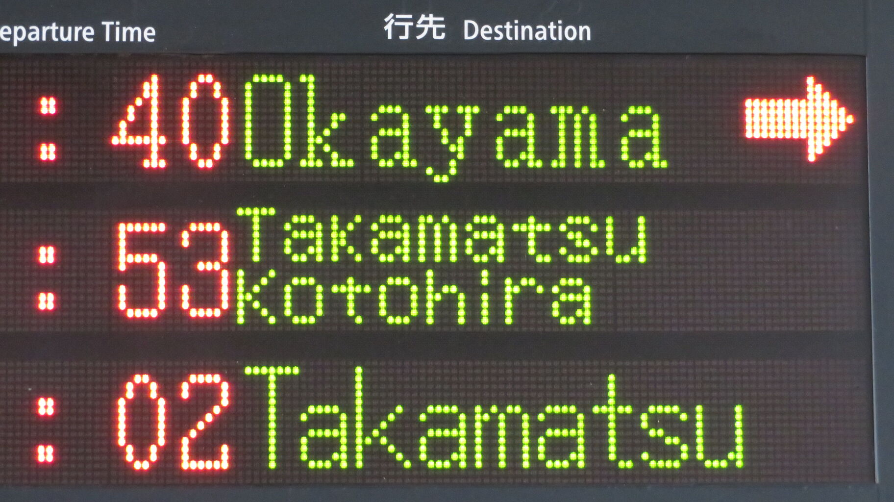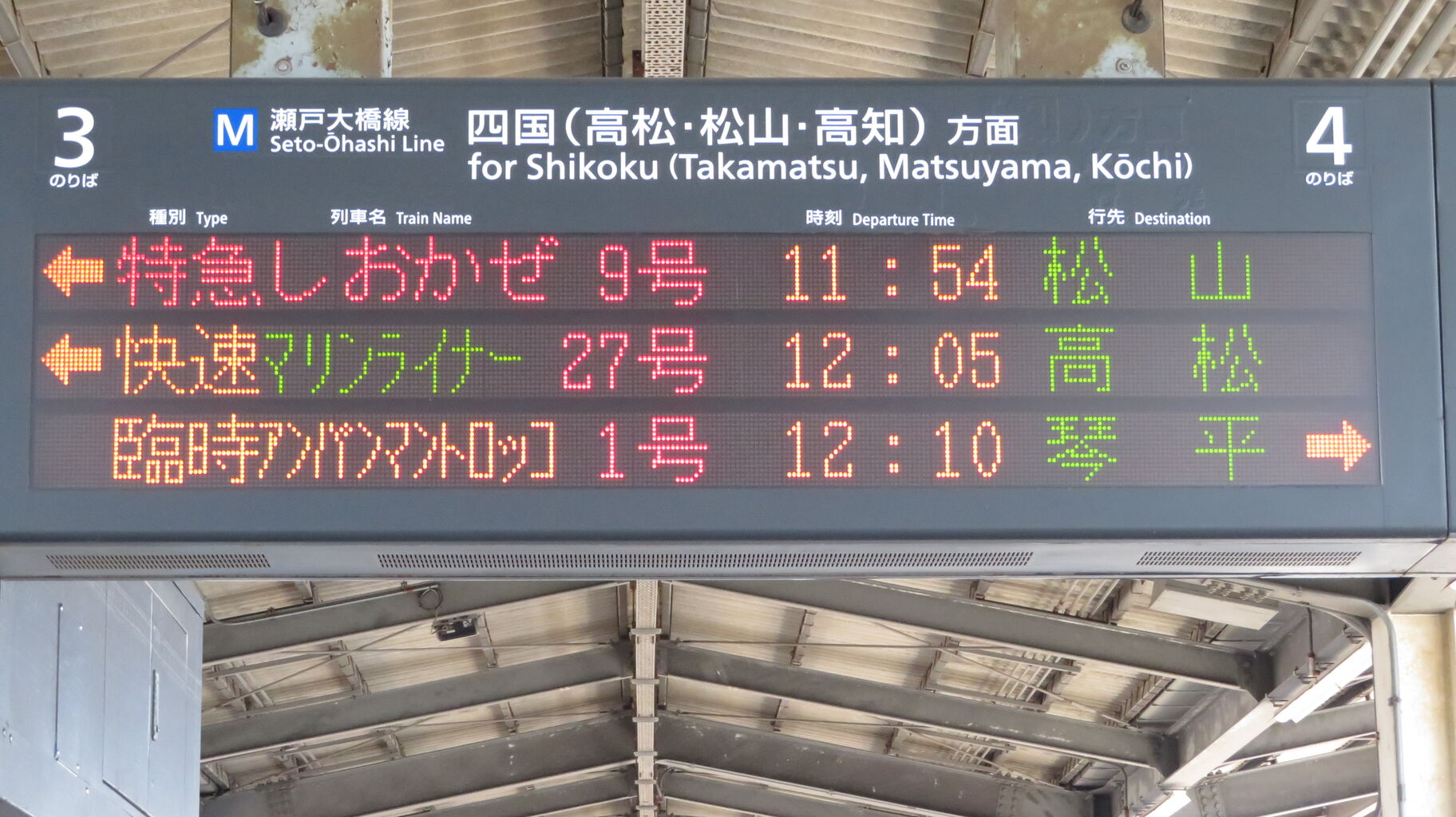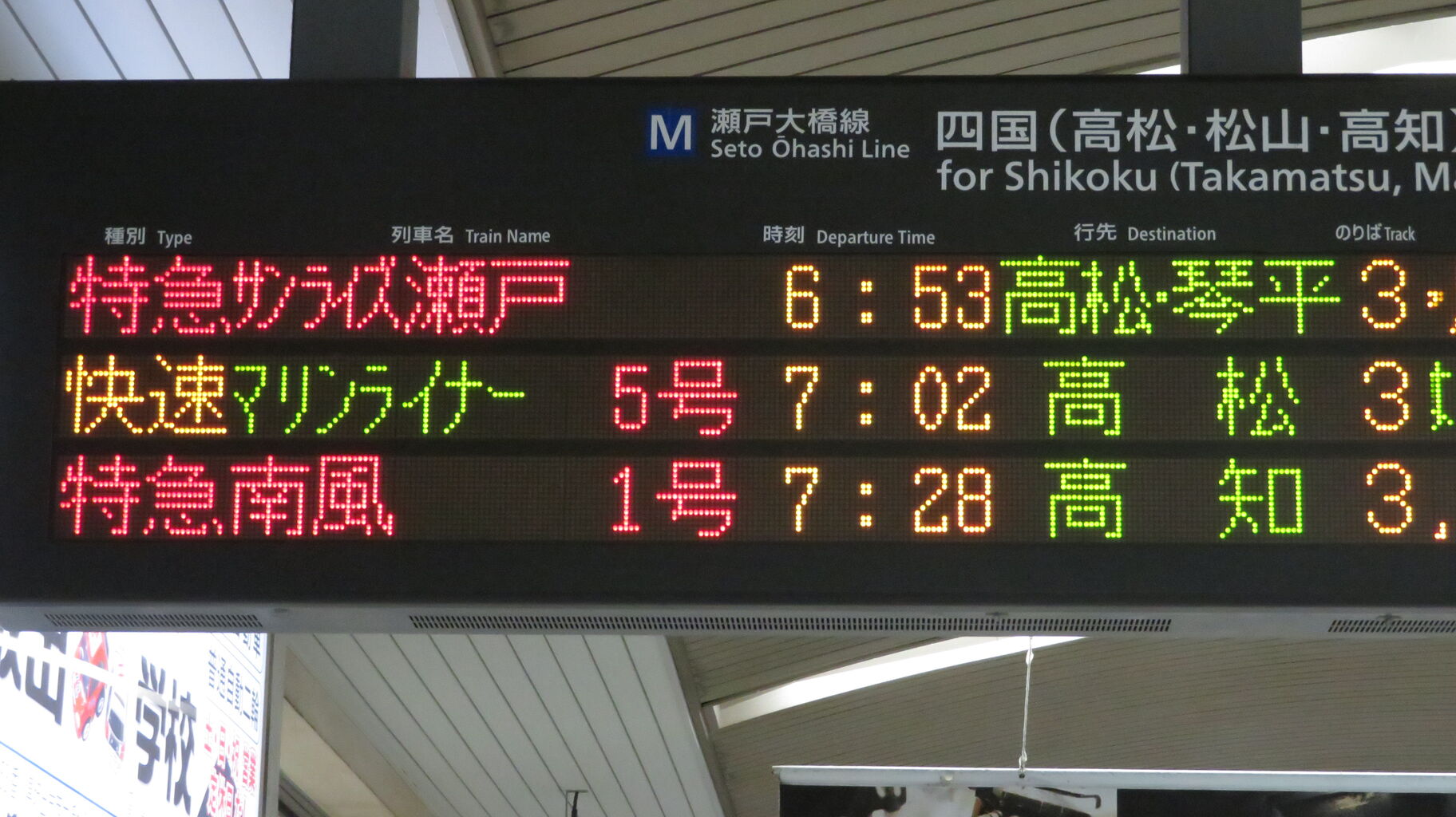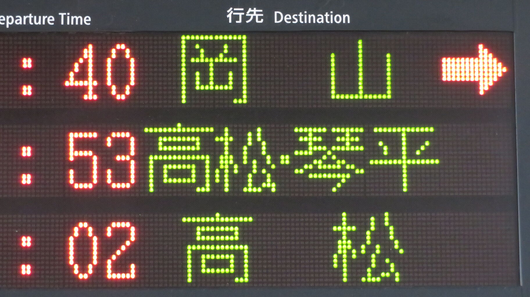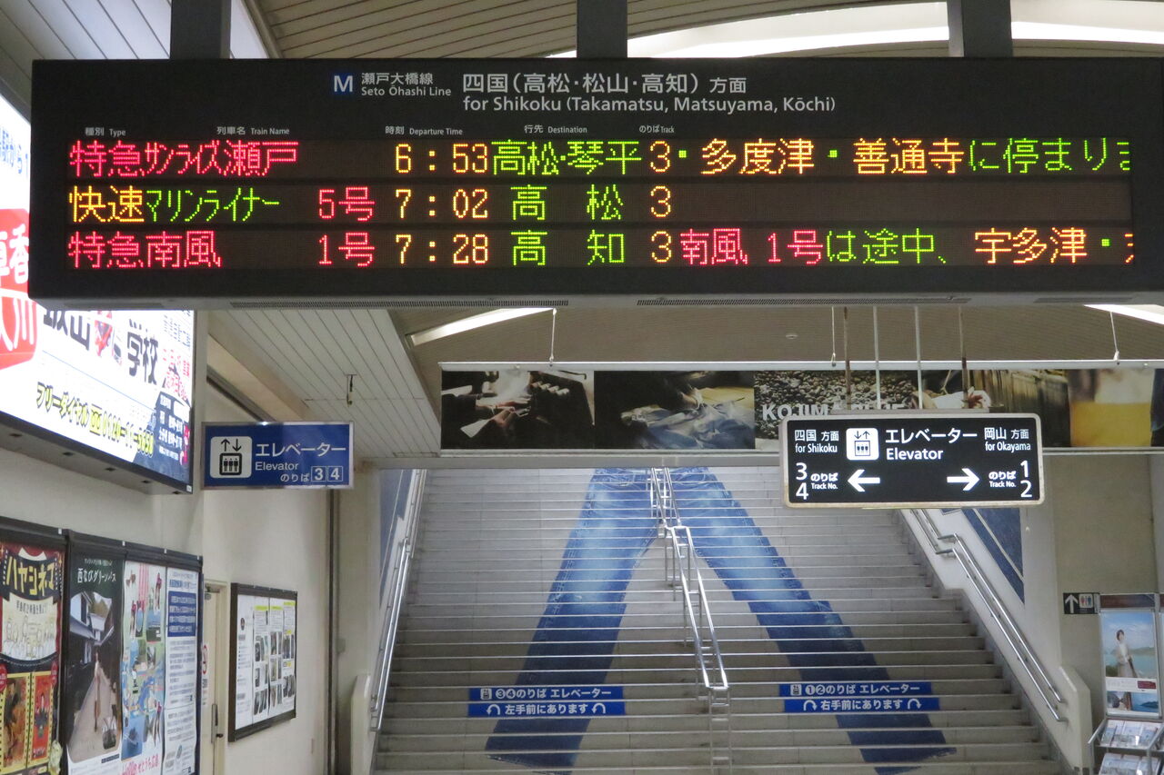 かつては岡山駅でも 「高松・琴平」 表示が出ていましたが、なぜかオレンジ色だったんですよね。
