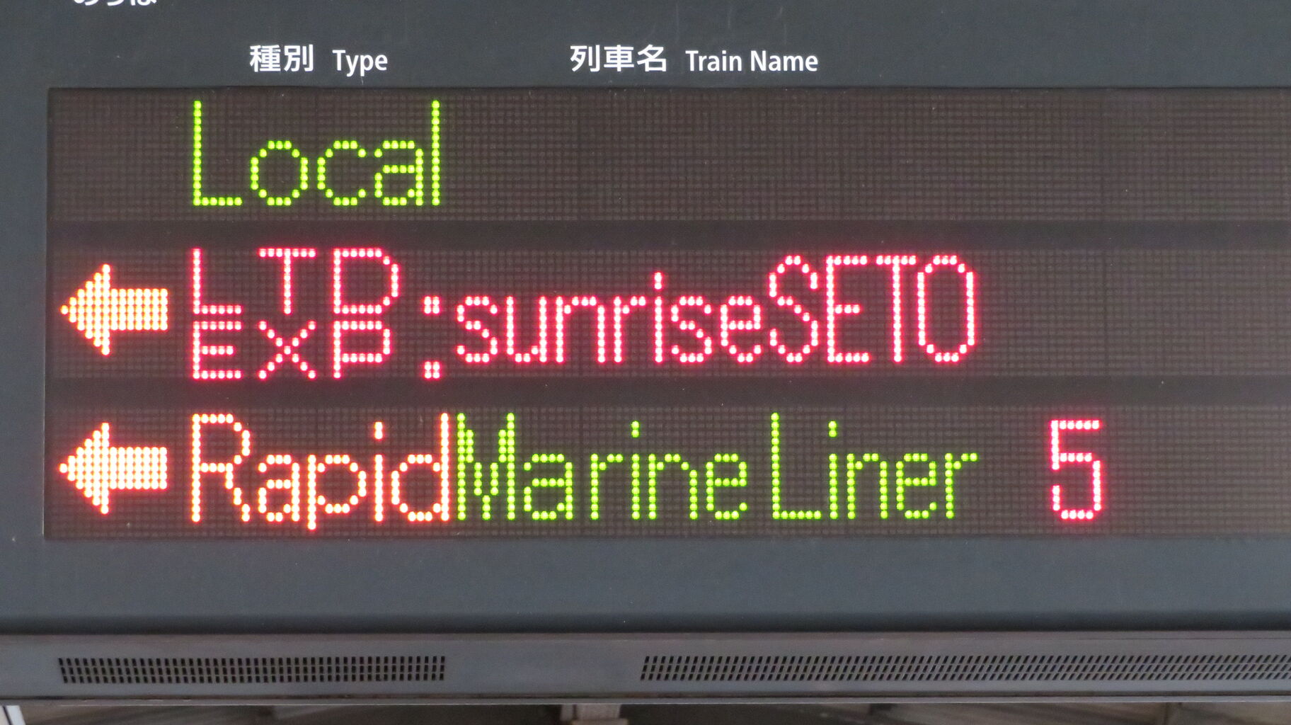 児島駅の表示を見る前に、岡山駅で撮影したサンライズ瀬戸 「琴平行き」 の表示を見ておきましょう。