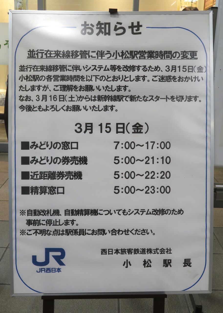 新幹線開業の前日(3月15日)、小松駅の みどりの窓口は17時で営業終了となります。