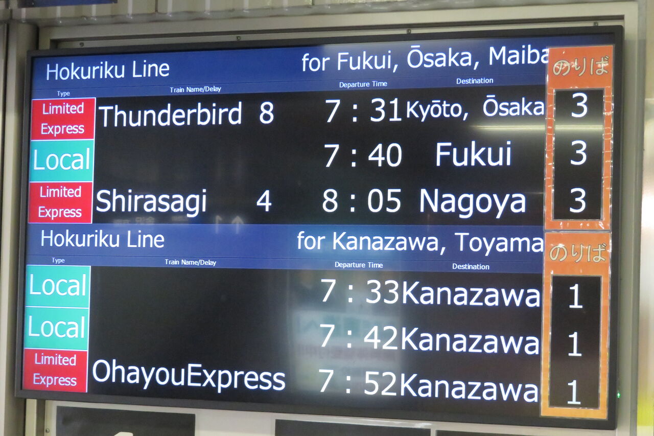 表示は、福井駅(ホーム・改札口)や敦賀駅(改札口)の発車標と同じです。
