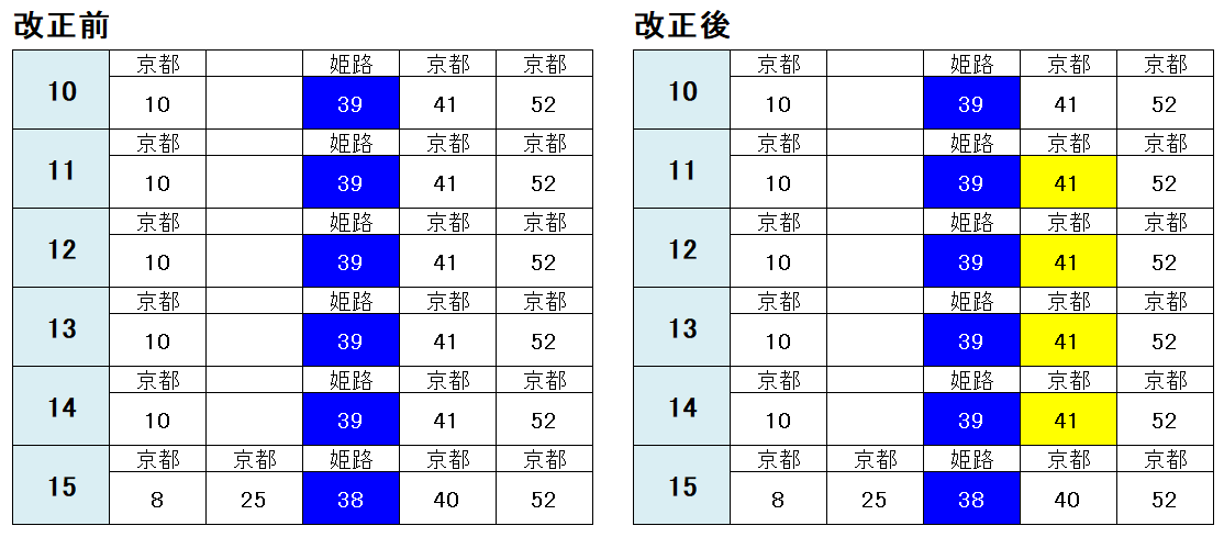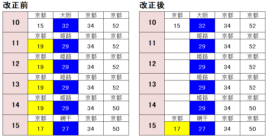 日中の時間帯、京都方面の平日ダイヤは 発車時刻や本数に変化がありません。
