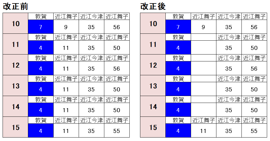 湖西線の時刻表を、改正前後で新旧比較してみました。
