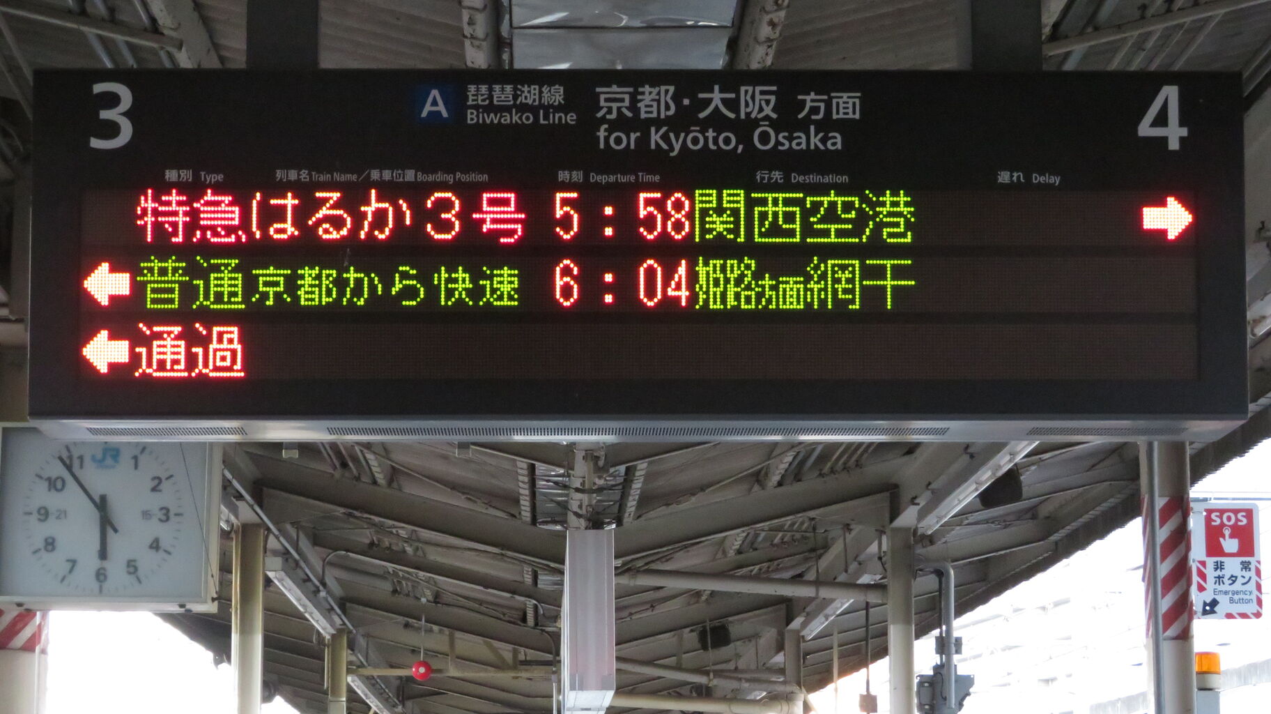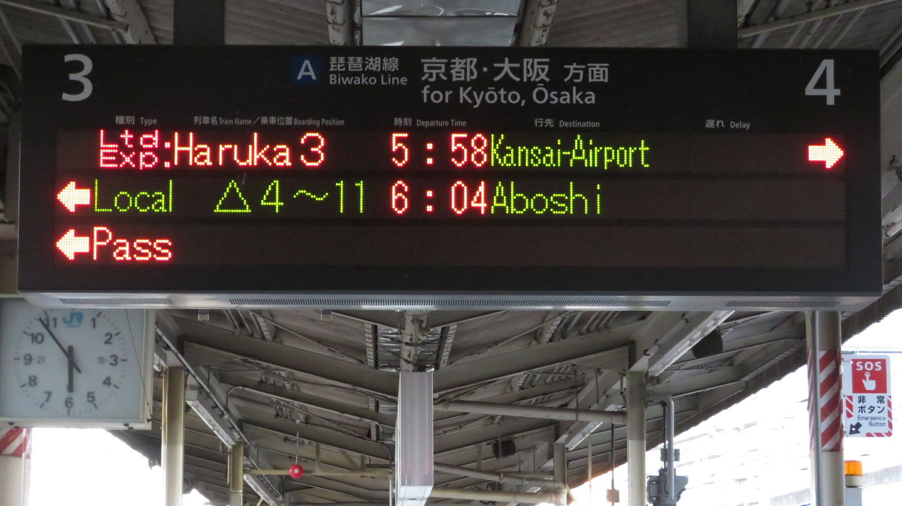 野洲から来るはるか号は3番のりばから発車しますが、当駅始発のはるか号は4番のりばから発車します。