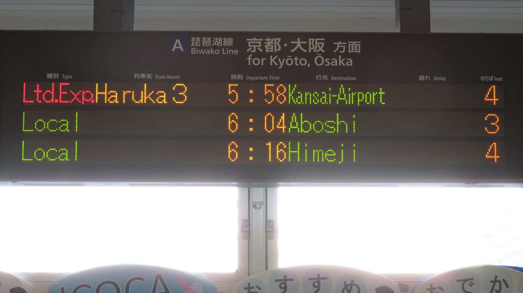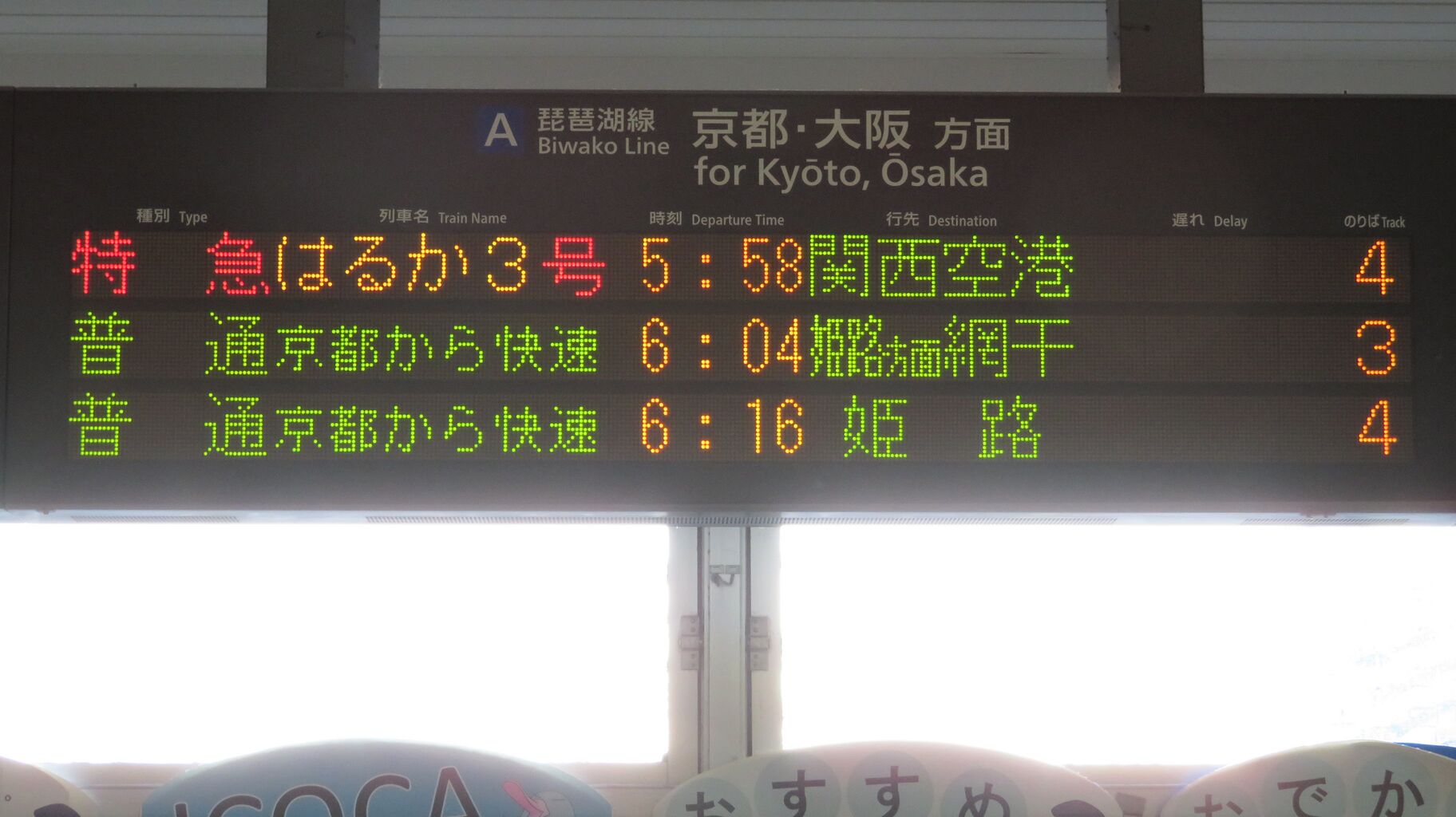 真ん中と下の段には、京都から快速となる普通電車の表示が出ていました。