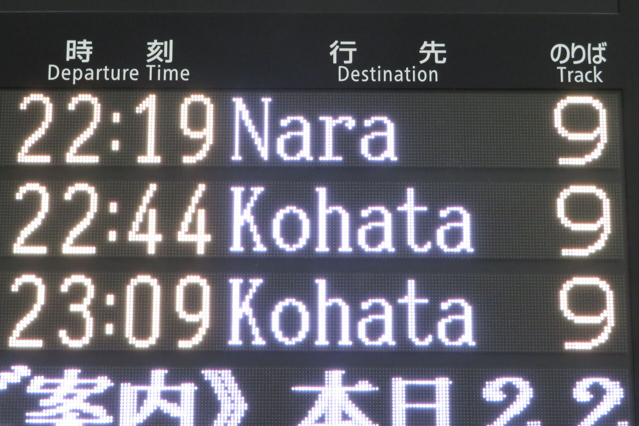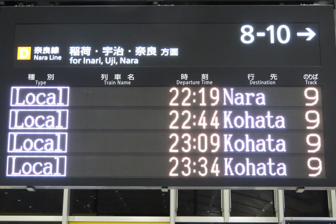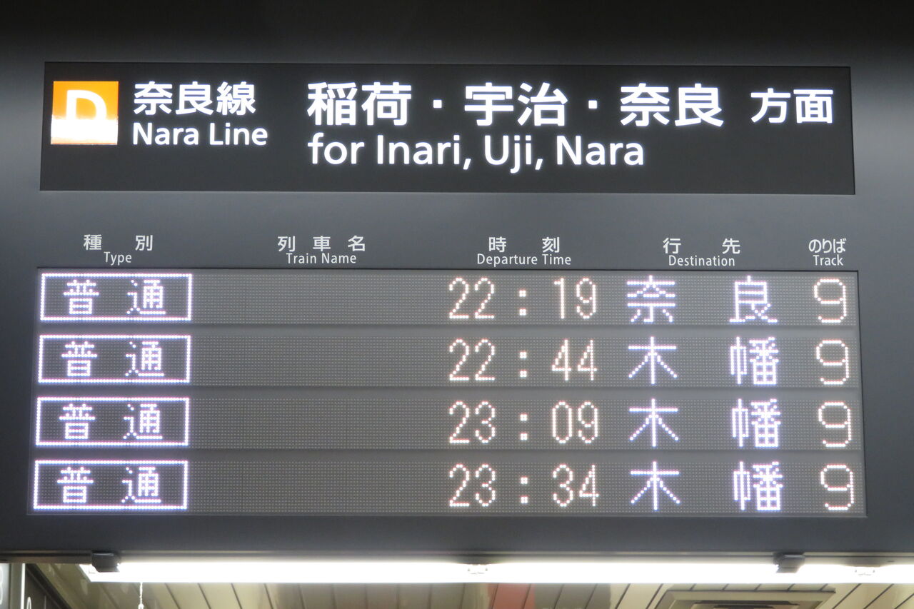 これにより、奈良22:39発と23:09発の京都行きが 「新田行き」 、京都22:44発、23:09発、23:34発、23:58発の奈良行きが 「木幡行き」 として運転されました。