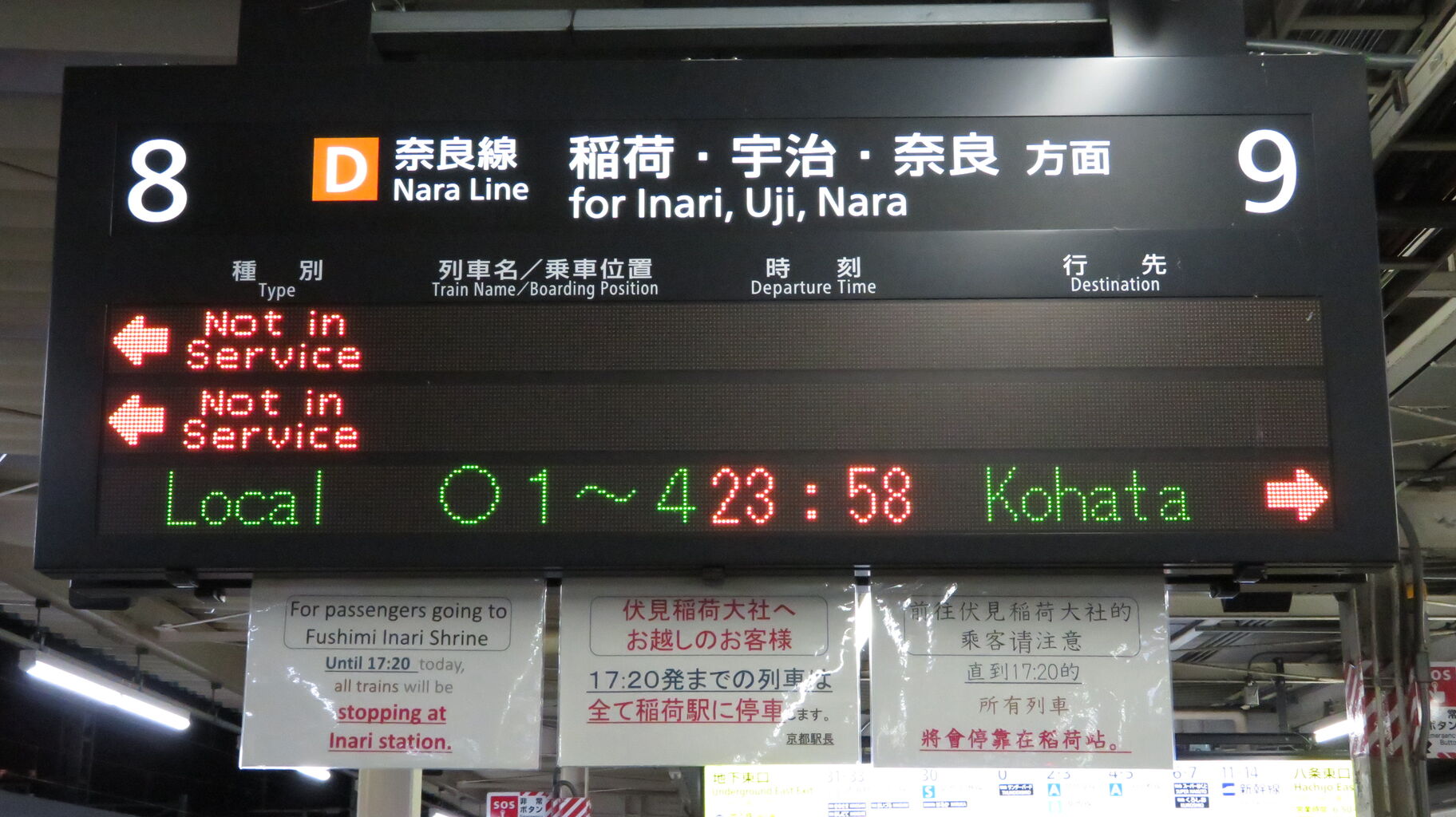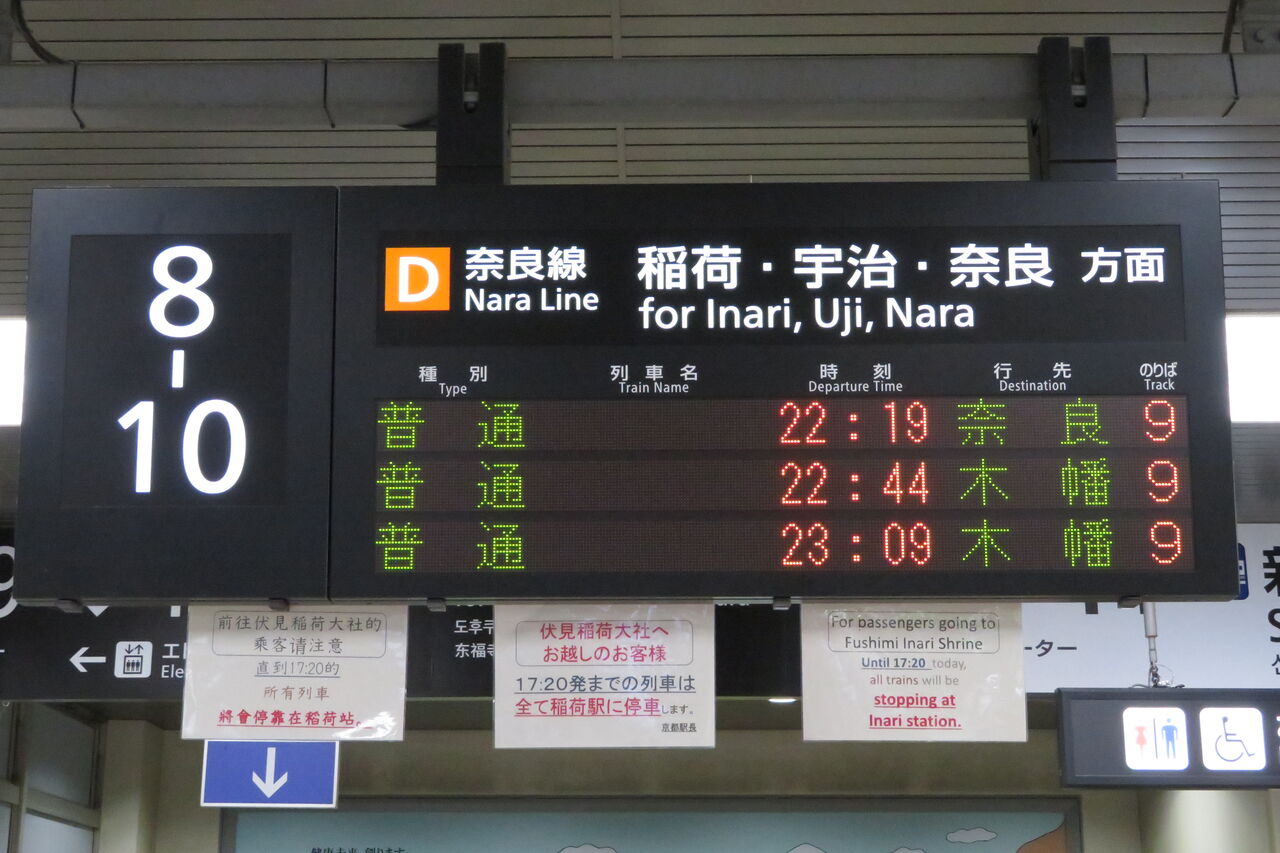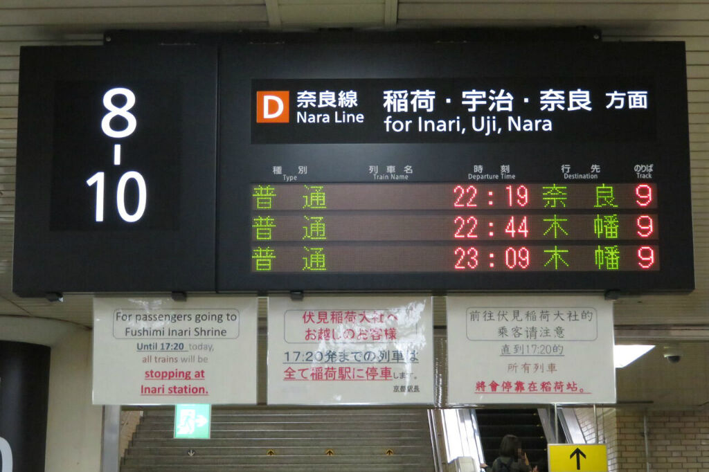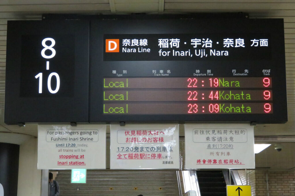 こちらは、JR奈良線ホームへ下りる階段・エスカレーターの手前にある発車標です。
