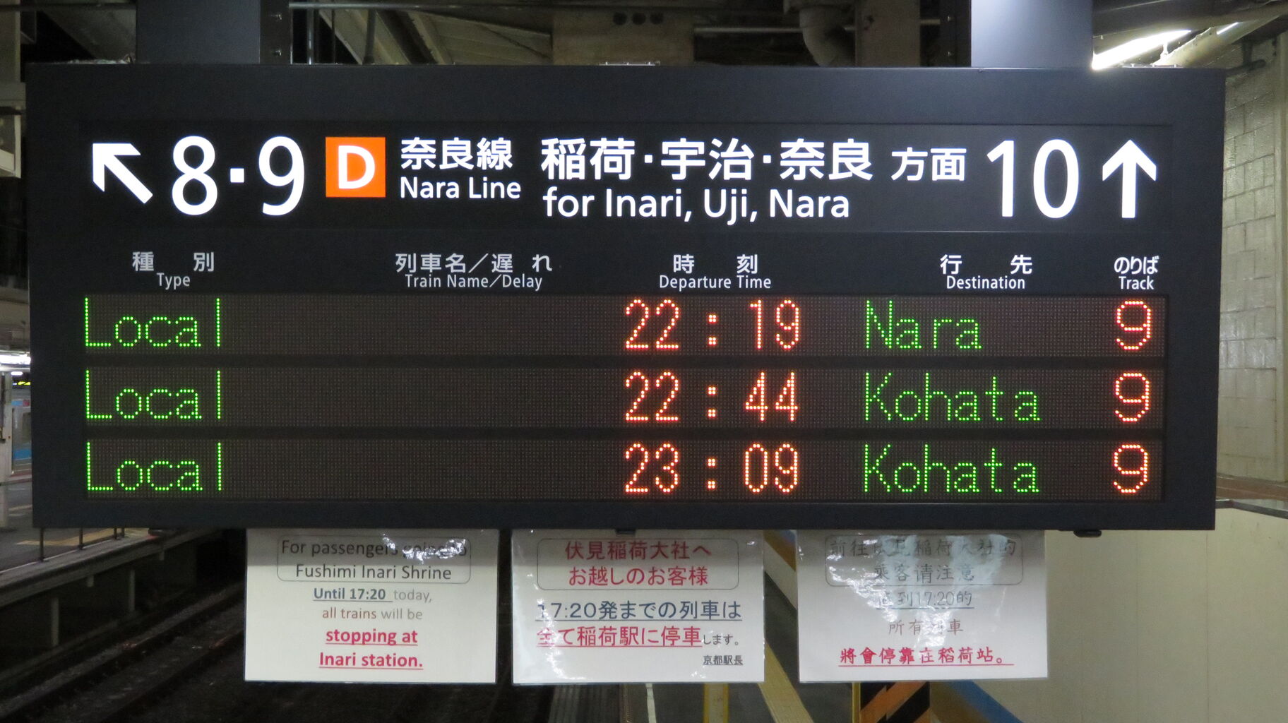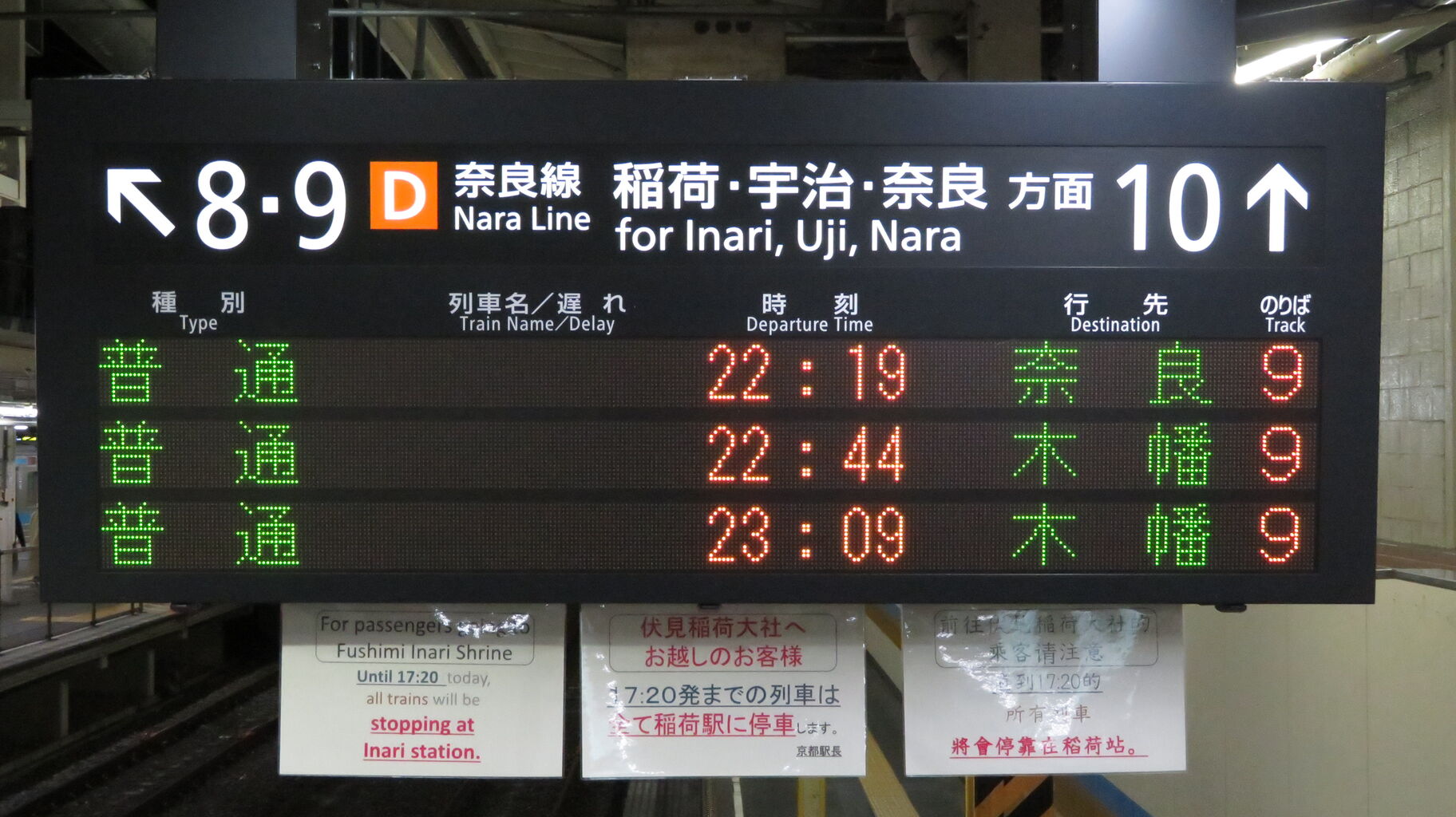隣のホーム・9番のりばから発車する奈良行き・木幡行きの案内が表示されています。